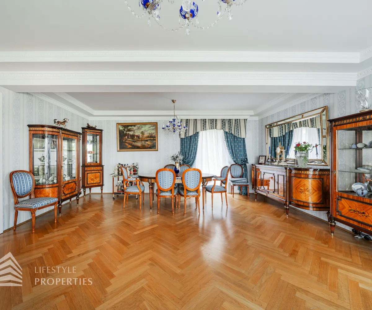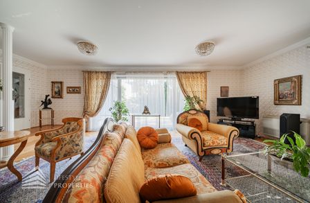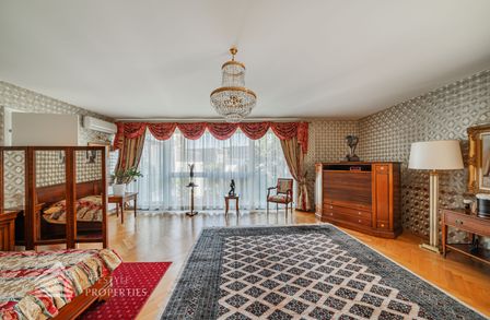 Die Villa befindet sich auf einem knapp 700 m 2 großen Grundstück und überzeugt mit einer Wohnfläche von ca. 420 m 2 und einer unglaublichen Gesamtnutzfläche von ca. 645 m². Sie erstreckt sich über 1 Erd-, 2 Ober- und 2 Untergeschosse und teilt sich in 6 Schlafzimmer, 4 Badezimmer, Ankleideräume, ein Wohnzimmer, sowie ein Esszimmer, eine Küche, ein Arbeitszimmer/Bibliothek, einen Wintergarten, einen Billardraum und einen Fitnessraum mit Sauna auf. Ebenso verfügt die Immobilie über 3 PKW Stellplätze in der Garage, die über das 2. Untergeschoß direkt angebunden ist. Jede Etage ist mit dem hauseigenen Lift und einer wunderschönen Holztreppe zu erreichen. Die Immobilie ist Teil einer Gebäudeanlage, die über weitere Einrichtungen zur freien Nutzung verfügt. Einerseits haben Sie Zugang zu einem weiteren Fitnessraum, aber auch zu einem Indoor Schwimmbecken mit Sauna und Dampfbad, sowie zu einem einladenden Außenbereich, der zum Verweilen einlädt. Die gesamte Immobilie verfügt über eine Alarmanlage und elektrische Außenjalousie. Alle Nassräume, der Flur und die Küche sind mit hochwertigen Fliesen ausgestattet. In diesen Räumlichkeiten haben Sie überall Fußbodenheizung. Alle weiteren Räume sind mit wunderschönem Fischgrätenparkett ausgestattet. In den meisten Räumlichkeiten befinden sich außerdem Klimageräte.