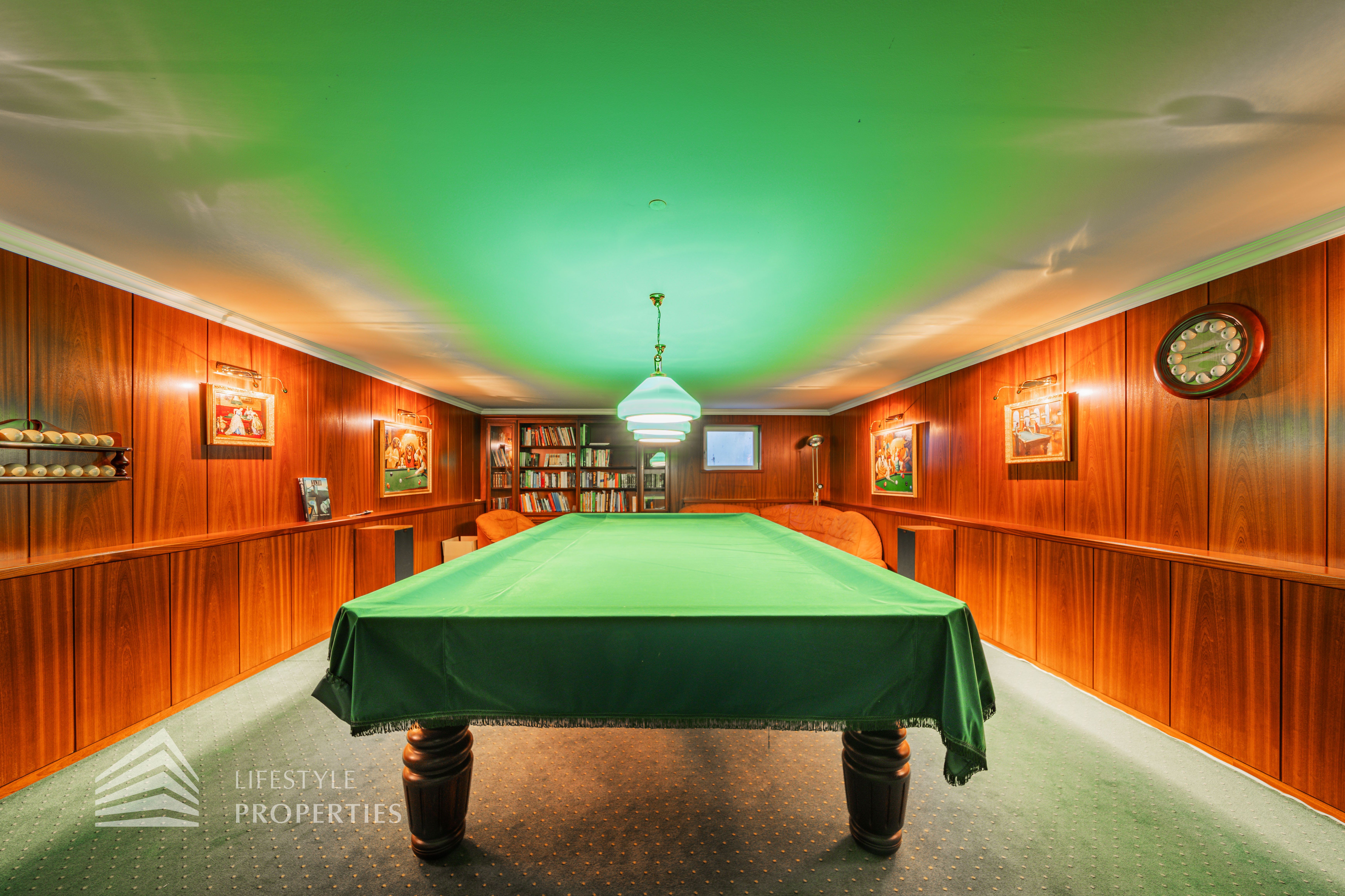 Mit dem Lift, aber auch über die Treppe, gelangen Sie in das 1. Untergeschoß. Hier finden Sie linkerhand einen ca. 42 m 2 großen Fitnessraum, der durch eine Spiegelwand und eine Ballettstange hervorsticht. Ebenso ist hier Platz für eine Sitzecke, die zum Verweilen mit Freunden einlädt. Direkt anschließend gelangen Sie zu der hauseigenen Sauna mit Dusche und WC. Rechterhand vom Lift finden Sie einen Billardraum, mit einem original russischen Billardtisch aus Marmor. Dieser Raum besticht durch hochwertiges Kirschholz an den Wänden. Weiteres befindet sich in dieser Etage auch ein Werkraum, der das Heimwerkerherz höher schlagen lässt. Außerdem befindet sich hier auch eine Toilette mit separatem Handwaschbecken.