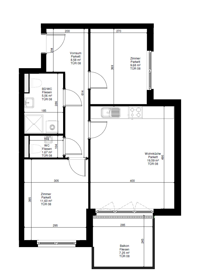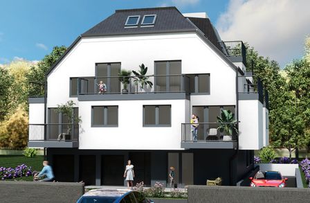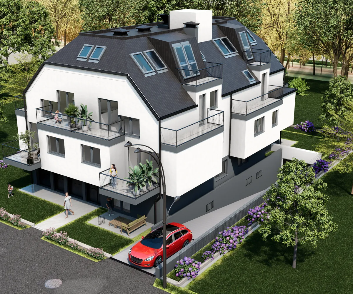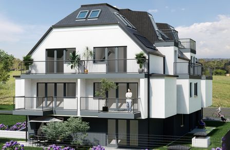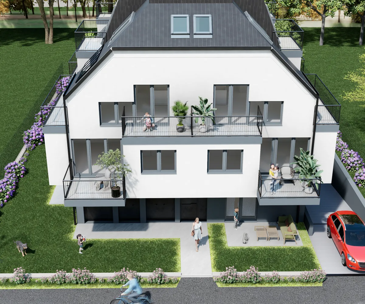 Die Wohnung befindet sich im ersten Stock, der bequem mit dem Aufzug erreichbar ist, und erstreckt sich über eine großzügige Wohnfläche von etwa 56 m². Sie gliedert sich in eine Wohnküche, zwei Zimmer, ein Bad mit WC und ein separates Gäste-WC. Zusätzlich verfügt die Wohnung über einen 7 m² großen Balkon. Die Hauptbereiche der Wohnung sind mit hellem Parkettboden ausgestattet, während die Nassräume moderne Fliesen aufweisen. Die Beheizung erfolgt mittels einer Luftwärmepumpe. Fußbodenheizung, dreifach verglaste Kunststofffenster und Terrassentüren mit außenliegendem Sonnenschutz sind weitere Annehmlichkeiten. Das Objekt verfügt über 6 Garagenplätze, die zusätzlich zum Preis von 45.000 pro Platz erworben werden können.
