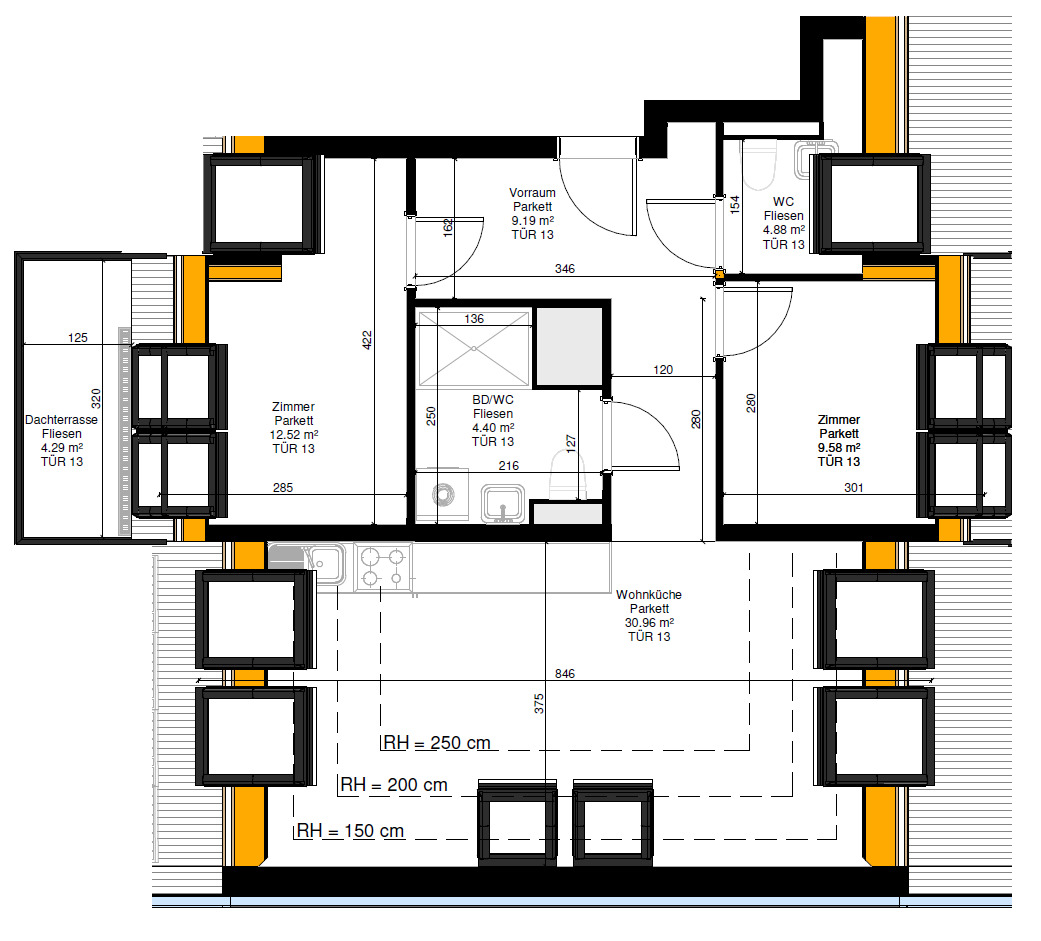 Beim Betreten der Wohnung gelangen Sie in einen Vorraum, welcher zentral alle Räumlichkeiten miteinander verbindet. Geradeaus finden Sie eine großzügige Wohnküche mit ca. 31 m². Hier haben Sie genügend Platz für einen gemütlichen Wohn- und Essraum. Am rechten Ende des Eingangsbereichens befindet sich das ca. 13 m² große Schlafzimmer, welches über eine traumhafte ca. 4 m² große Dachterrasse, die zum Entspannen an der frischen Luft einlädt, verfügt. Am Flur entlang, liegt ein ca. 10 m² großes Zimmer, welches ebenfalls über eine Dachterrasse verfügt. Dieses bietet sich optimal als Arbeits- oder Kinderzimmer an. Ein modern ausgestattetes Bad mit begehbarer Dusche, Waschtisch, WC und Waschmaschinenanschluss sowie ein Gäste-WC können ebenfalls über den Flur erreicht werden.