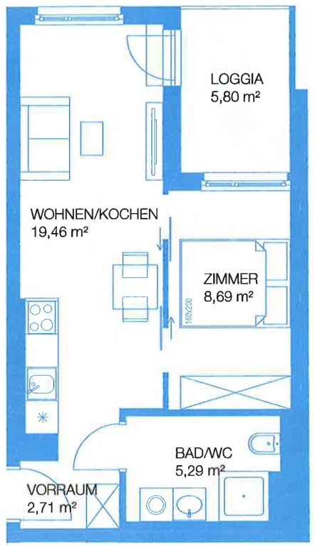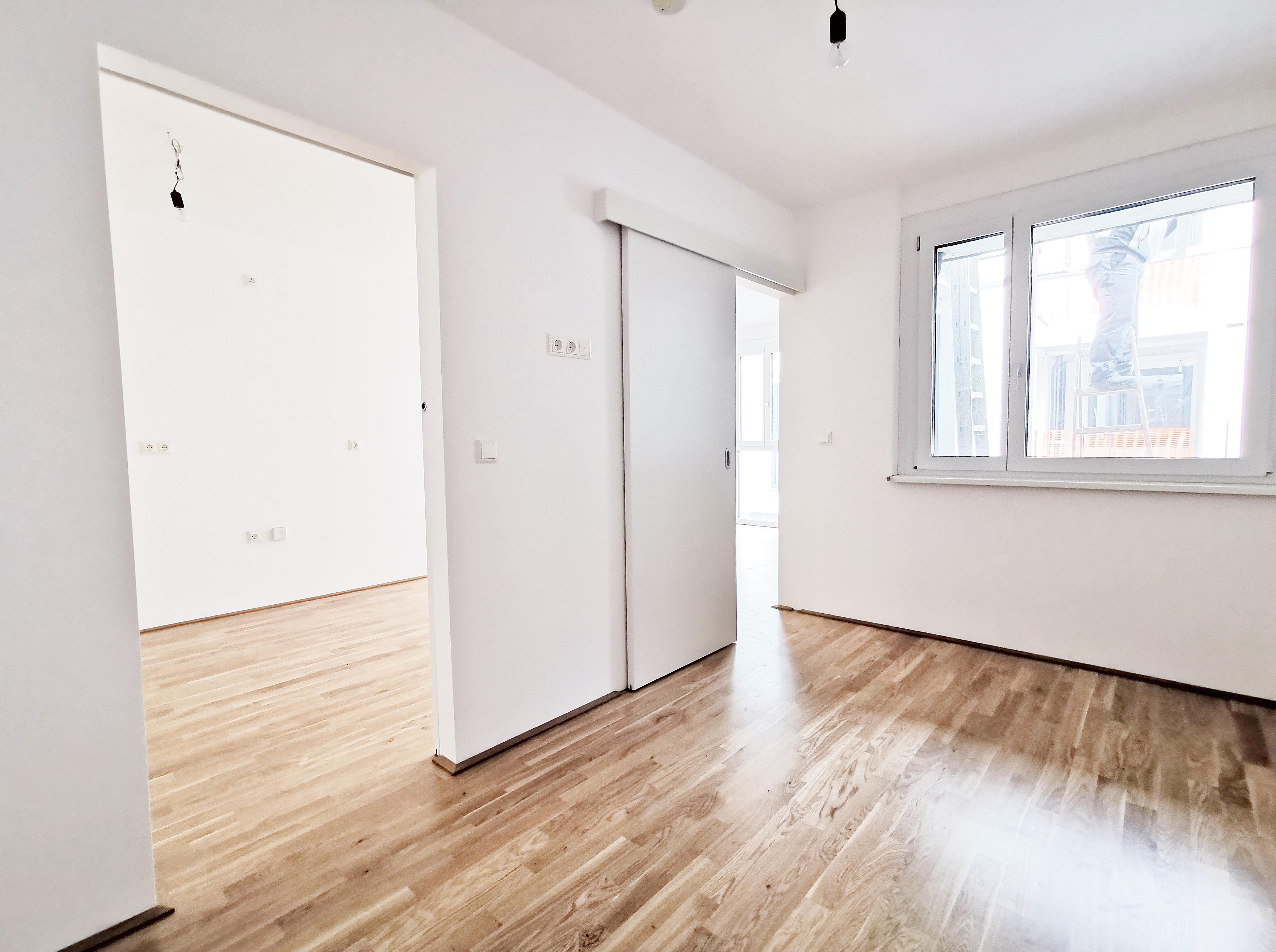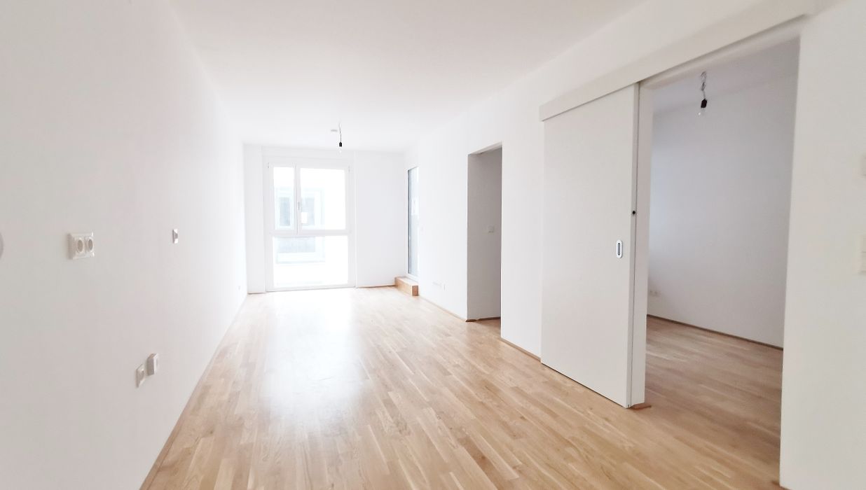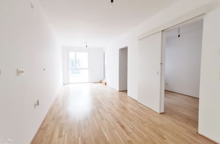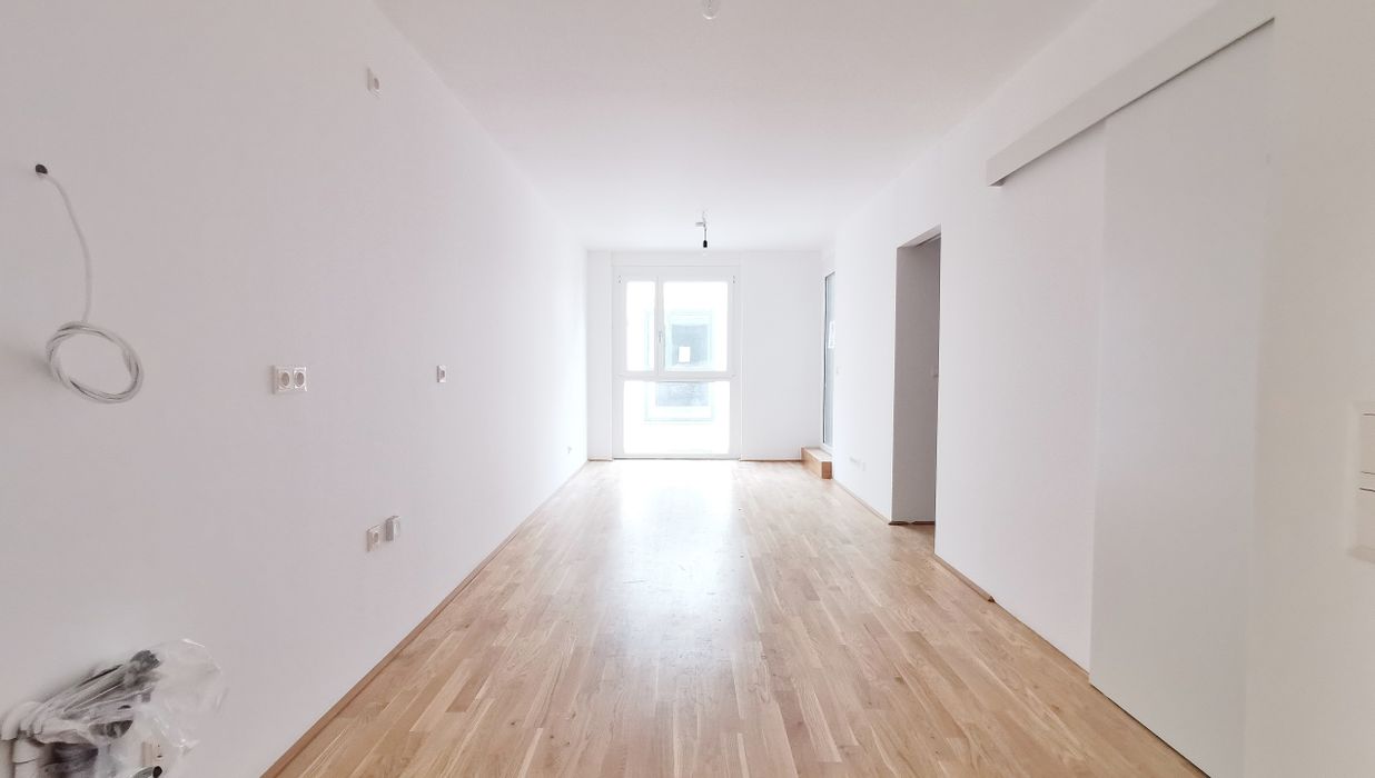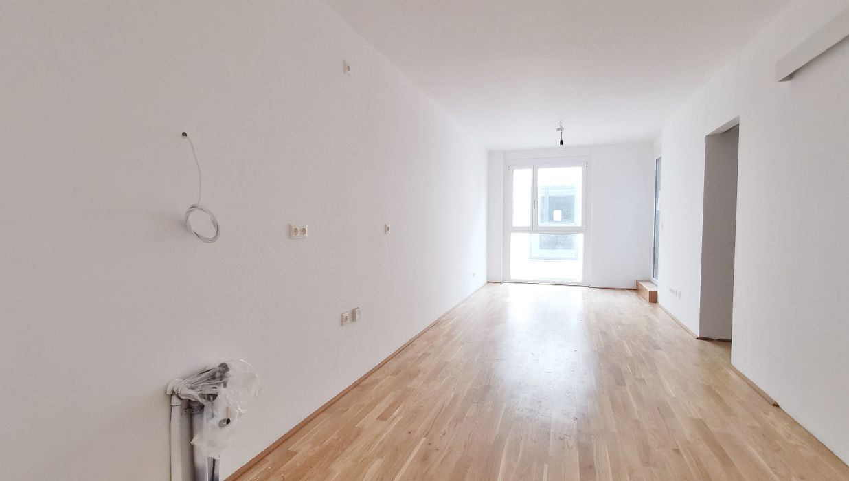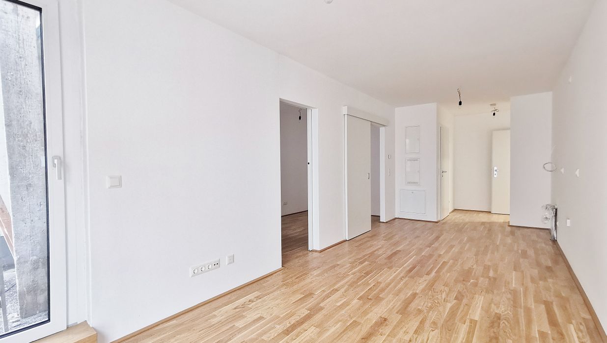 Vom Vorraum gelangt man in den offenen Wohnraum mit 19 m² in dem sich auch eine vollausgestattete Küche befindet. Über das Wohnzimmer ist die großzügige Loggia mit 5,8 m² begehbar - welche Platz für einen Tisch oder Liegestühle bietet.