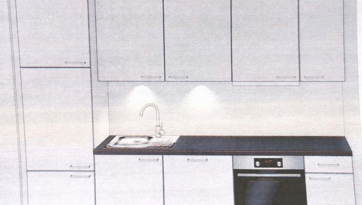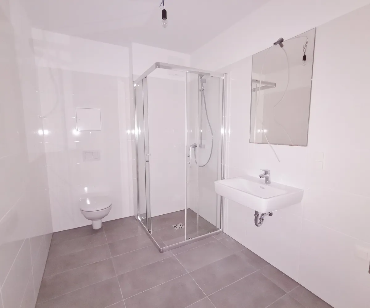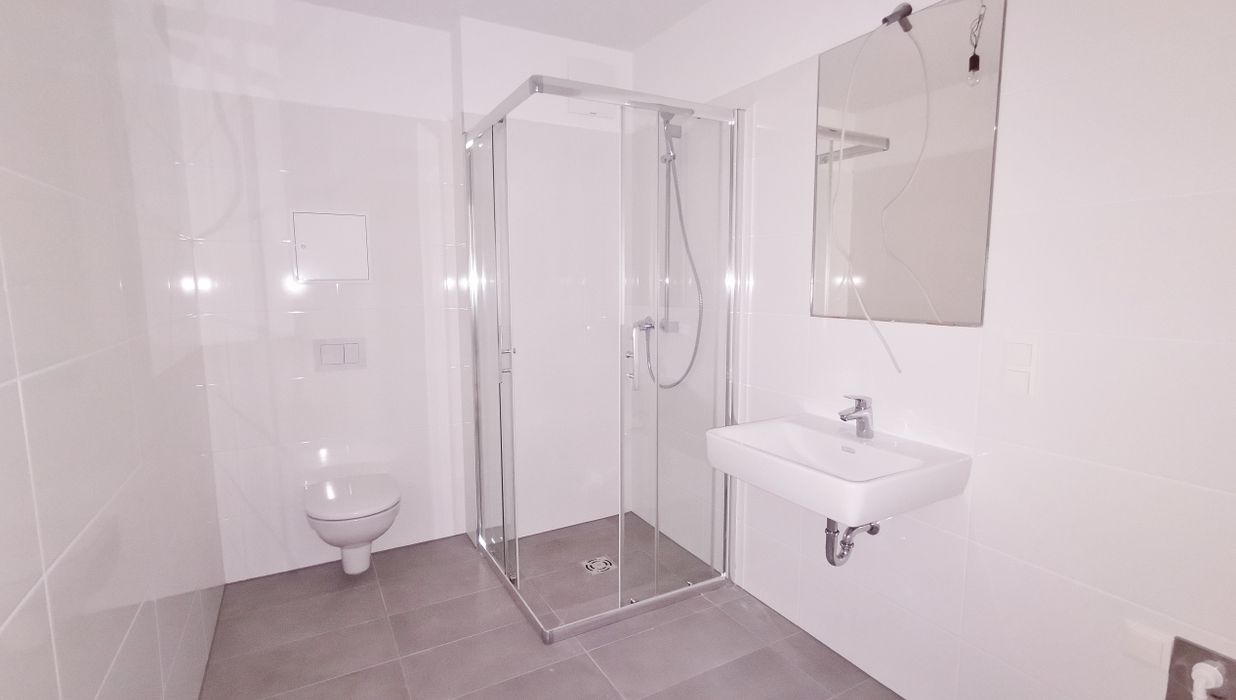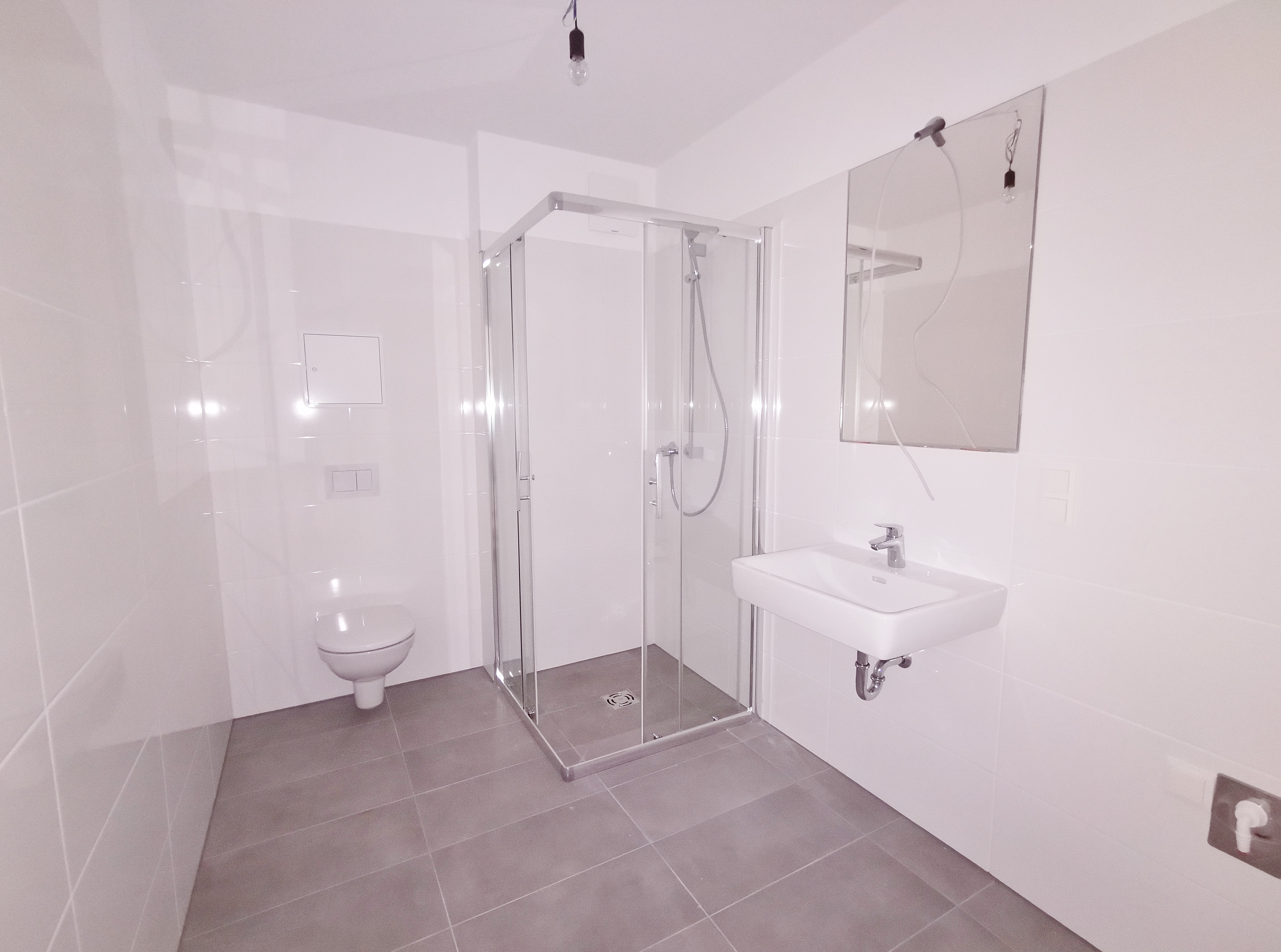 Im Schlafzimmer ist genügend Raum für ein Doppelbett und einen Kleiderschrank. Das moderne Badezimmer ist mit hellgrauen Boden- und weißen Wandfliesen und einer ebenerdigen Dusche ausgestattet. Eine Glasduschwand ist bereits verbaut. Neben dem Platz für die Waschmaschine können zudem Regale für Stauraum aufgestellt werden.