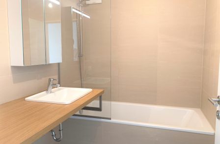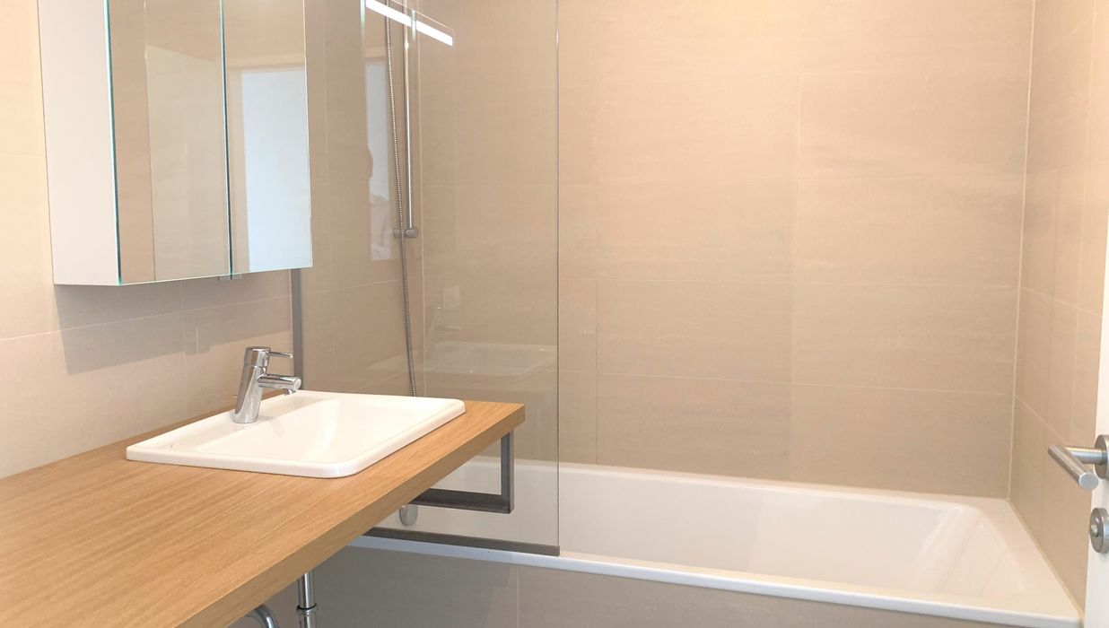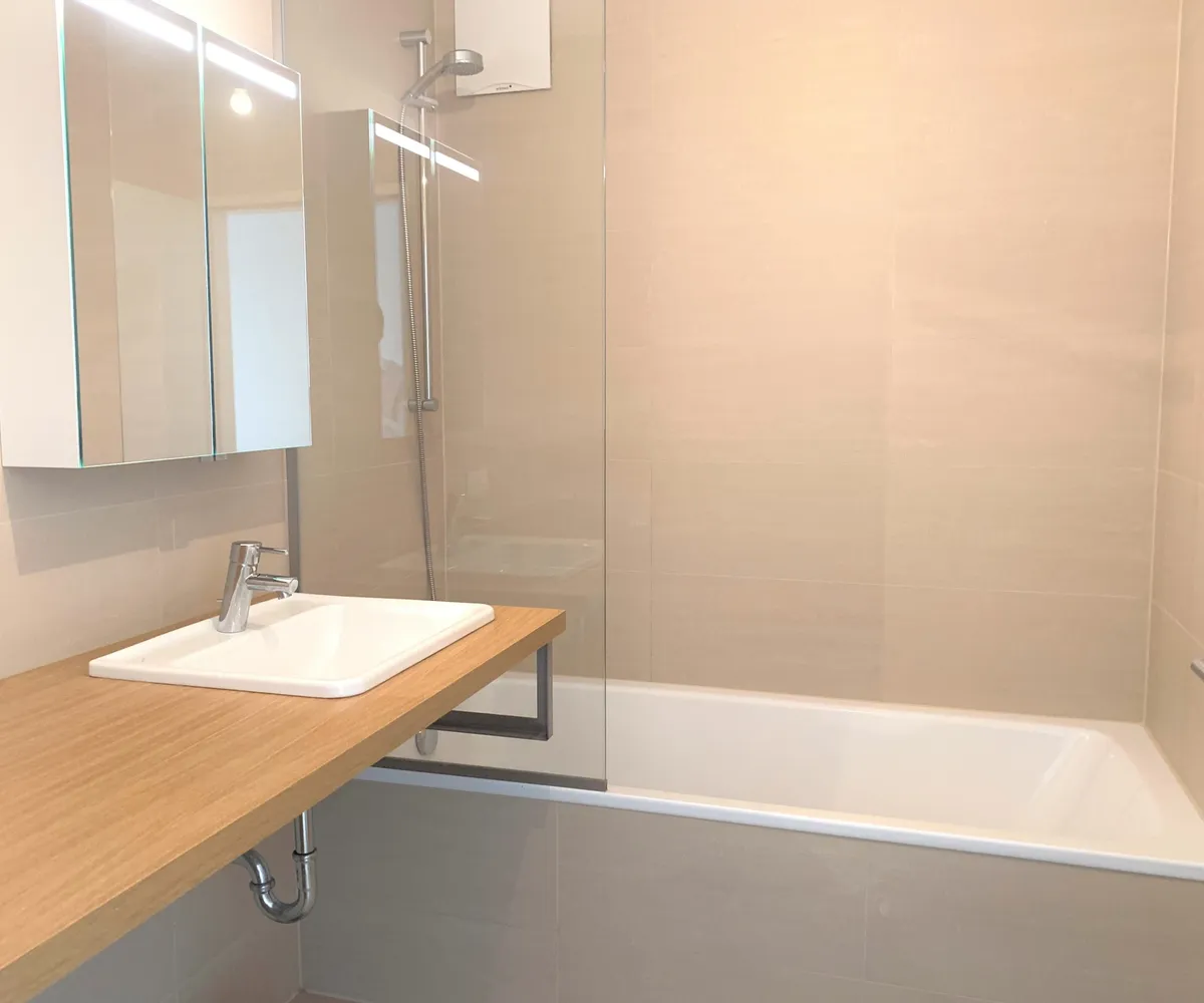 - Badezimmer mit Badewanne und Waschmaschinenanschluss