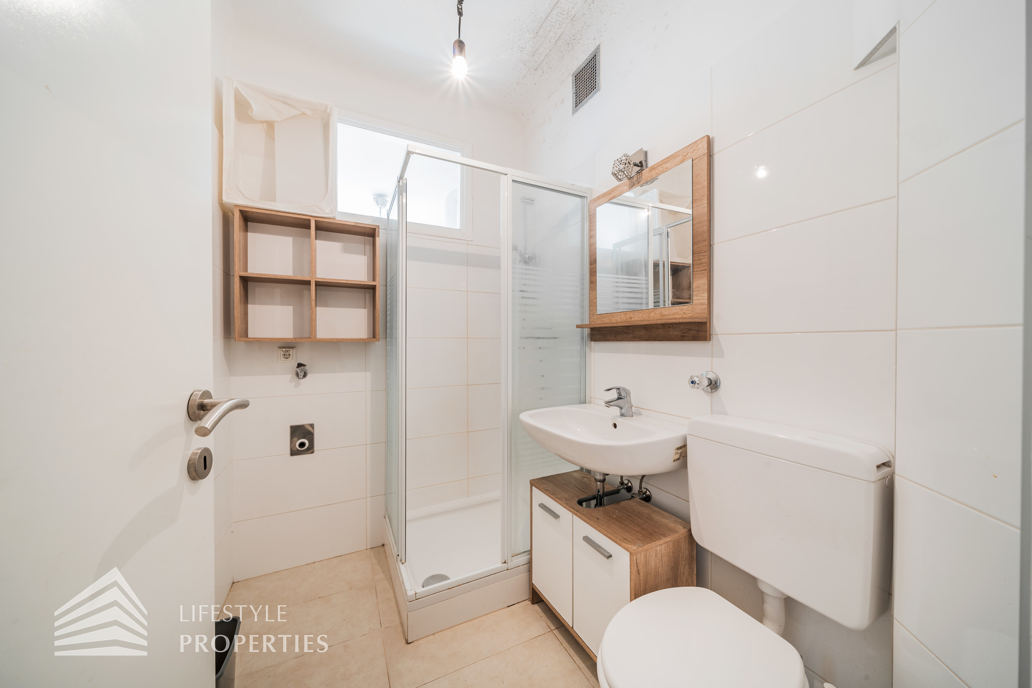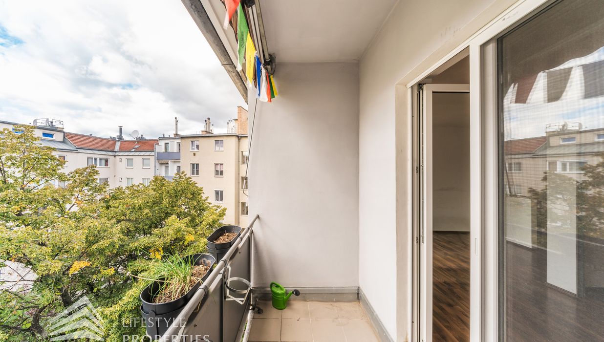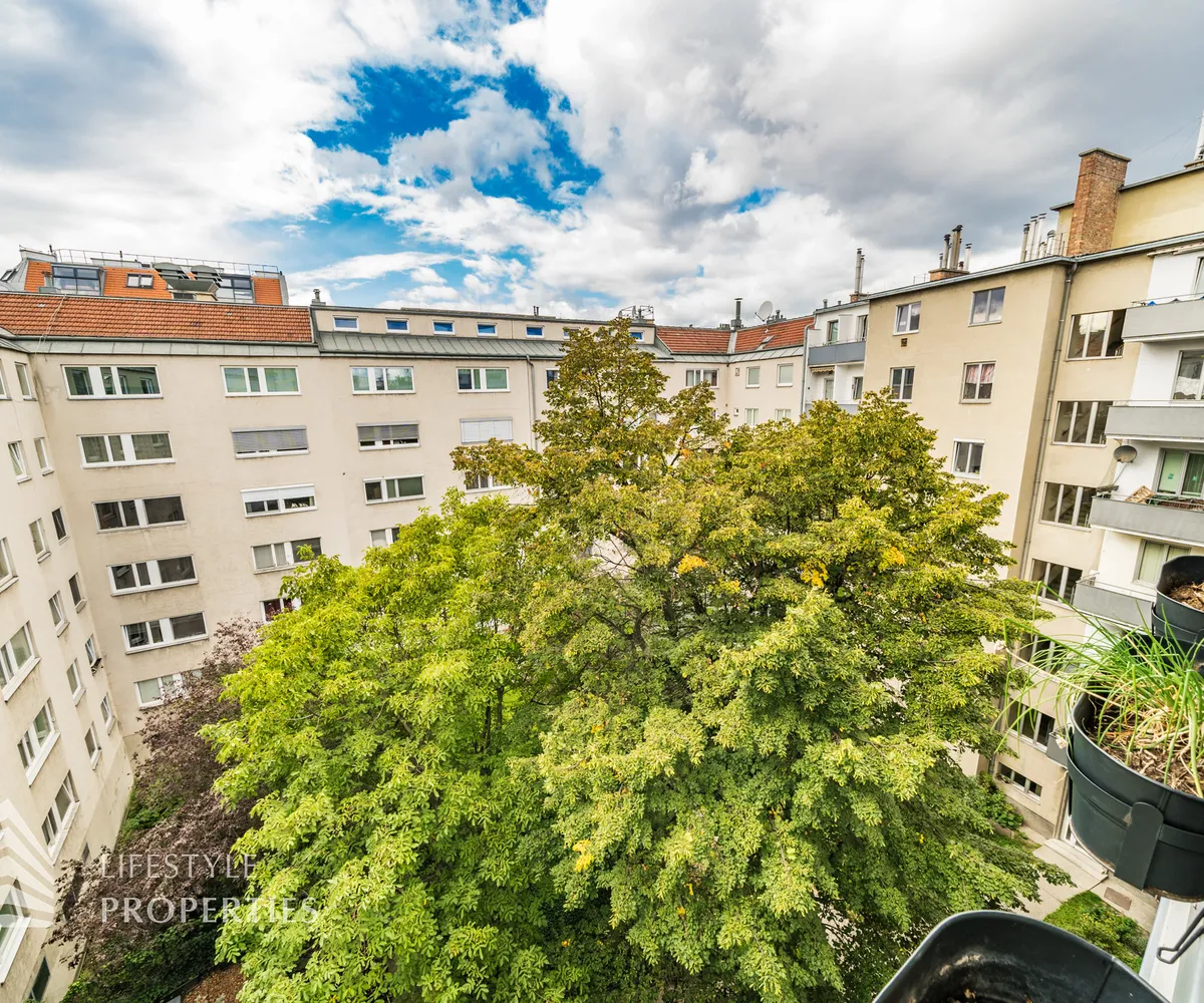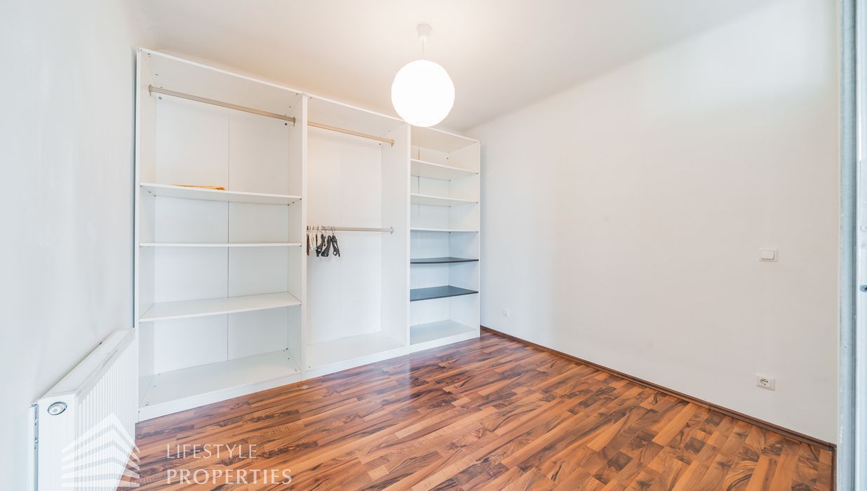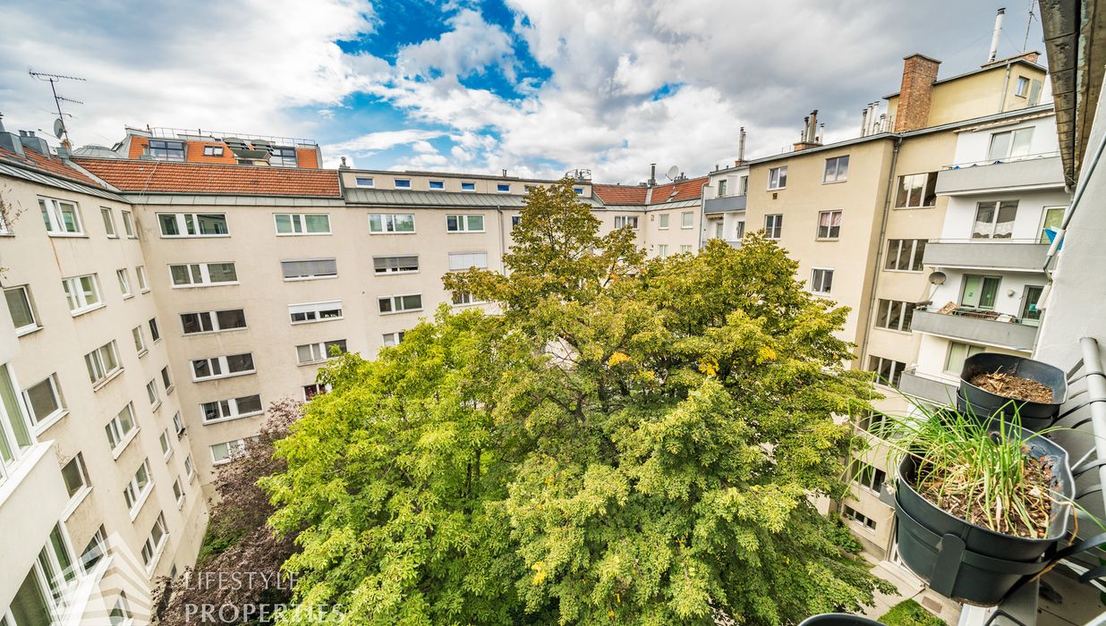 Die Räumlichkeiten der ca. 56 m² großen, charmanten Wohnung, welche sich im fünften Stock ohne Aufzug befindet, sind mit ansprechenden Laminat verlegt und Vorzimmer, Badezimmer und Küche geschmackvoll verfliest. Alle Wände wurden in neutralem weiß gestrichen. Vom Vorzimmer, welches mit einem Schuhschrank und einem großen, deckenhohen Regal ausgestattet ist, gelangen Sie rechter Hand ins Badezimmer. Darin befindet sich eine Dusche, das Waschbecken mit Spiegel und Unterschrank, die Toilette, ein Waschmaschinenanschluss sowie ein Hängeschrank, farblich harmonisch miteinander abgestimmt. Am Ende des Ganges kommen Sie ins Schlafzimmer, welches einen offenen Kleiderschrank über die gesamte Rückwand aufweist. Die offen gestaltete Wohn-Küche ist ein absolutes Highlight dieser Wohnung. Durch zwei Fenster und die Glastür, welche zum Balkon führt, wirkt der Raum hell und behaglich. Hier herrscht genügend Platz um zu kochen, zu essen und sich zu erholen, ohne den Raum oder die Gesellschaft verlassen zu müssen. Auch bei der Küche wurde viel Wert auf abgestimmte Farben gelegt, ausgestattet mit einen Herd, einen Geschirrspüler, einen Kühlschrank sowie eine Spüle mit Ober- und Unterschränken. Der Balkon blickt in den ruhigen Innenhof und bietet genügend Platz im Freien um verweilen zu können.