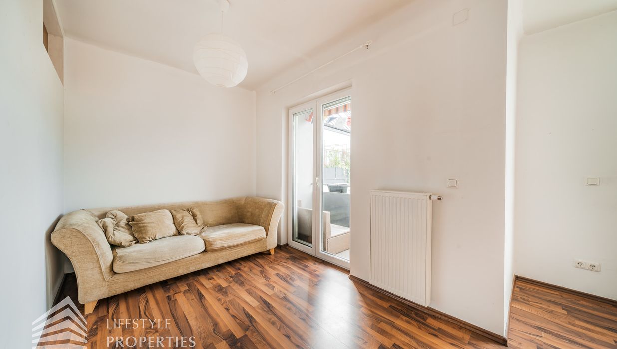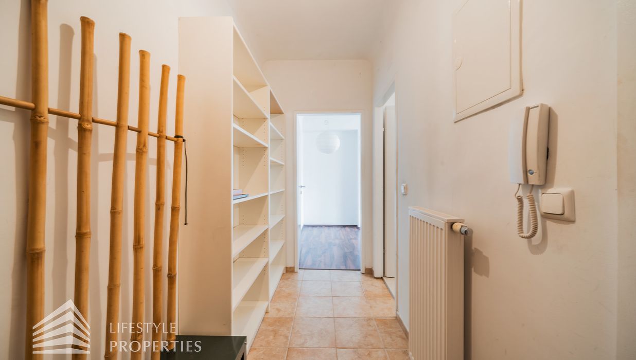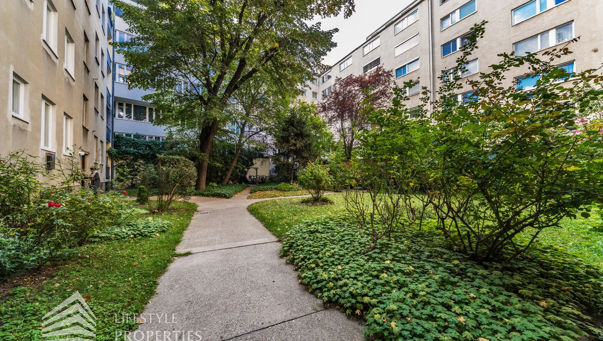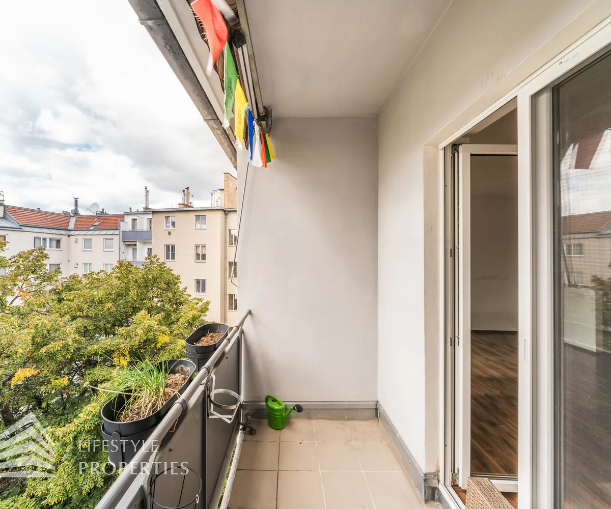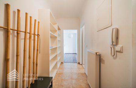 Die Räumlichkeiten der ca. 56 m² großen, charmanten Wohnung, welche sich im fünften Stock ohne Aufzug befindet, sind mit ansprechenden Laminat verlegt und Vorzimmer, Badezimmer und Küche geschmackvoll verfliest. Alle Wände wurden in neutralem weiß gestrichen. Vom Vorzimmer, welches mit einem Schuhschrank und einem großen, deckenhohen Regal ausgestattet ist, gelangen Sie rechter Hand ins Badezimmer. Darin befindet sich eine Dusche, das Waschbecken mit Spiegel und Unterschrank, die Toilette, ein Waschmaschinenanschluss sowie ein Hängeschrank, farblich harmonisch miteinander abgestimmt. Am Ende des Ganges kommen Sie ins Schlafzimmer, welches einen offenen Kleiderschrank über die gesamte Rückwand aufweist. Die offen gestaltete Wohn-Küche ist ein absolutes Highlight dieser Wohnung. Durch zwei Fenster und die Glastür, welche zum Balkon führt, wirkt der Raum hell und behaglich. Hier herrscht genügend Platz um zu kochen, zu essen und sich zu erholen, ohne den Raum oder die Gesellschaft verlassen zu müssen. Auch bei der Küche wurde viel Wert auf abgestimmte Farben gelegt, ausgestattet mit einen Herd, einen Geschirrspüler, einen Kühlschrank sowie eine Spüle mit Ober- und Unterschränken. Der Balkon blickt in den ruhigen Innenhof und bietet genügend Platz im Freien um verweilen zu können.