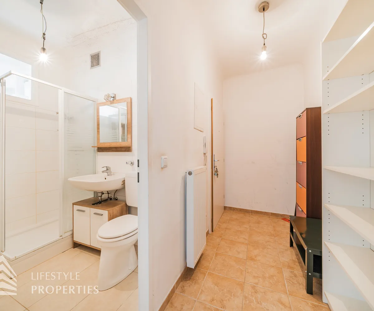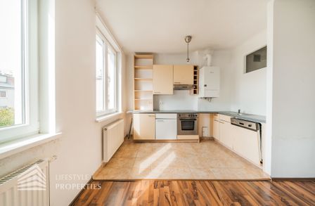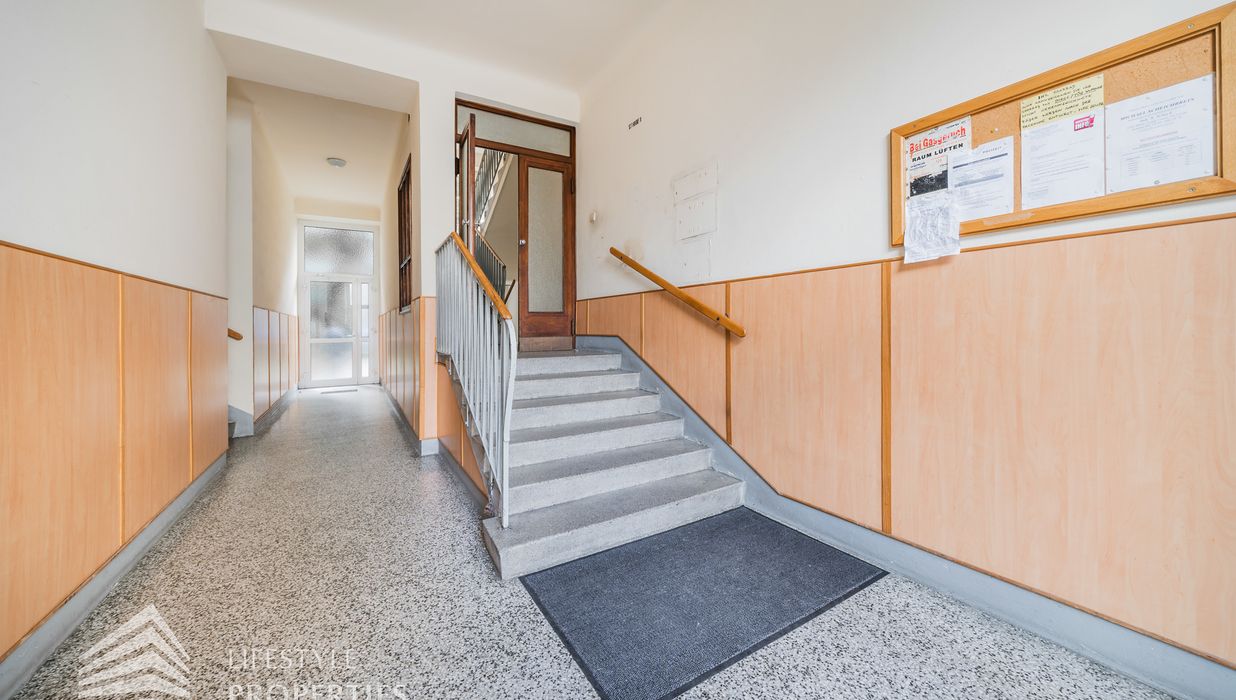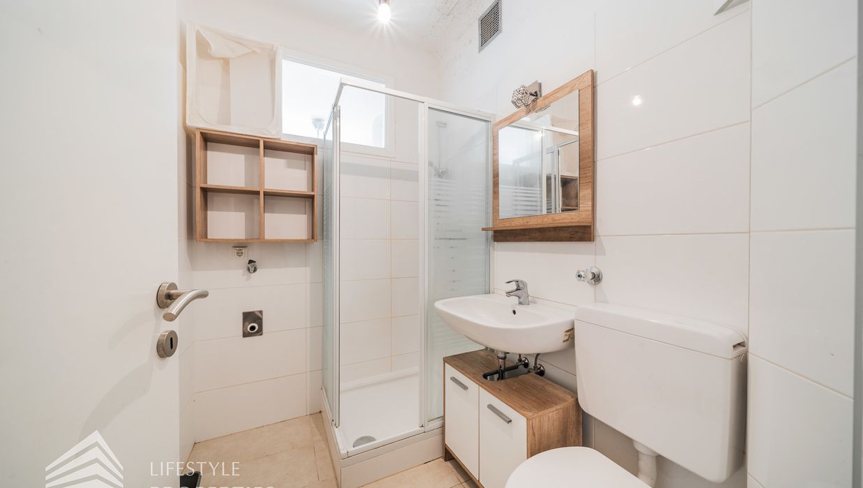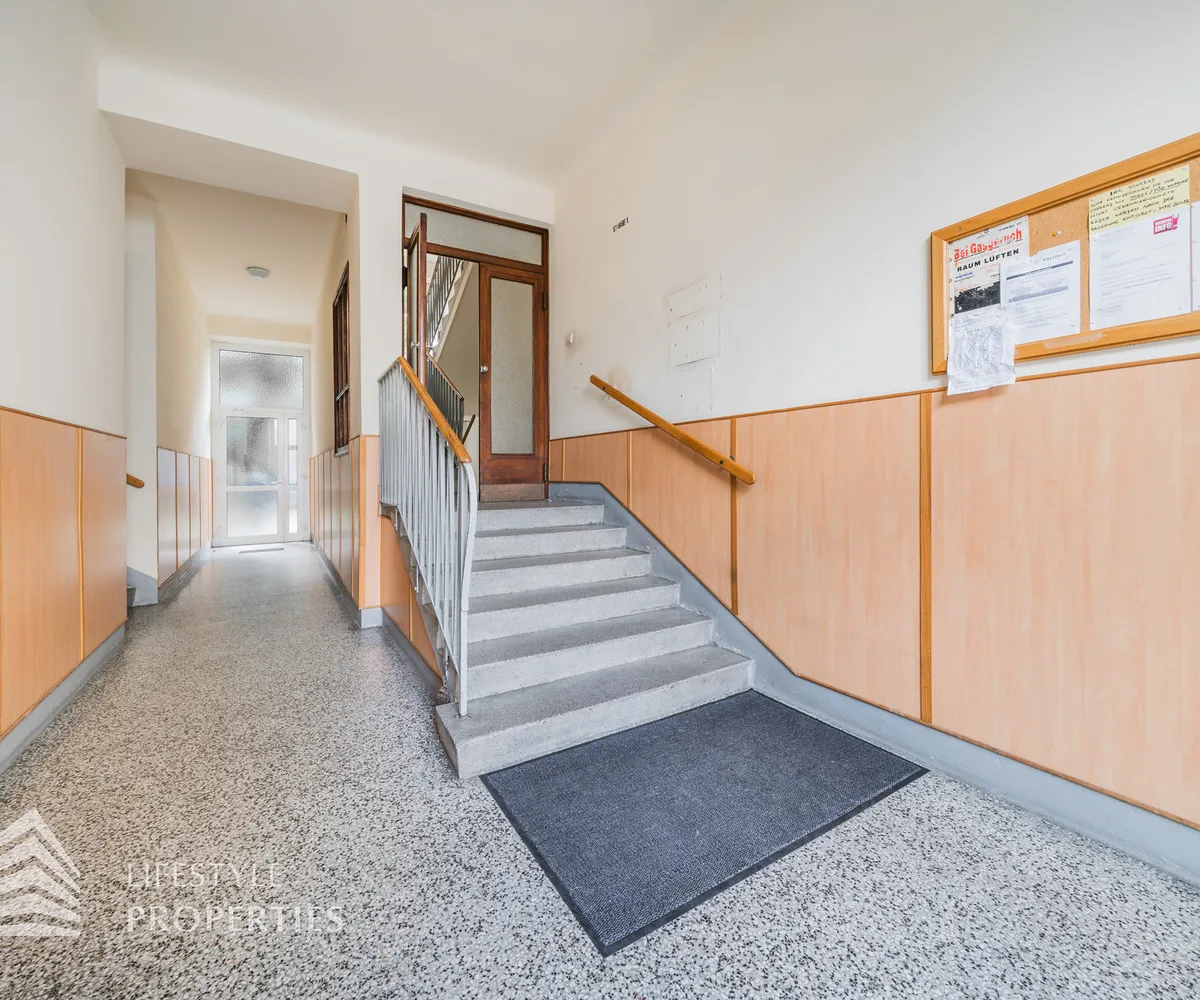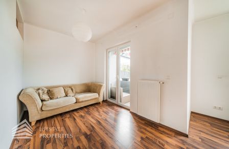 Die Räumlichkeiten der ca. 56 m² großen, charmanten Wohnung, welche sich im fünften Stock ohne Aufzug befindet, sind mit ansprechenden Laminat verlegt und Vorzimmer, Badezimmer und Küche geschmackvoll verfliest. Alle Wände wurden in neutralem weiß gestrichen. Vom Vorzimmer, welches mit einem Schuhschrank und einem großen, deckenhohen Regal ausgestattet ist, gelangen Sie rechter Hand ins Badezimmer. Darin befindet sich eine Dusche, das Waschbecken mit Spiegel und Unterschrank, die Toilette, ein Waschmaschinenanschluss sowie ein Hängeschrank, farblich harmonisch miteinander abgestimmt. Am Ende des Ganges kommen Sie ins Schlafzimmer, welches einen offenen Kleiderschrank über die gesamte Rückwand aufweist. Die offen gestaltete Wohn-Küche ist ein absolutes Highlight dieser Wohnung. Durch zwei Fenster und die Glastür, welche zum Balkon führt, wirkt der Raum hell und behaglich. Hier herrscht genügend Platz um zu kochen, zu essen und sich zu erholen, ohne den Raum oder die Gesellschaft verlassen zu müssen. Auch bei der Küche wurde viel Wert auf abgestimmte Farben gelegt, ausgestattet mit einen Herd, einen Geschirrspüler, einen Kühlschrank sowie eine Spüle mit Ober- und Unterschränken. Der Balkon blickt in den ruhigen Innenhof und bietet genügend Platz im Freien um verweilen zu können.