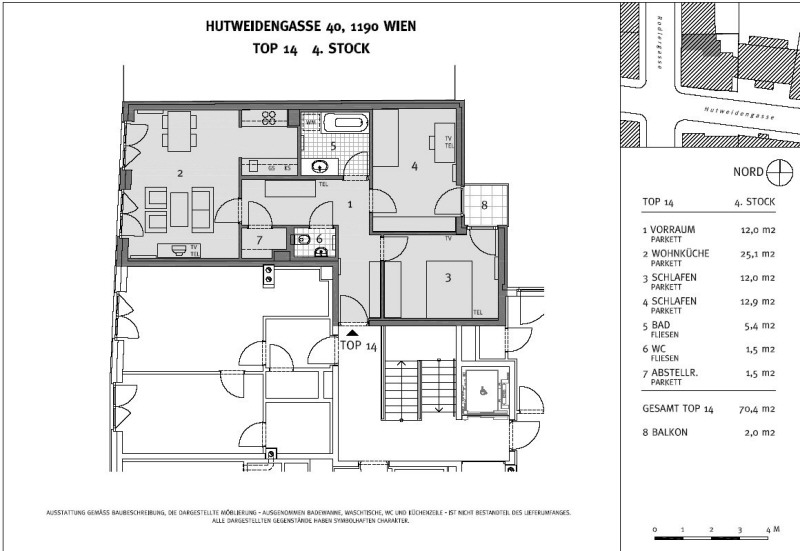 Die Wohnung befindet sich in der 4. Etage und unterteilt sich in eine geräumige Wohnküche mit vollausgestatteter Wohnküche, zwei getrennt begehbare Schlafzimmer, ein Badezimmer mit Badewanne und Waschmaschinenanschluss, ein separates WC, sowie einen Vorraum.
