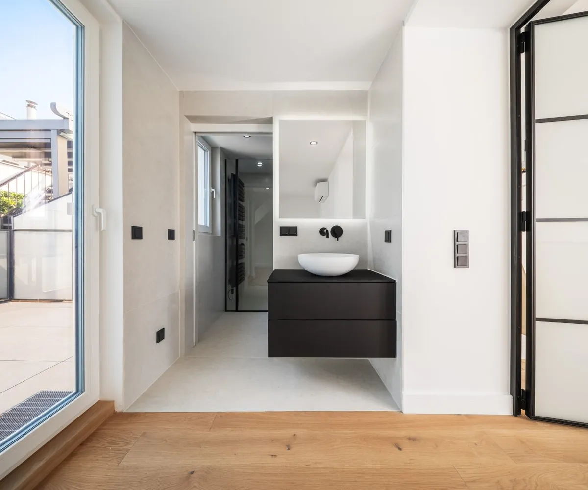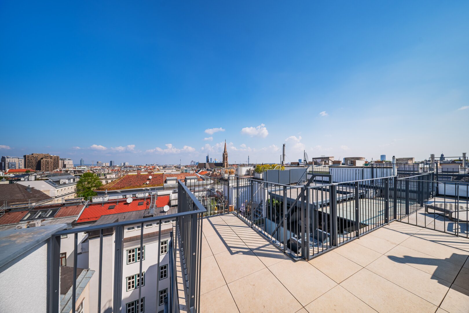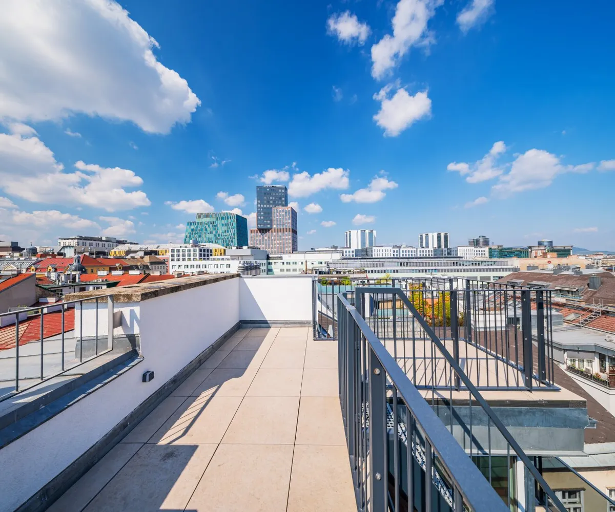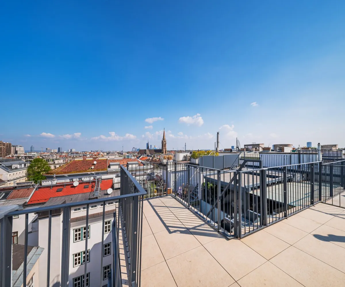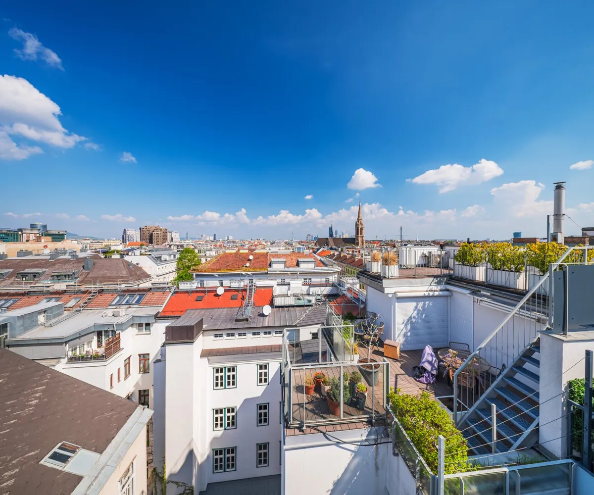 Hier wurde ein durchdachtes Gesamtkonzept geschaffen. Vom Schlafzimmer aus eröffnet sich ein unerwarteter Blick in eine verborgene Welt aus Innenhöfen – Terrassen und Ausblicke, die von der Straße aus kaum erahnbar sind. Es ist ein stilles, fast intimes Panorama. Das absolute Highlight ist die Dachterrasse. Ob bei Sonnenaufgang, in der goldenen Abendstimmung oder bei Nacht: Die Stadt zeigt sich von ihrer eindrucksvollsten Seite.