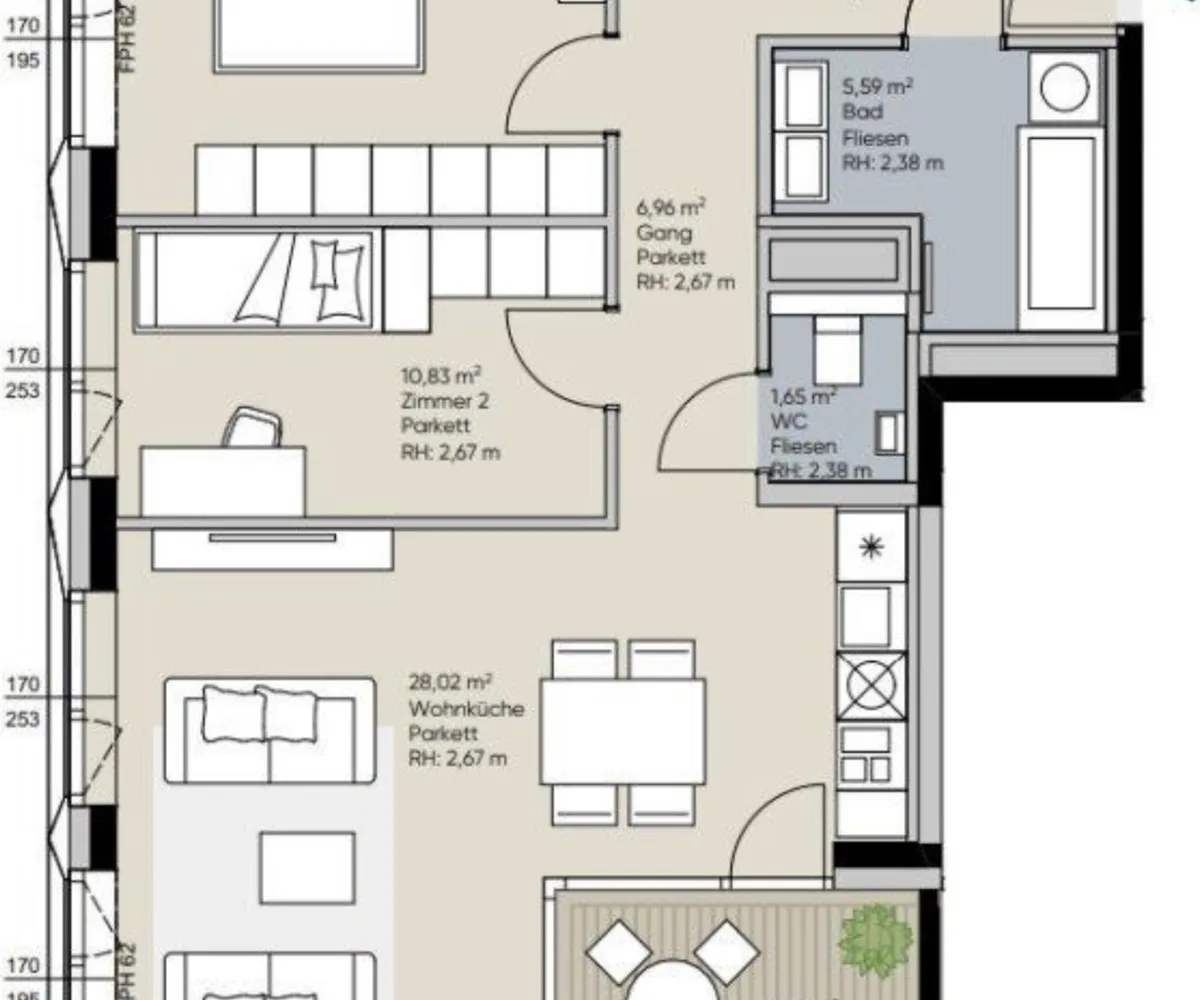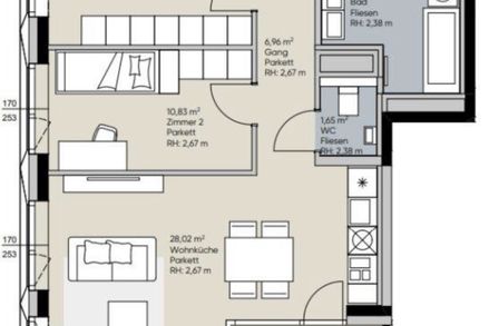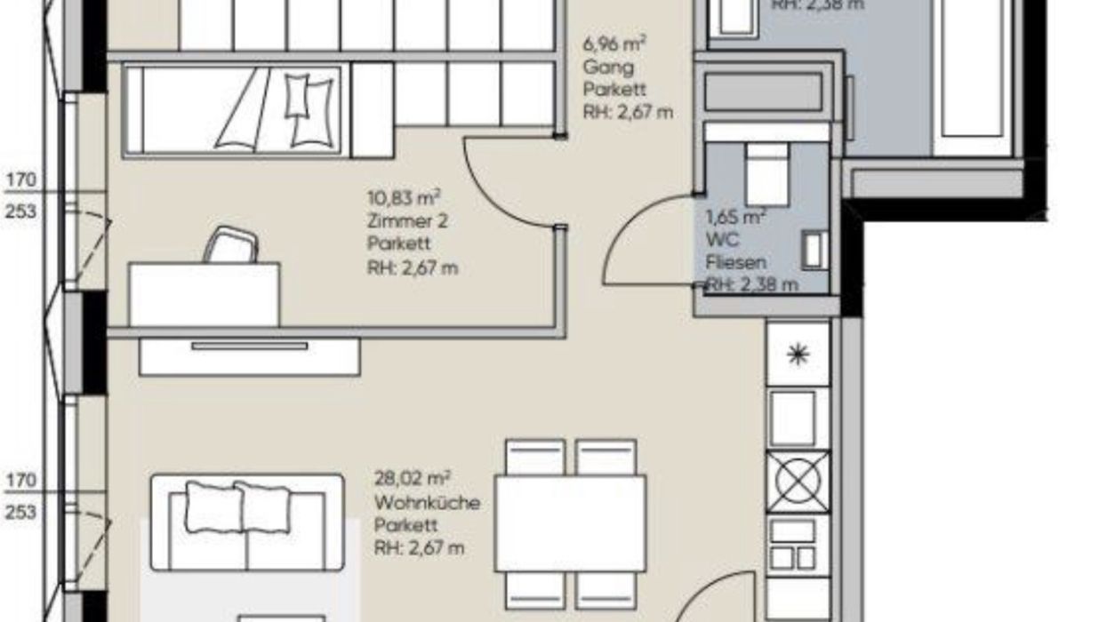 Die Wohnung besteht aus 3 Zimmern, mit knapp 72m² Wohnfläche sowie einer eigenen Loggia mit ca. 6m² und gliedert sich in folgende, funktionelle Raumaufteilung: