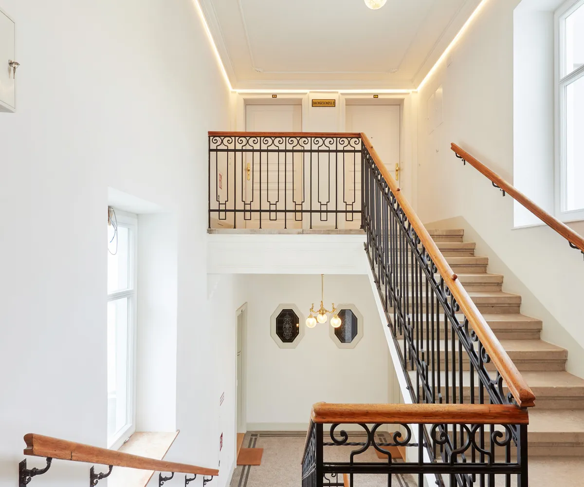 Moderne und zugleich edle Elemente, wie die ansprechenden Holzverkleidungen im Eingangsbereich sowie das digitale schwarze Brett, gepaart mit dem eleganten, original erhaltenen Stiegengeländer und der wunderschönen Luster, verleihen dem Haus einen ganz besonderen Charme.