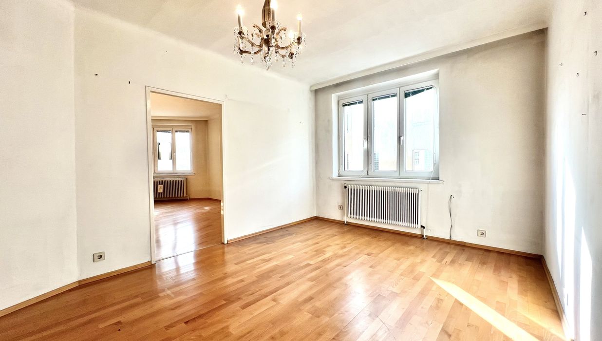 Diese 4 bis sogar 5-Zimmer-Wohnung mit einer Wohnfläche von knapp 100 m² , die durch ihre durchdachte Raumaufteilung und Größe vielfältige Gestaltungsmöglichkeiten bietet, wartet auf ihre Revitalisierung – hier können Sie Ihre Wohnträume verwirklichen und Ihrer Kreativität freien Lauf lassen. Bei der Wohnung im 3. Liftstock im Eckhaus aus 1957 handelt es sich um eine Eckwohnung mit Süd-Ost-West-Ausrichtung und daher zeigt sich das derzeit ca. 24m² große Wohnzimmer besonders hell und einladend . Weiters besteht die Wohnung aus drei weiteren Zimmern, einer separaten Küche , einem Badezimmer, derzeit mit Badewanne , einem praktischen Abstellraum sowie einer getrennten Toilette .