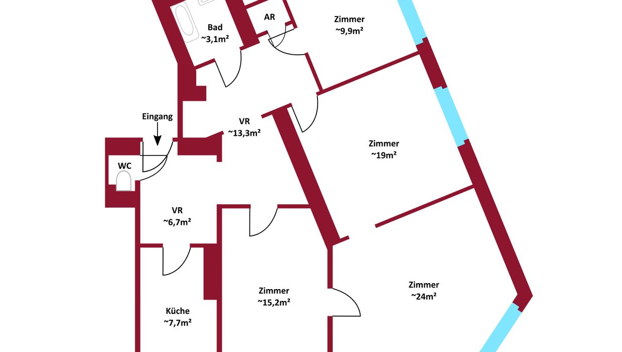Durch Entfernung einer Zwischenwand besteht auch die Option eine besonders große Wohnküche mit ca. 40m² zu schaffen. Ungeachtet dessen bleiben dann noch immer drei weitere Zimmer als Schlaf-, Kinder- oder Arbeitsräume bestehen. Beachten Sie hierzu auch unseren "Alternativgrundriss" im Inserat! Eine weitere und etwas andere Variante ist der Umbau auf eine 5-Zimmerwohnung!