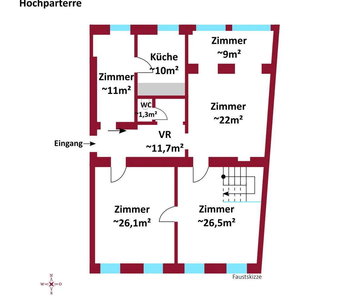 Dieses Unikat befindet sich in einem gepflegtem und saniertem Altbau und umfasst eine ca. 118m2-große Altbauwohnung im Hochparterre und einem damit direkt verbundenen ca. 50m² großem Souterrain, dessen Fläche als Erweiterungsraum für verschiedenste Nutzungsmöglichkeiten offen lässt.