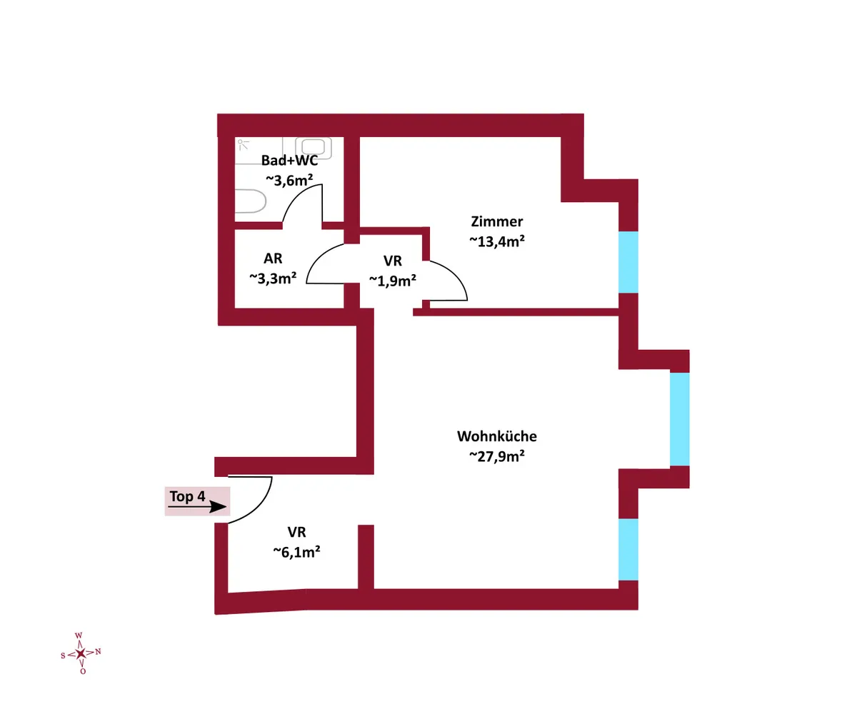 Die Wohnung Top 4 bietet eine Wohnfläche von ca. 56 m² . Sie besteht aus einer Wohnküche, einem Schlafzimmer, einem Badezimmer mit WC, einem Abstellraum sowie zwei Vorräumen.