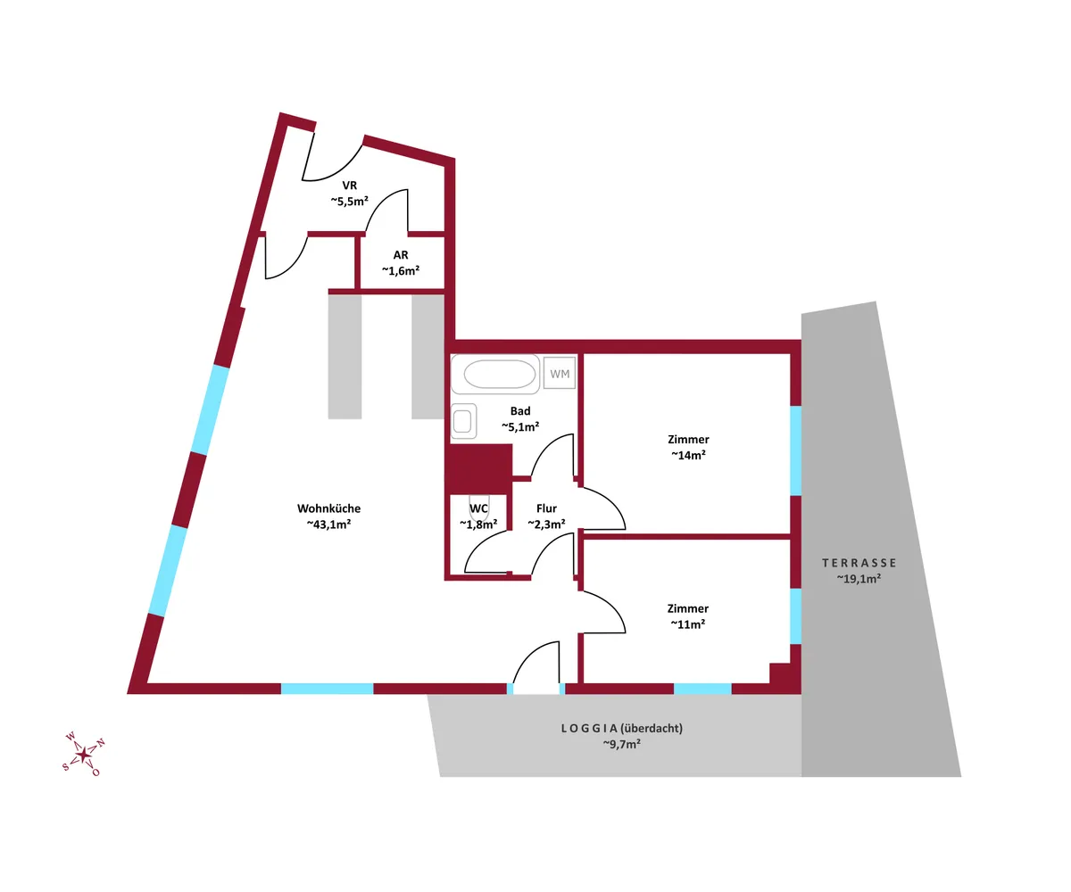 Die Wohnung bietet auf ca. 84,39 m² Wohnfläche ein modernes Wohnkonzept mit einer großzügigen, offenen Wohnküche von ca. 43 m² , die sich perfekt für gesellige Abende eignet. Besonders hervorzuheben sind die großflächigen Außenbereiche: Eine überdachte Loggia mit ca. 10 m² und eine sonnige Terrasse mit ca. 19,1 m² schaffen ein privates Refugium im Freien. Die südwestliche Ausrichtung sorgt für helle und freundliche Wohnräume.