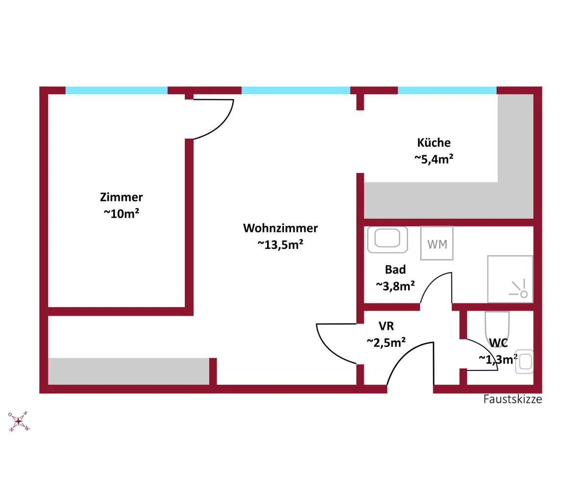 Mit einer Wohnfläche von ca. 39m² teilt sich die Wohnung wie folgt auf: