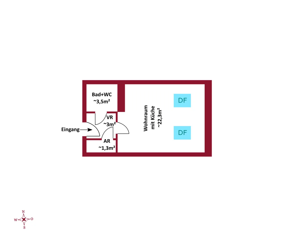 Auf einer Wohnfläche von ca. 30m² erwartet Sie folgende kompakte Raumaufteilung: