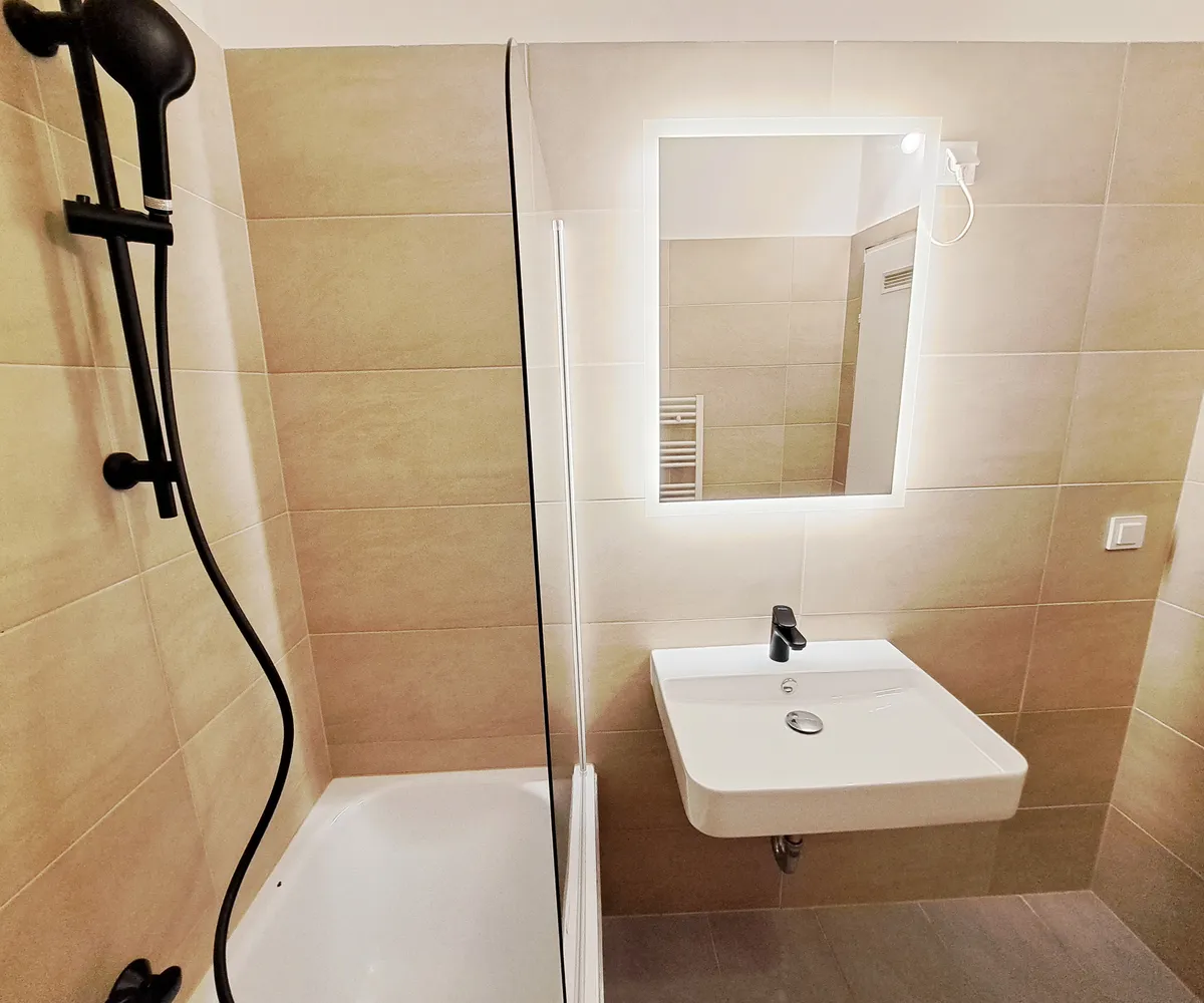 Alle Einheiten verfügen über eine möblierte Küche, sowie meist neu sanierte Bäder (je nach Grundriss mit Dusche oder Badewanne).