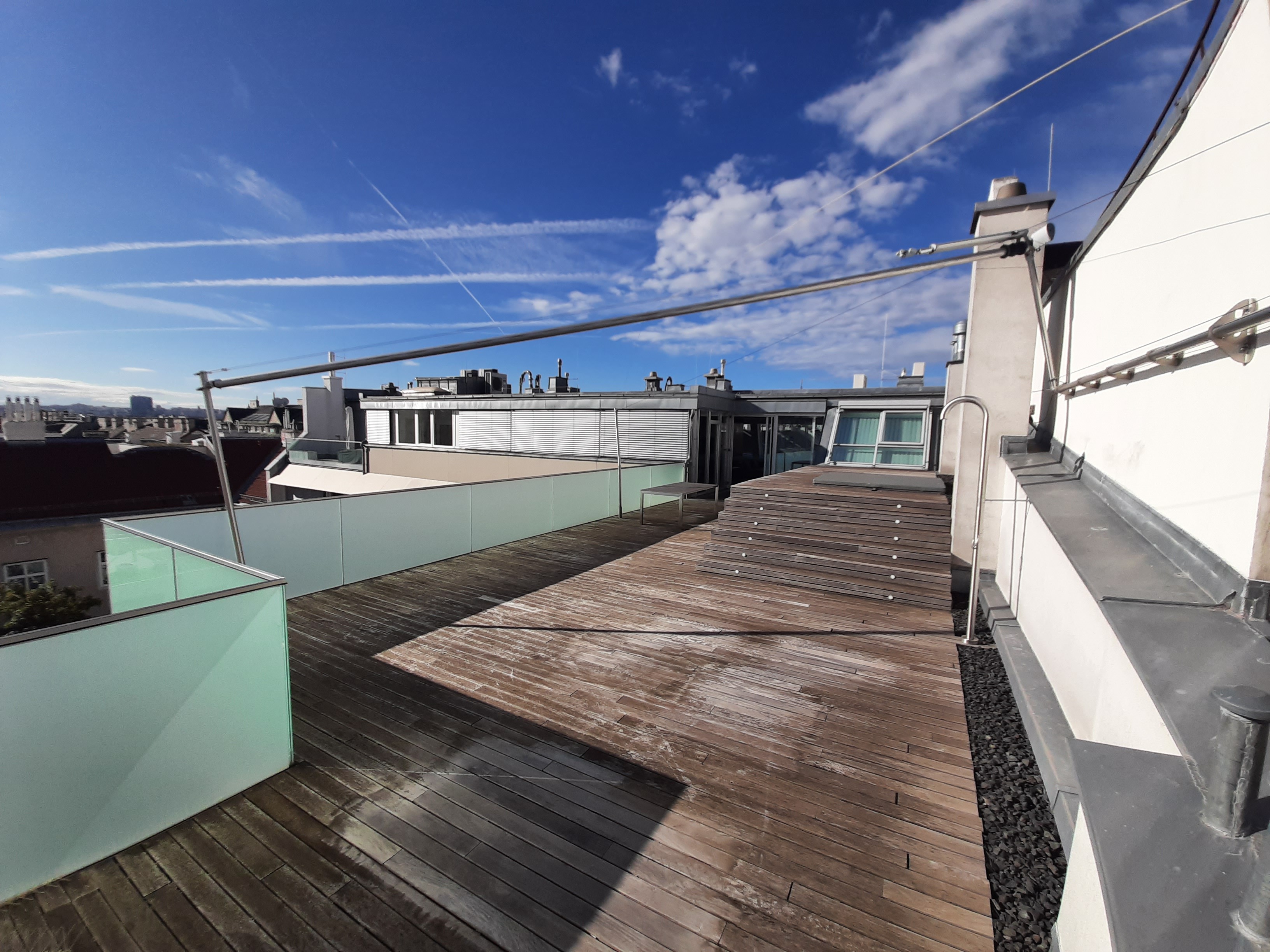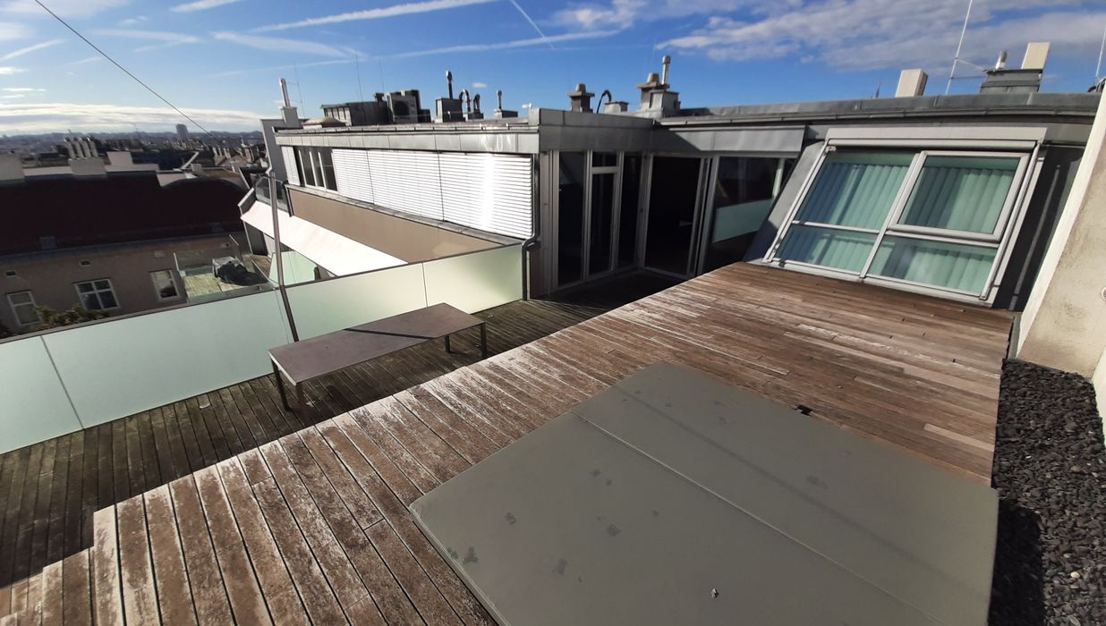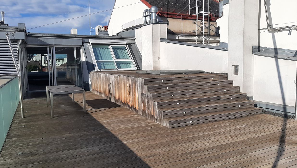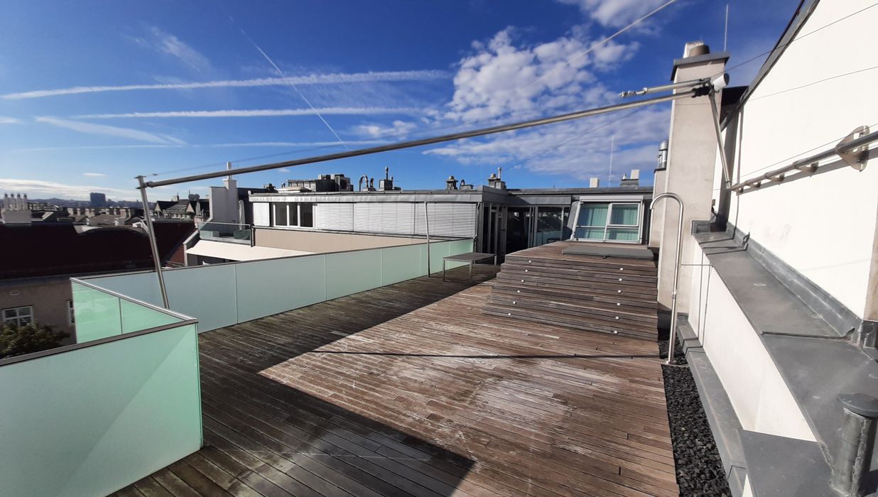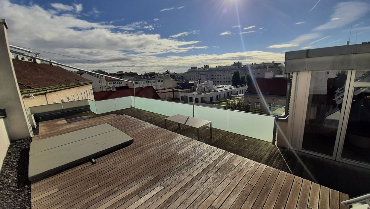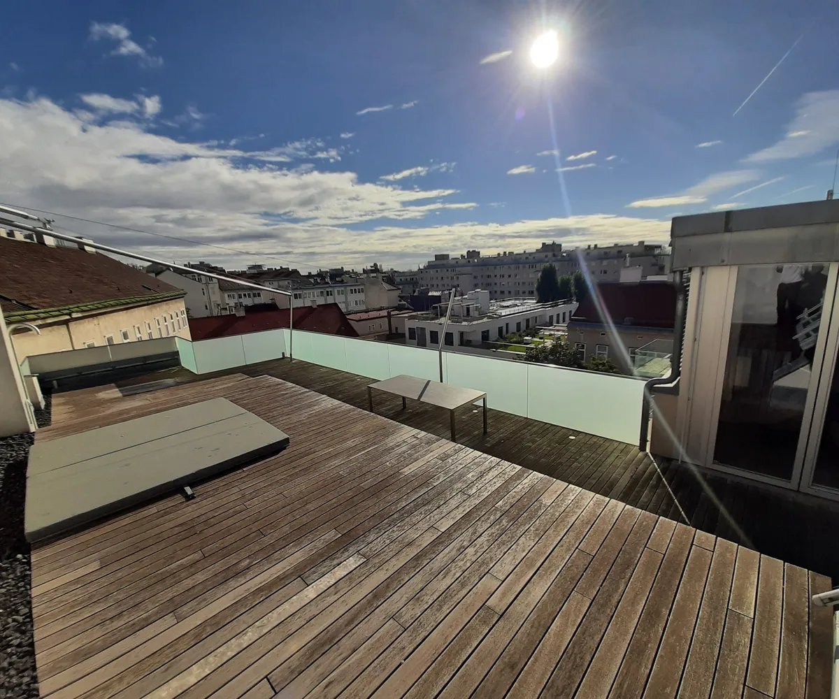 Ein absolutes Highlight ist die rund 100 m² große Dachterrasse mit Sonnensegel und privatem Whirlpool – der perfekte Ort, um spektakuläre Ausblicke zu genießen und ungestörte Stunden über den Dächern der Stadt zu verbringen.