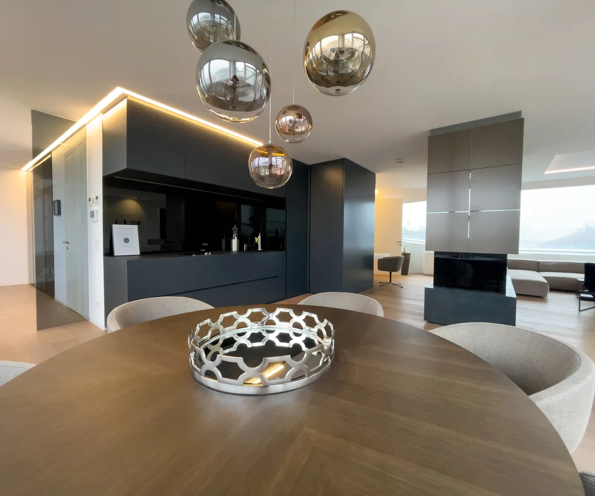 Bereits beim Betreten spüren Sie die besondere Atmosphäre: Der offene Wohn-, Ess- und Kochbereich wird von einem freistehenden Kamin begleitet und sorgt mit seinem eleganten Design und beruhigenden Flammenspiel für Behaglichkeit und Wohlbefinden.