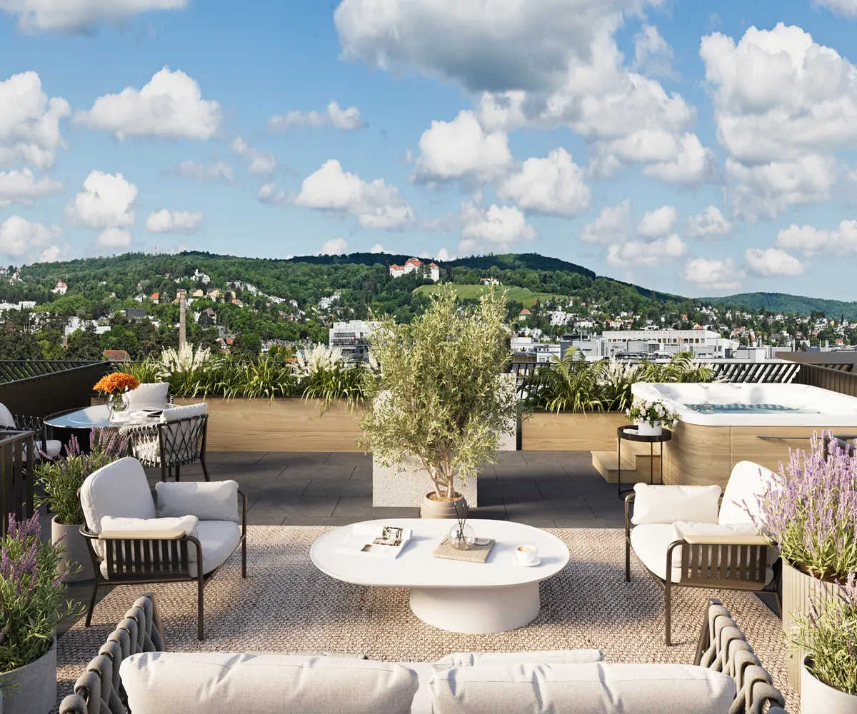 Großzügige private Freiflächen wie Eigengärten, Balkone, Terrassen, Loggien sowie beeindruckende Dachterrassen mit Panoramablick schaffen ein einzigartiges Wohngefühl.