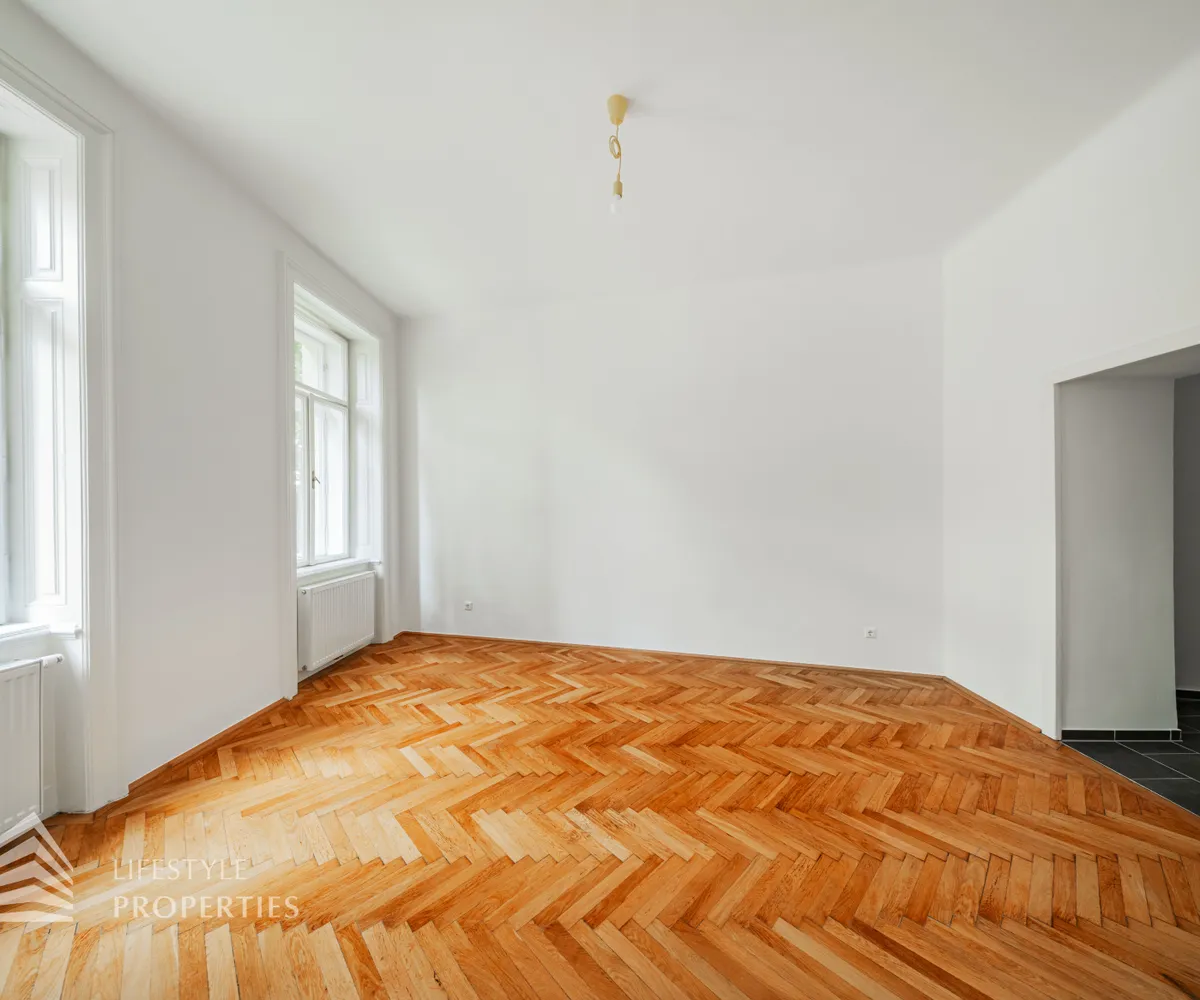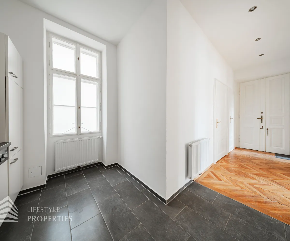 Sie betreten die Wohnung und befinden sich im etwa 13 m² großen Vorraum. Gleich rechts vom Eingang befindet sich das WC. Dahinter liegt das Badezimmer, ausgestattet mit einer Badewanne, einem Waschbecken und einem Fenster. Linkerhand vom Vorraum betritt man das ca. 21 m² große Wohnzimmer, mit zwei separaten Zugängen zu den Schlafzimmern. Von einem der Schlafzimmer hat man außerdem Zugang zu einem Kabinett mit einer Fläche von ca. 5 m². Zurück im Vorraum gelangen Sie geradewegs in die praktische Küche, die bereits mit einer eingebauten Küchenzeile ausgestattet ist.
