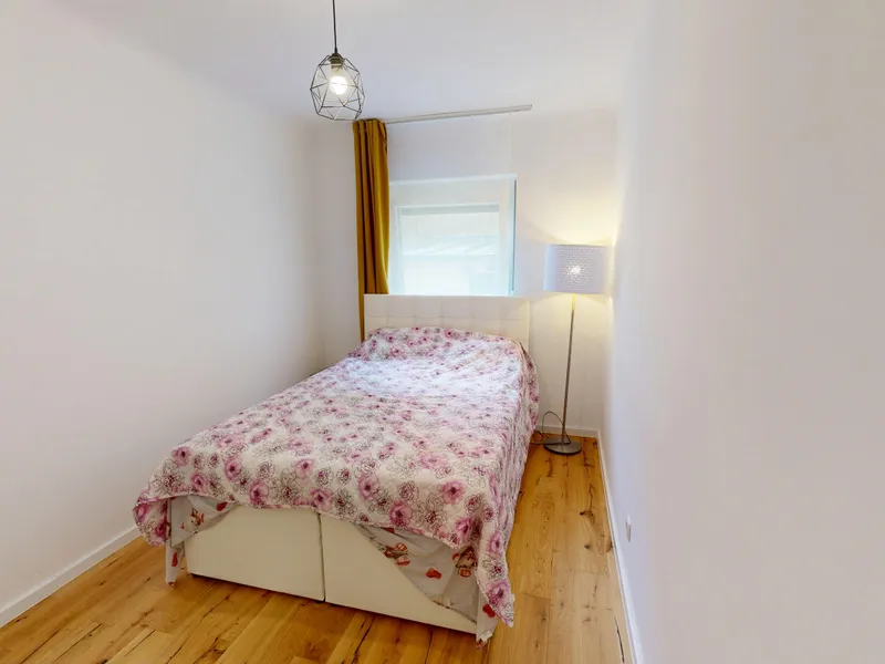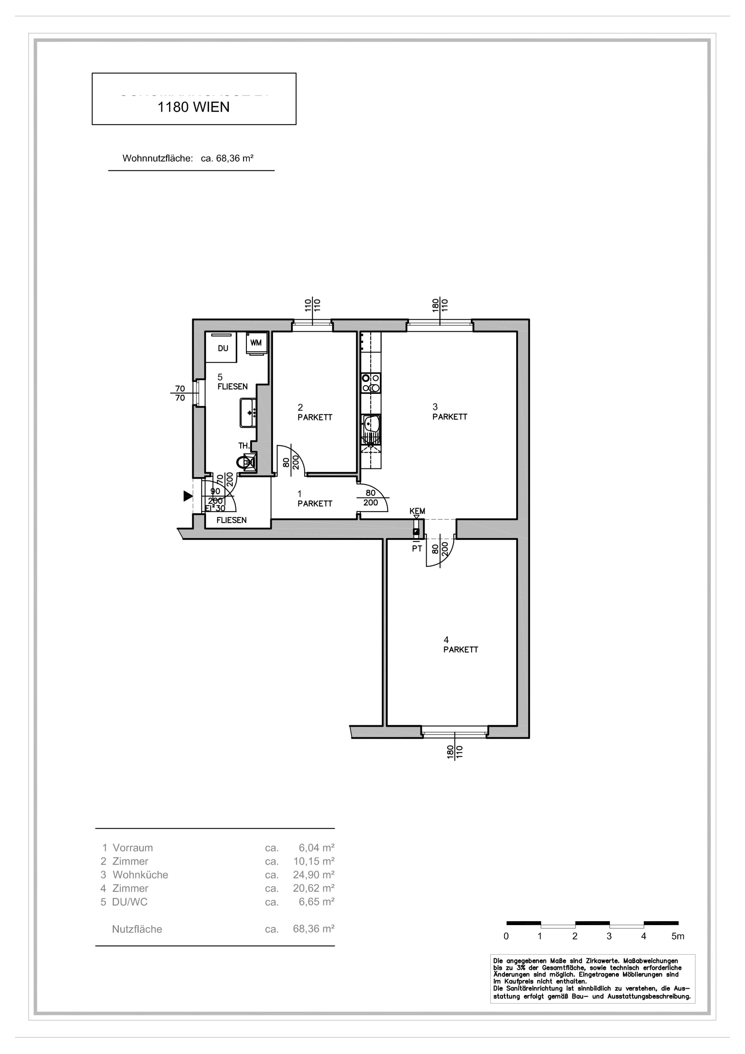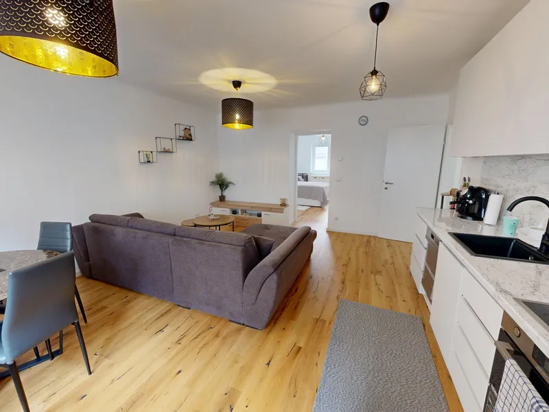 Auf ca. 68,5m² erwartet Sie eine kluge Raumgestaltung mit einem Vorraum, einem Badezimmer mit Walk-In Dusche und WC, zwei Schlafzimmern sowie einer zentralen Wohnküche. Die Ausstattung überzeugt mit edlem Parkettboden, stilvollen LED-Deckenspots und einer modernen Heizlösung über eine Gas-Etagenheizung.