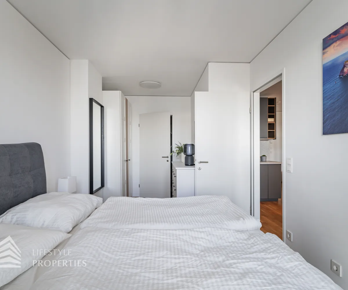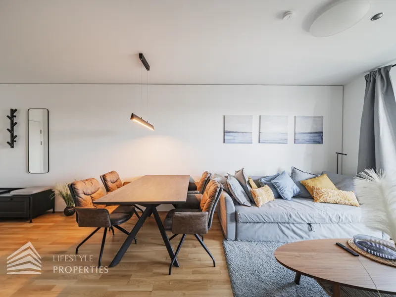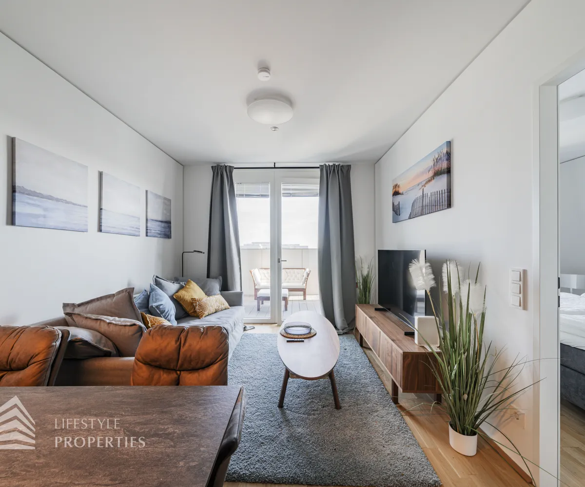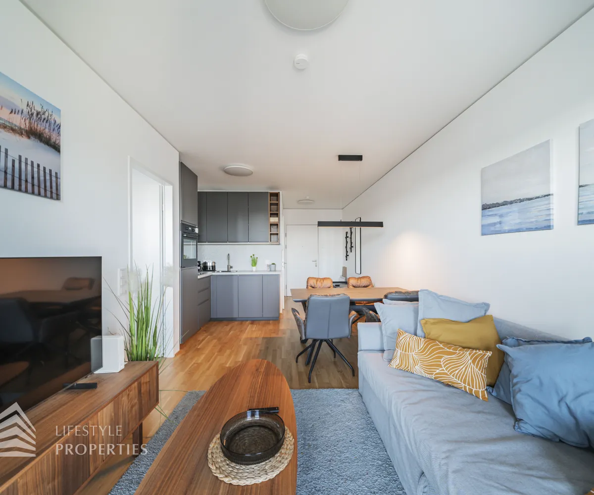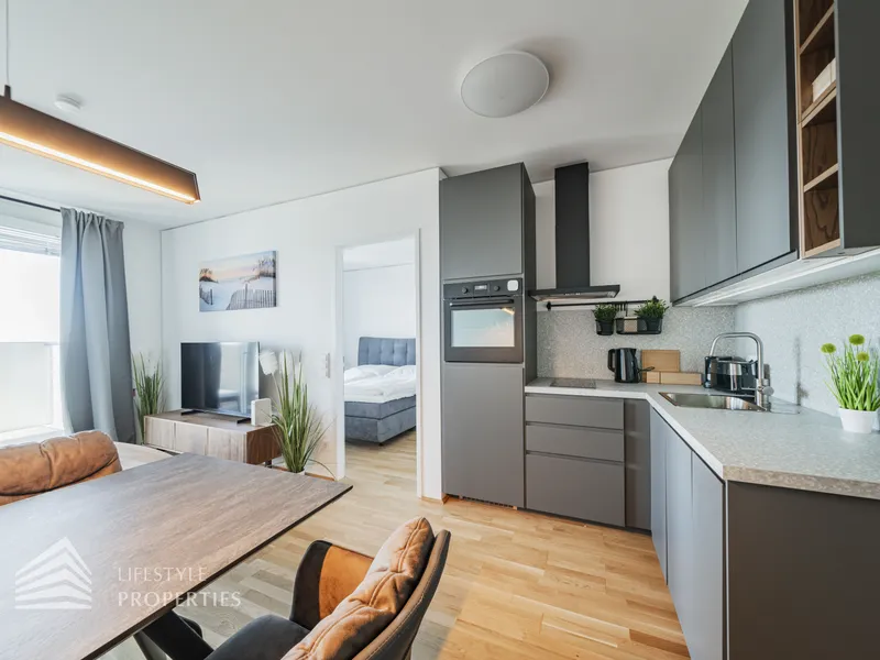 Bei Betreten der Wohnung gelangen Sie in den Eingangsbereich, welcher Sie direkt in das Herzstück der Wohnung führt, in die geräumige Wohnküche. Diese ist mit edlem Eichenparkett ausgekleidet und wird durch ihre großen Fenster mit viel Tageslicht durchflutet. Die moderne Einbauküche ist mit hochwertigen Geräten sowie einer Steinplatte ausgestattet, welche das Herz jedes Kochs höherschlagen lässt. Zudem treffen Sie in der Wohnküche auf eine gemütliche Couch sowie einen hochwertigen Esstisch. Von hier aus gelangen Sie auch auf die Loggia mit wunderschönem Blick auf die Donau und die Grünflächen der Umgebung. Die ca. 9 m² große Loggia mit ihrer ca. 3 m² großen Balkonfläche ist mit einer Outdoor Lounge ausgestattet und lädt zu gemütlichen Abenden an der frischen Luft ein. Die Wohnküche führt Sie weiter in das Schlafzimmer, welches mit einem schönen, grauen Doppelbett sowie einem Kleiderschrank ausgestattet ist. Das Schlafzimmer erscheint sehr hell und einladend und verfügt ebenfalls über einen Zugang zur Loggia. Das angrenzende, moderne Badezimmer ist mit einer großen Dusche, einem Waschbecken, einer Waschmaschine sowie diversen Möbeln ausgestattet. Die separate Toilette mit Waschbecken befindet sich rechts neben dem Eingangsbereich.