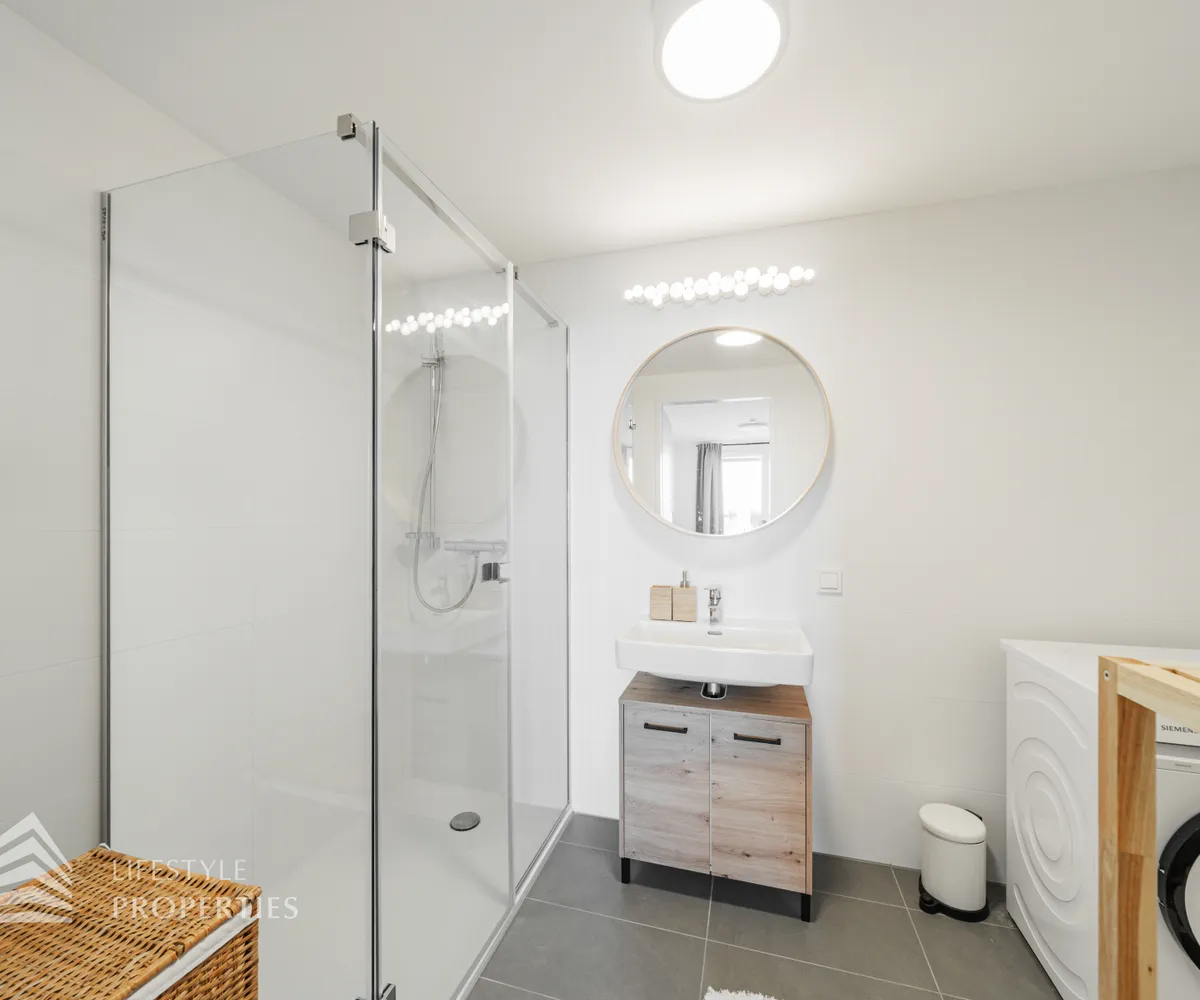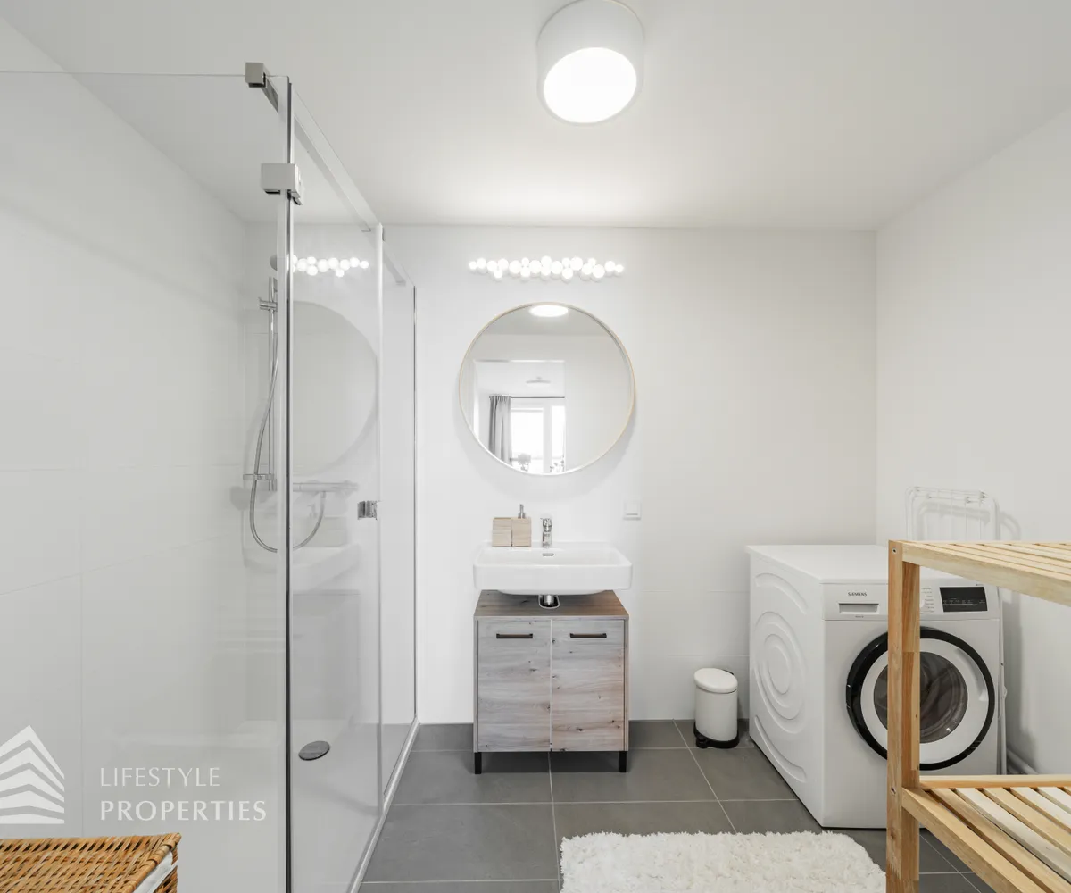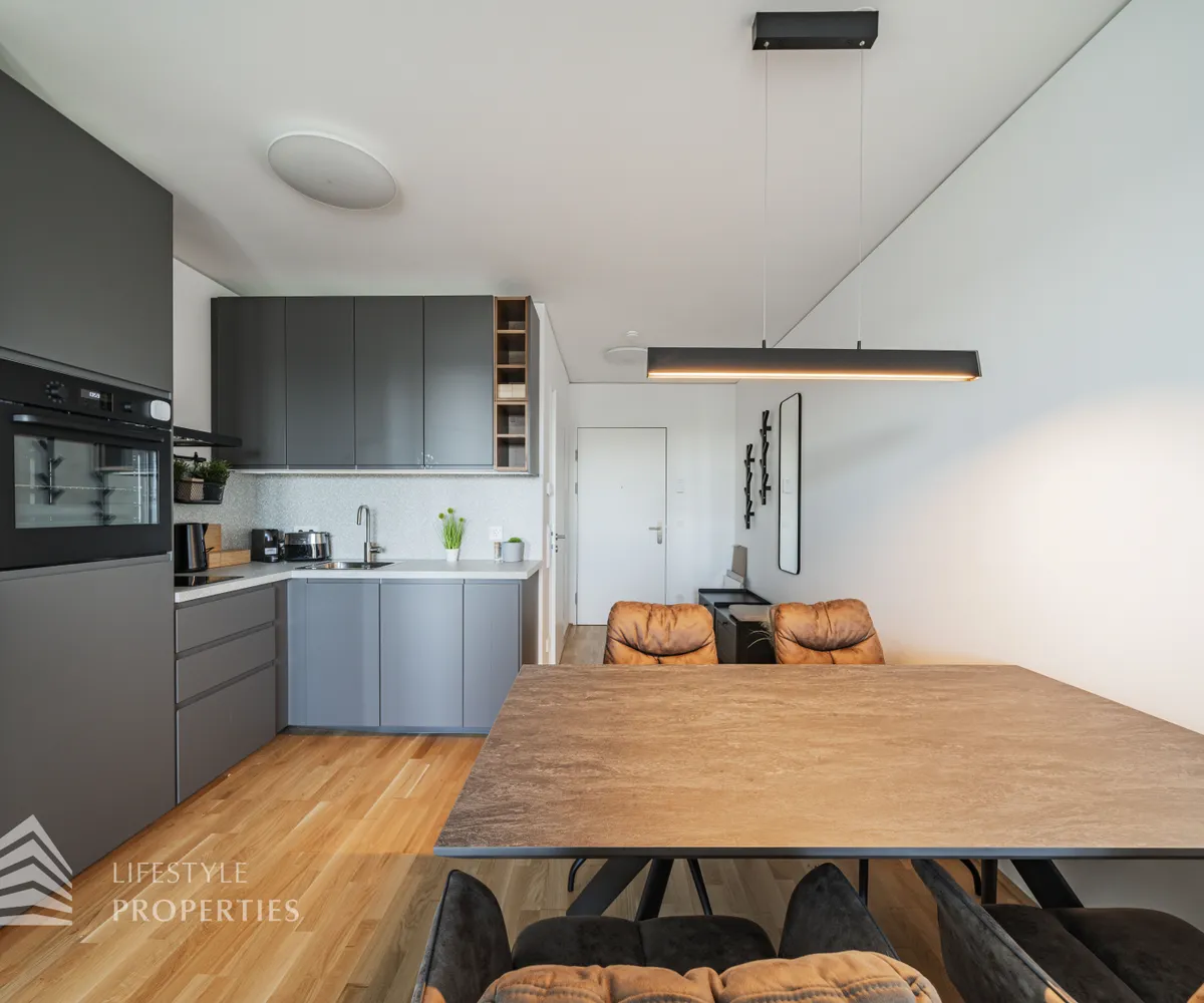 Bei Betreten der Wohnung gelangen Sie in den Eingangsbereich, welcher Sie direkt in das Herzstück der Wohnung führt, in die geräumige Wohnküche. Diese ist mit edlem Eichenparkett ausgekleidet und wird durch ihre großen Fenster mit viel Tageslicht durchflutet. Die moderne Einbauküche ist mit hochwertigen Geräten sowie einer Steinplatte ausgestattet, welche das Herz jedes Kochs höherschlagen lässt. Zudem treffen Sie in der Wohnküche auf eine gemütliche Couch sowie einen hochwertigen Esstisch. Von hier aus gelangen Sie auch auf die Loggia mit wunderschönem Blick auf die Donau und die Grünflächen der Umgebung. Die ca. 9 m² große Loggia mit ihrer ca. 3 m² großen Balkonfläche ist mit einer Outdoor Lounge ausgestattet und lädt zu gemütlichen Abenden an der frischen Luft ein. Die Wohnküche führt Sie weiter in das Schlafzimmer, welches mit einem schönen, grauen Doppelbett sowie einem Kleiderschrank ausgestattet ist. Das Schlafzimmer erscheint sehr hell und einladend und verfügt ebenfalls über einen Zugang zur Loggia. Das angrenzende, moderne Badezimmer ist mit einer großen Dusche, einem Waschbecken, einer Waschmaschine sowie diversen Möbeln ausgestattet. Die separate Toilette mit Waschbecken befindet sich rechts neben dem Eingangsbereich.