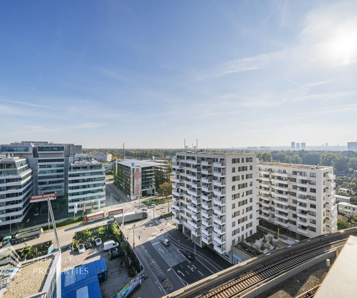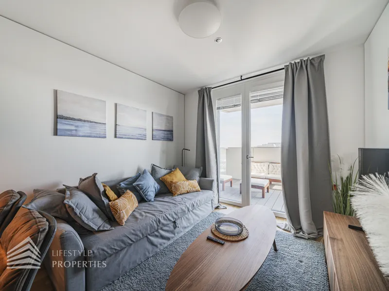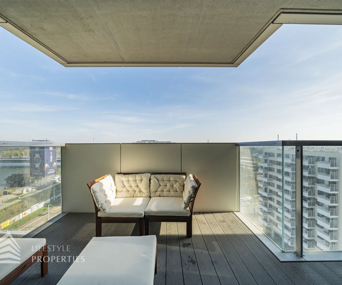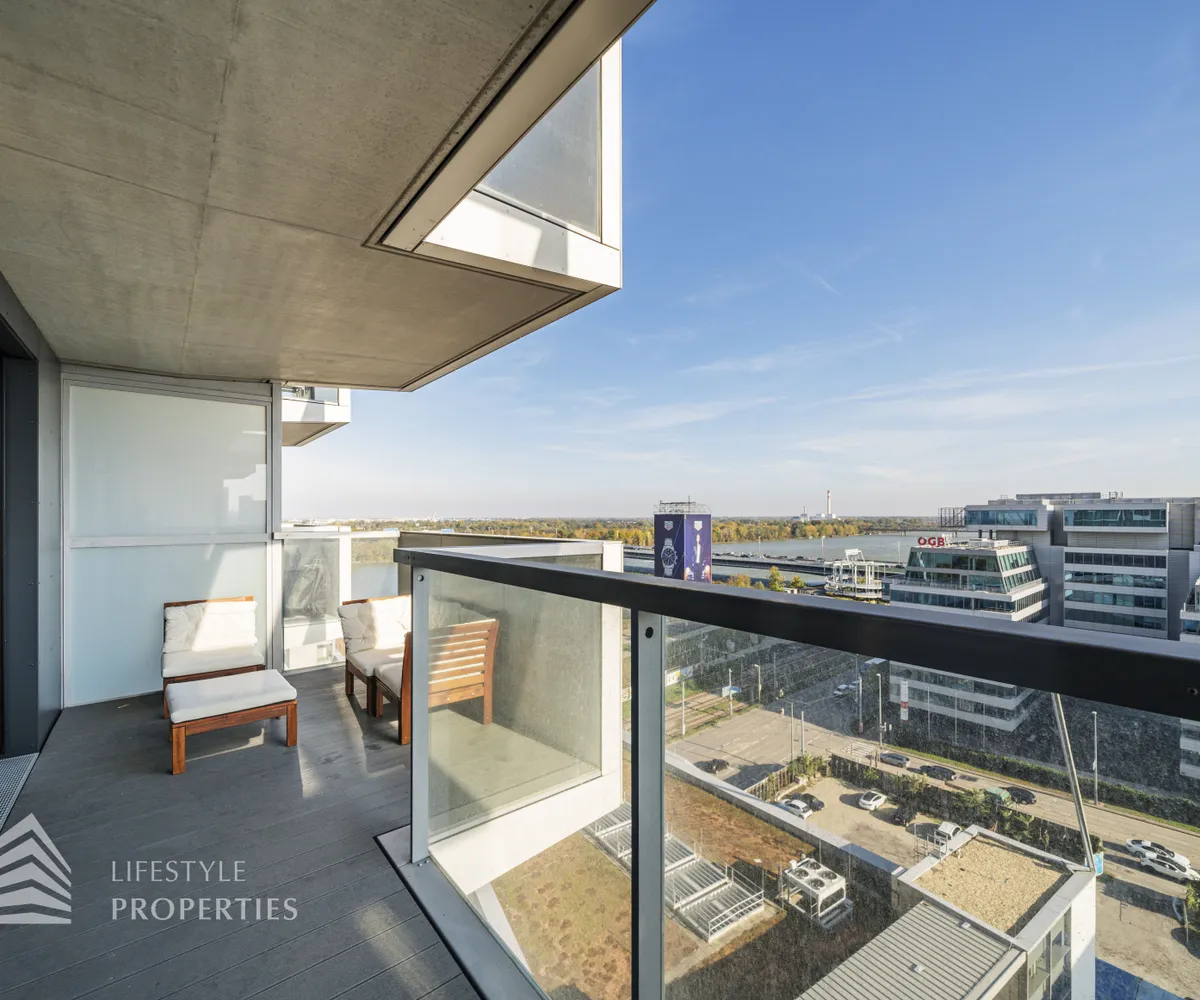 Die im 10. Liftgeschoss gelegene Wohnung erstreckt sich auf ca. 45 m² Wohnfläche und beeindruckt mit ihrer großflächigen Loggia mit unverbaubarem Blick auf die Donau. Sie befindet sich im imposanten Marina Tower, welcher im Jahr 2021 fertiggestellt wurde und viele exklusive Annehmlichkeiten bietet wie einen Concierge Service, einen Fitness- und Wellnessbereich, einen Supermarkt, ein Café, eine Gästelounge sowie ein Home-Cinema. Die Wohnung teilt sich auf in einen Eingangsbereich, eine Wohnküche, ein Schlafzimmer, ein Badezimmer sowie eine separate Toilette. Die Haupträume sind mit wunderschönem Parkett ausgekleidet, die Nassräume sind gefliest. Die Immobilie ist mit hochwertigen Möbel ausgestattet, welche bereits im Kaufpreis inbegriffen sind.