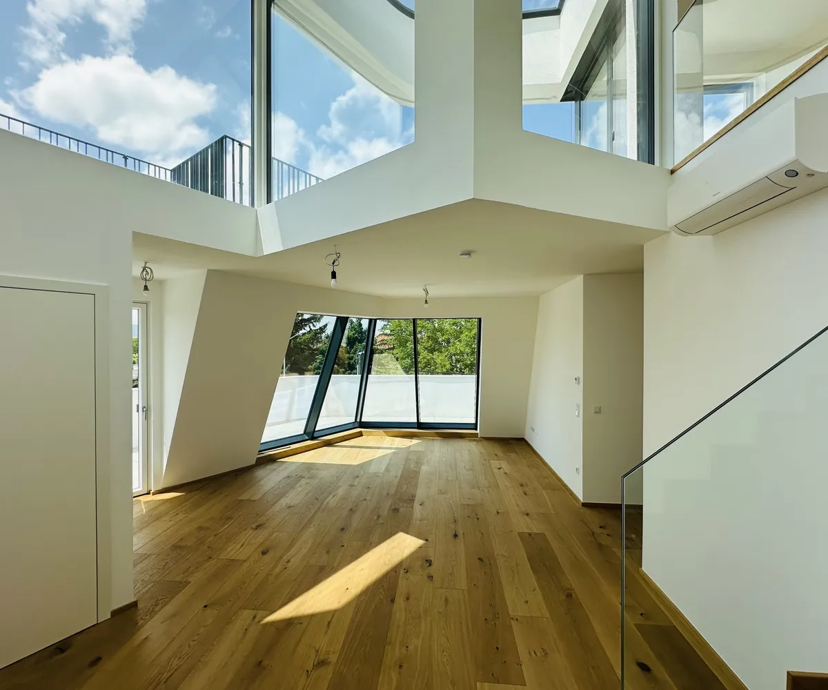 Das obere Geschoss stellt das architektonische Highlight der Wohnung dar. Ein großzügiger, offener Wohnbereich mit raumhohen Glasfronten sorgt für ein einzigartiges Raumgefühl. Hier verschmelzen Wohnen, Essen und Leben in einem stilvollen, lichtdurchfluteten Ambiente.