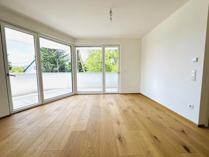 mit Westausrichtung und herrlichem Blick auf den Kahlenberg – perfekt, um Sonnenuntergänge zu genießen oder den Tag in ruhiger Atmosphäre ausklingen zu lassen. Strom- und Wasseranschlüsse bieten zusätzlichen Komfort für Outdoor-Living, Pflanzenpflege oder Beleuchtung.