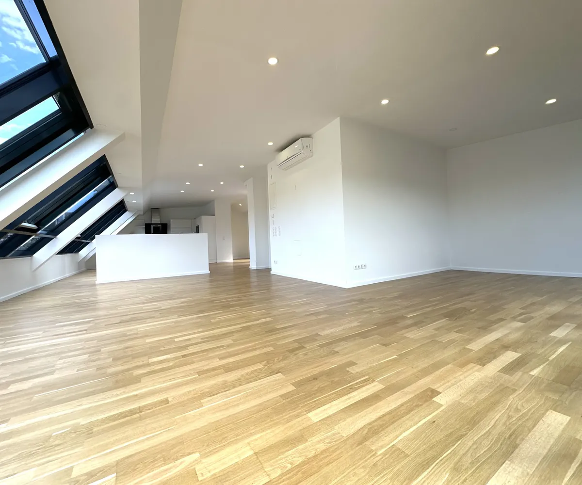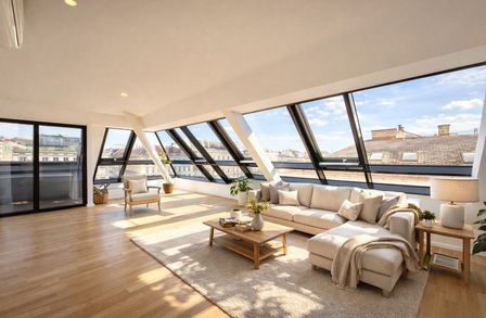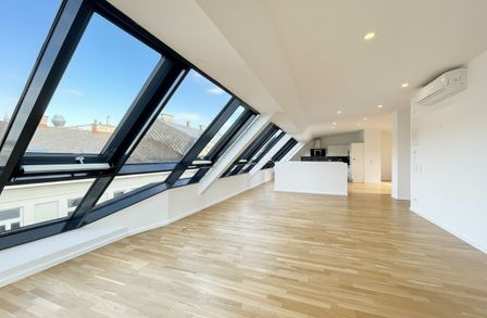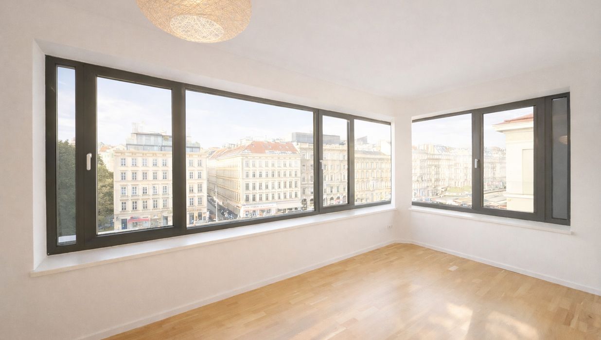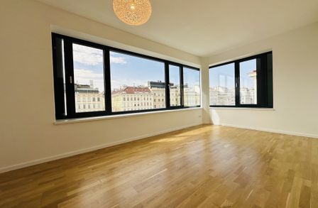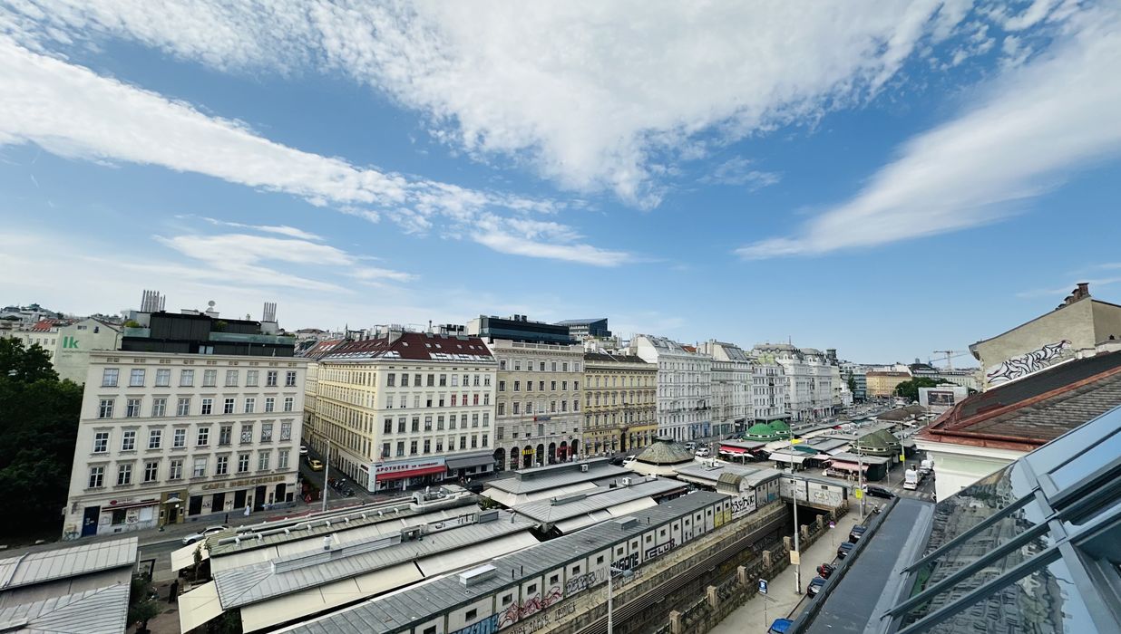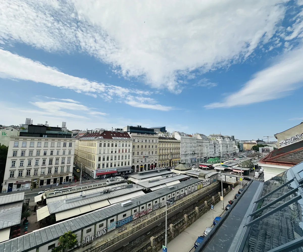 Der eindrucksvolle Wohnsalon mit rund ca. 78 m² und dem traumhaften Fernblick über Wien sowie die ruhige ca. bildet das Herzstück der Wohnung. Der benachbarte Naschmarkt sorgt für kulinarische Erlebnisse mit Stil. Abends genießen Sie hier ein einzigartiges Panorama über das Lichtermeer der Stadt.