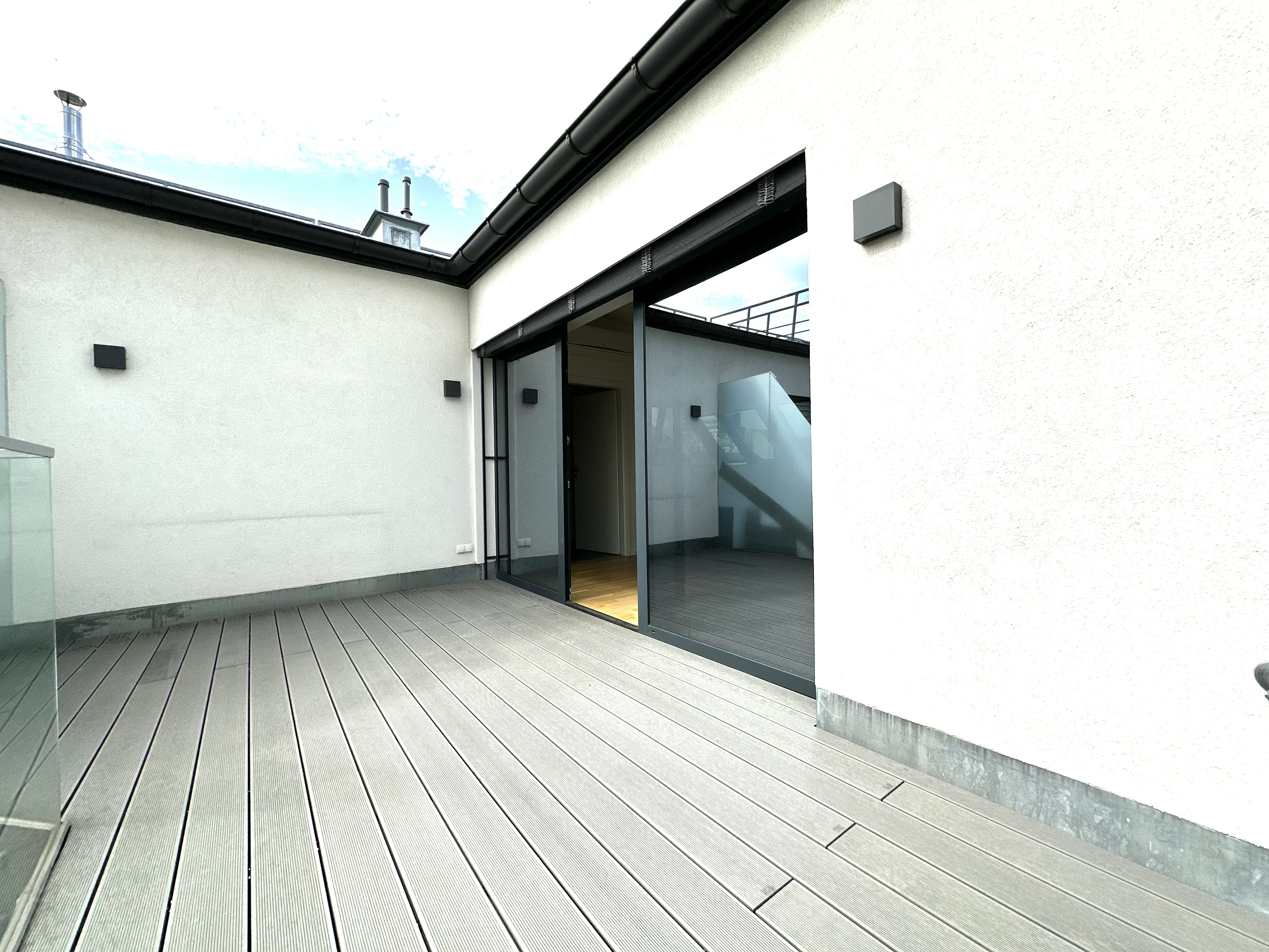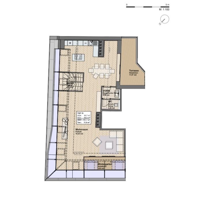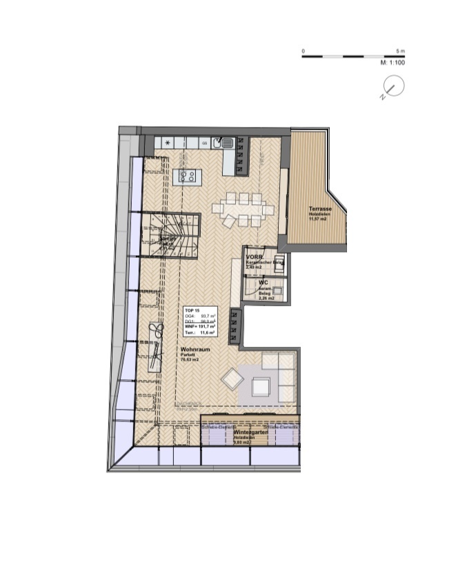 Die sonnige Terrasse mit Südwest-Ausrichtung öffnet sich zum ruhigen Innenhof und ist direkt vom großzügigen Wohnbereich aus zugänglich. Ein besonderes Highlight: Der angrenzende Wintergarten mit nordwestlicher Ausrichtung bietet auch in der kühleren Jahreszeit einen geschützten Rückzugsort – ideal für Pflanzenliebhaber oder als ganzjähriger Wohlfühlbereich mit besonderem Flair.