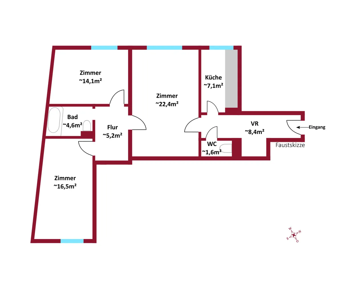 Die 3 Zi. Wohnung teilt sich wie folgt auf: