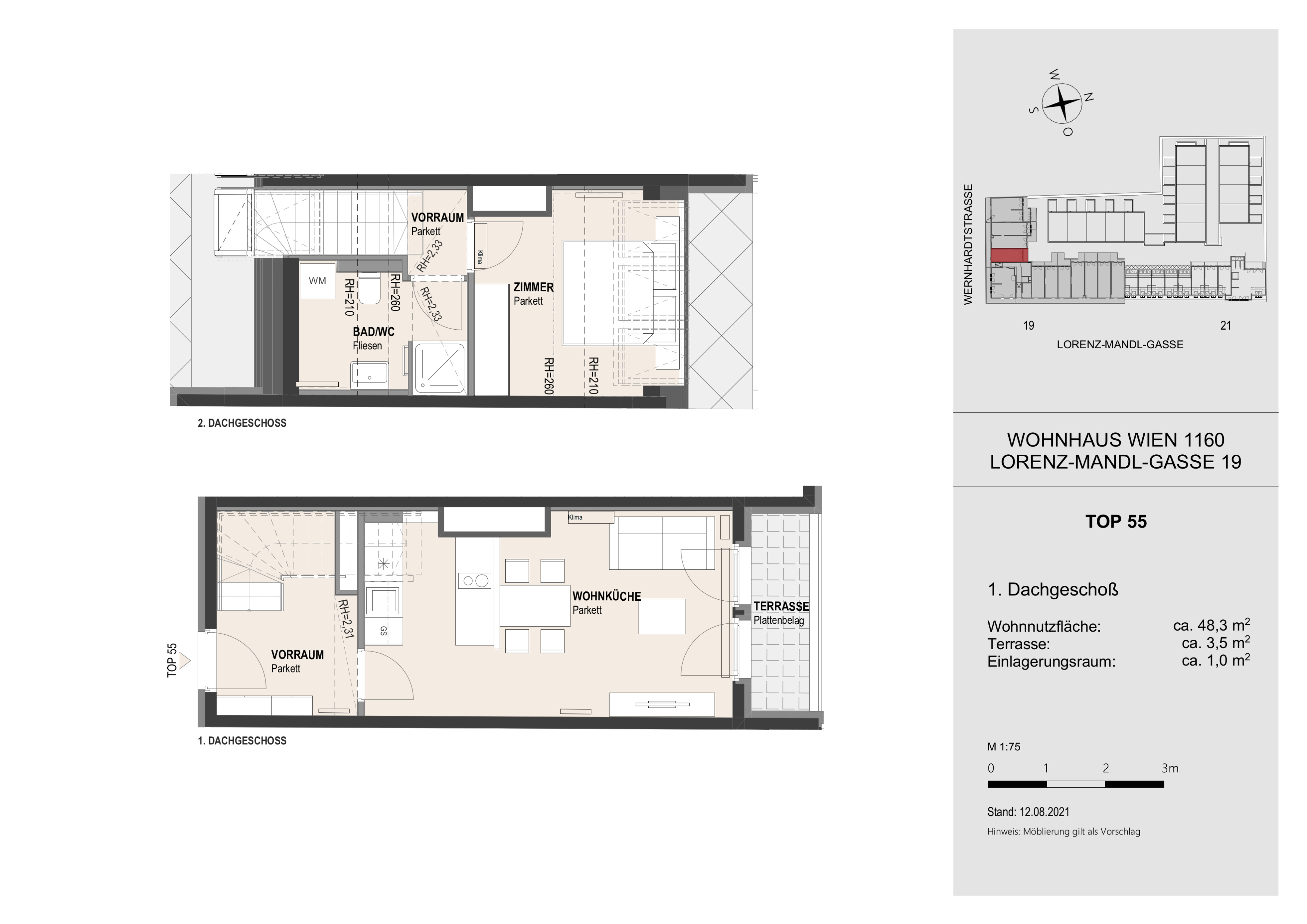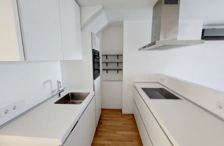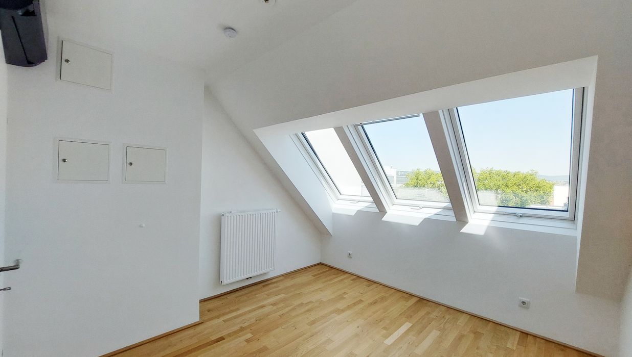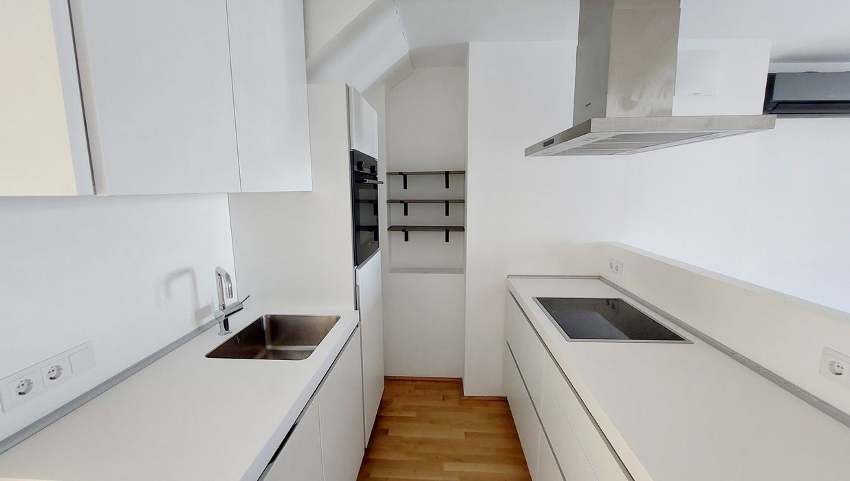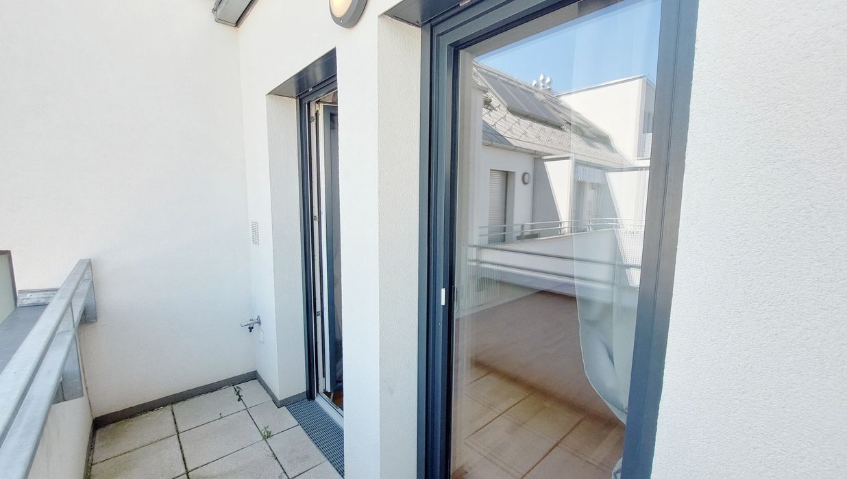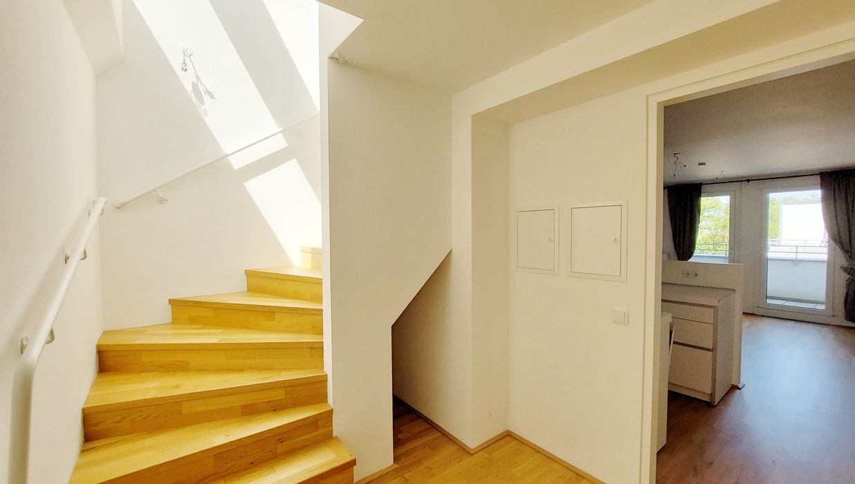 Die Wohnung befindet sich im 1. und 2. Dachgeschoß und verfügt über einen großzügigen Wohnraum mit voll ausgestatteter Küche, sowie einen Vorraum und eine Terrasse im unteren Stockwerk. Das Schlafzimmer, Badezimmer mit Dusche, WC und Waschmaschinenanschluss befinden sich im oberen Stockwerk.