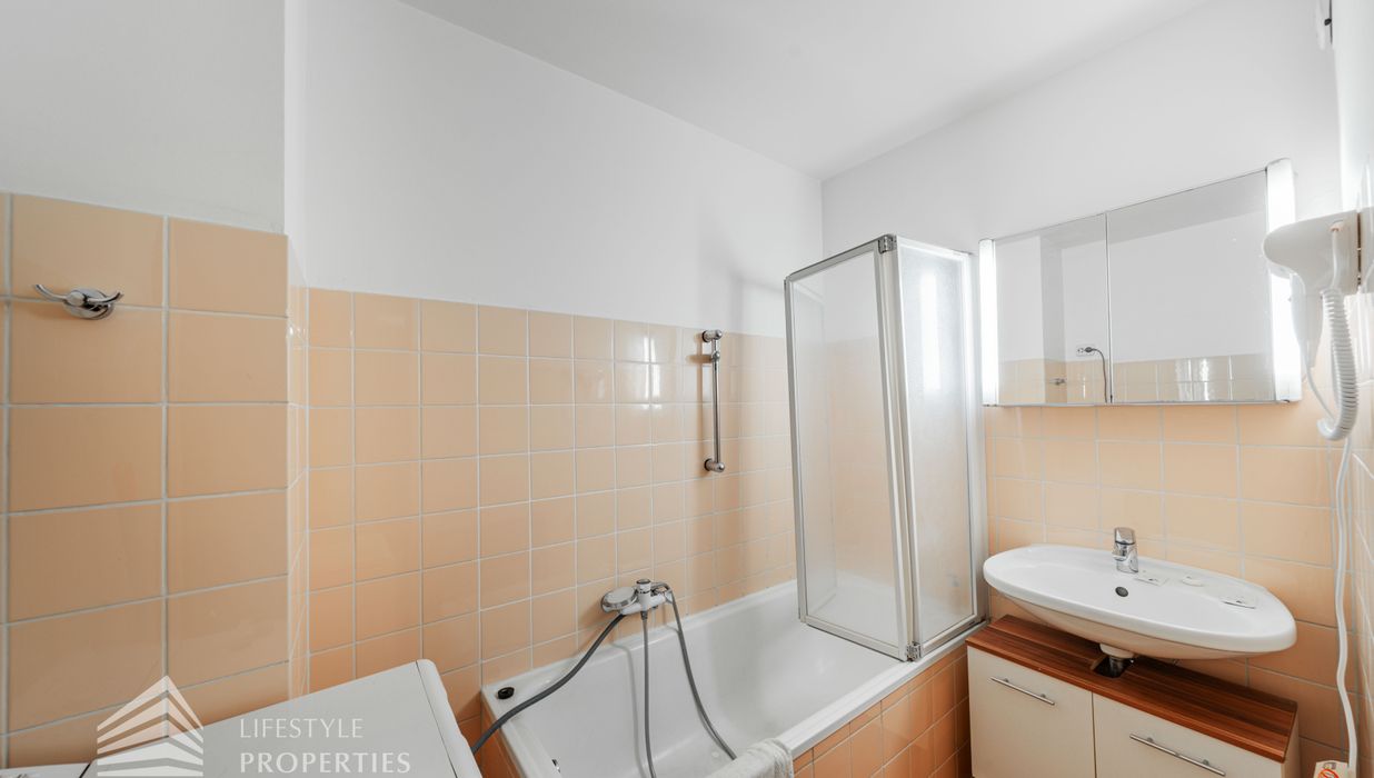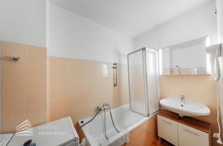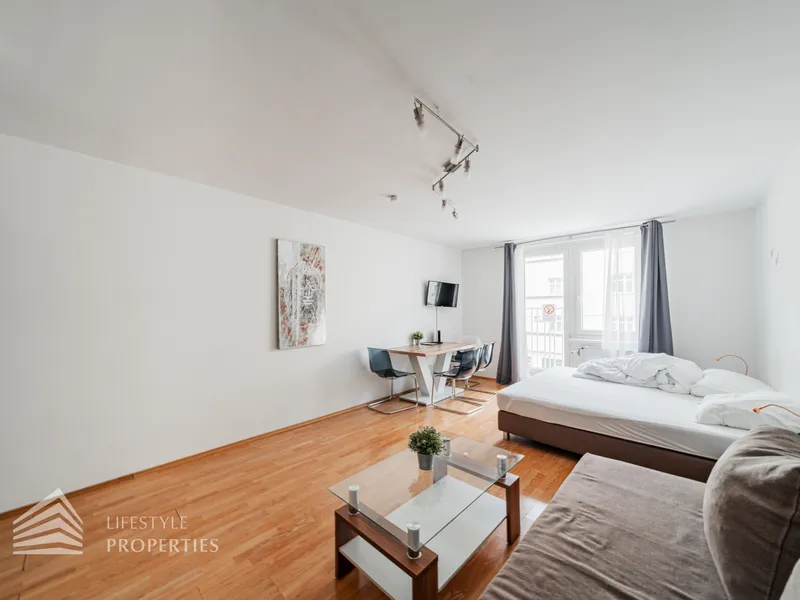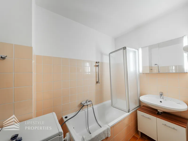Sie betreten die Wohnung in ein einladendes Vorzimmer mit Garderobe, Schuhschrank und Einbauschrank, von wo aus Sie in den Hauptraum, das Badezimmer und WC sowie den Abstellraum gelangen. Das ca. 27 m² große Zimmer ist mit einer Küchenzeile ausgestattet und aktuell mit deinem Doppelbett, einem Esstisch sowie einer Couch und Couchtisch möbliert. Der Raum verfügt dank eines französischen Fensters über viel Tageslicht und ermöglicht aufgrund der Fläche und des Aufbaus die Trennung von Schlaf- und Wohnbereich. Das Badezimmer ist mit Badewanne, Waschtisch mit Unterschrank und Waschmaschine ausgestattet. Zudem bietet ein Abstellraum extra Stauraum.