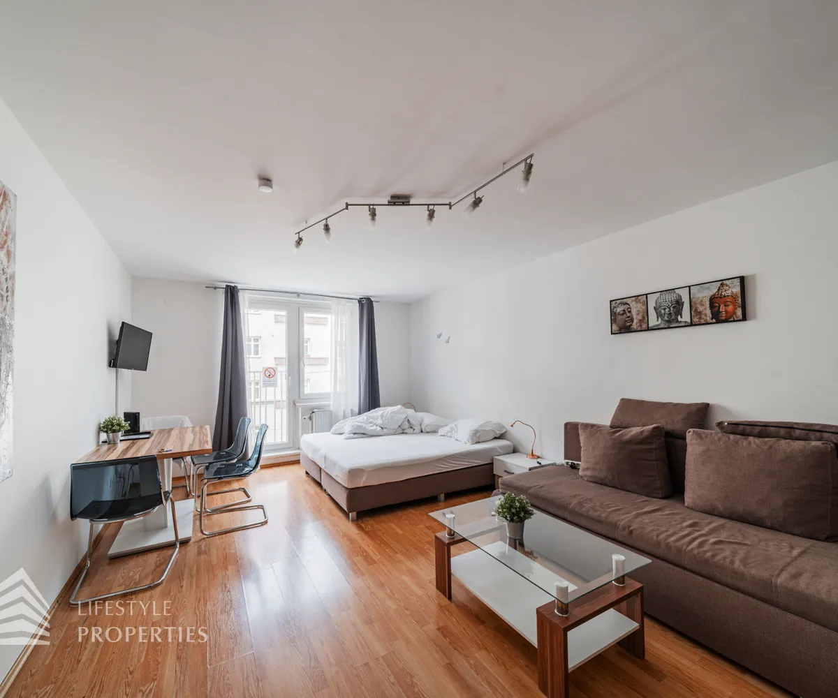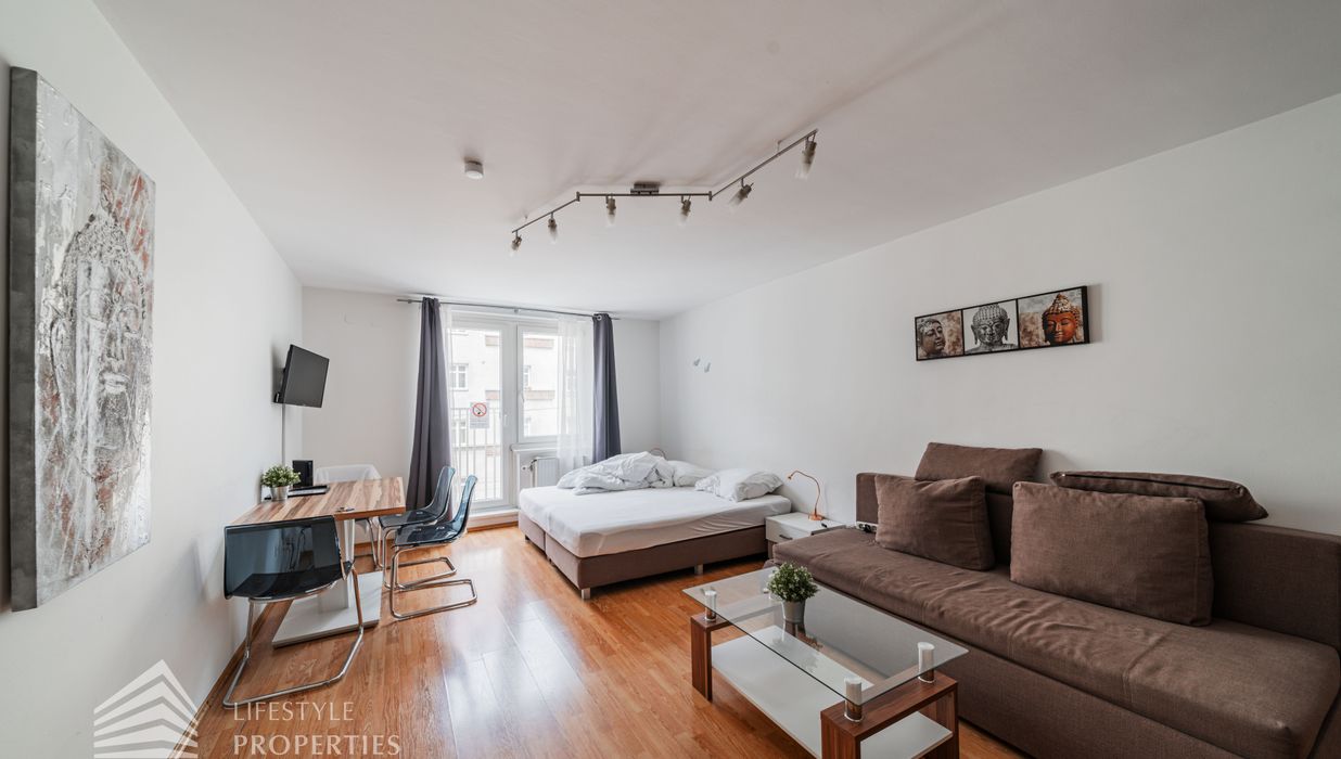 Die Wohnung liegt im 2. Liftstock eines Neubaus aus dem Jahr 1979 und erstreckt sich über ca. 42 m², bestehend aus einem Wohn-/Schlafraum mit Küchenzeile, einem Vorzimmer, einem Abstellraum, einem Badezimmer sowie einer separaten Toilette. Der Hauptraum verfügt über schönen Laminatboden, in den restlichen Bereichen sind Fliesen verlegt. Die Immobilie wird mittels Gaszentralheizung beheizt, die Kosten für Heizung und Warmwasser betragen aktuell EUR 77,60 zzgl. USt. pro Monat. Die Wohnung wird mit allen auf den Fotos ersichtlichen Möbeln verkauft.