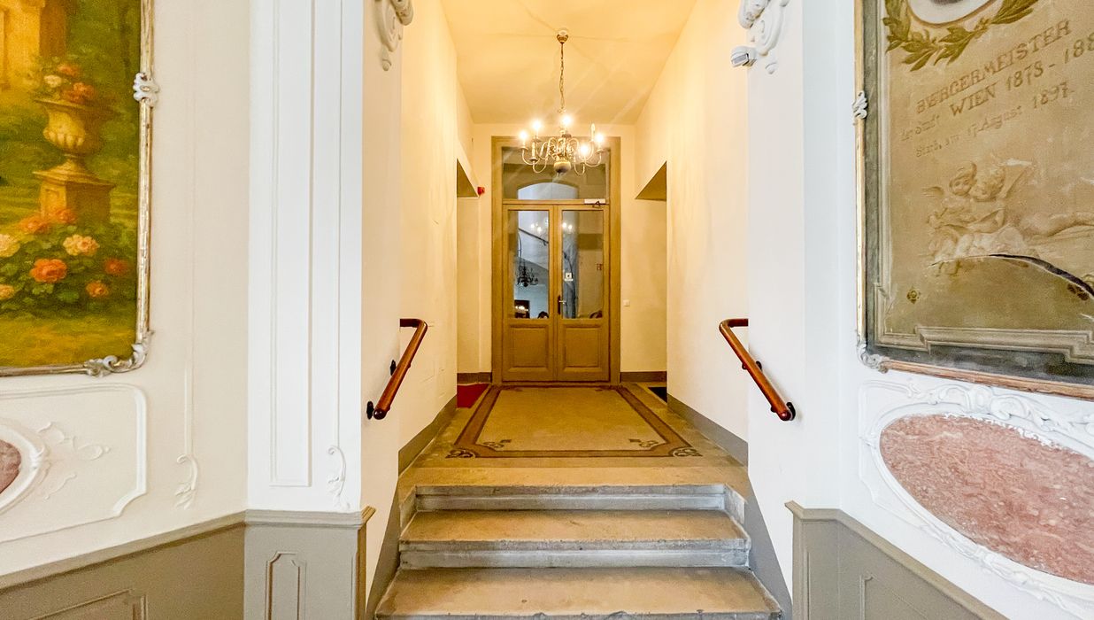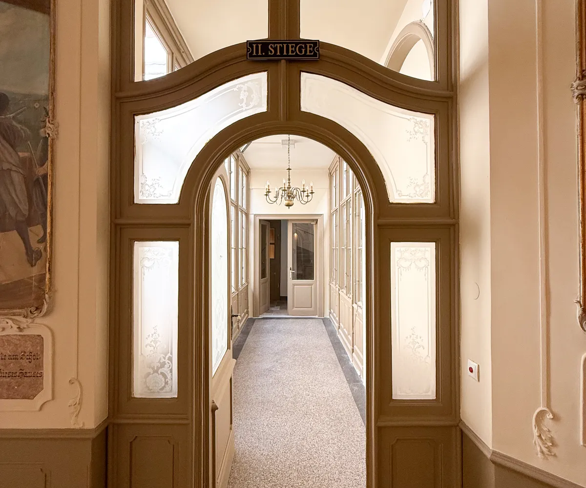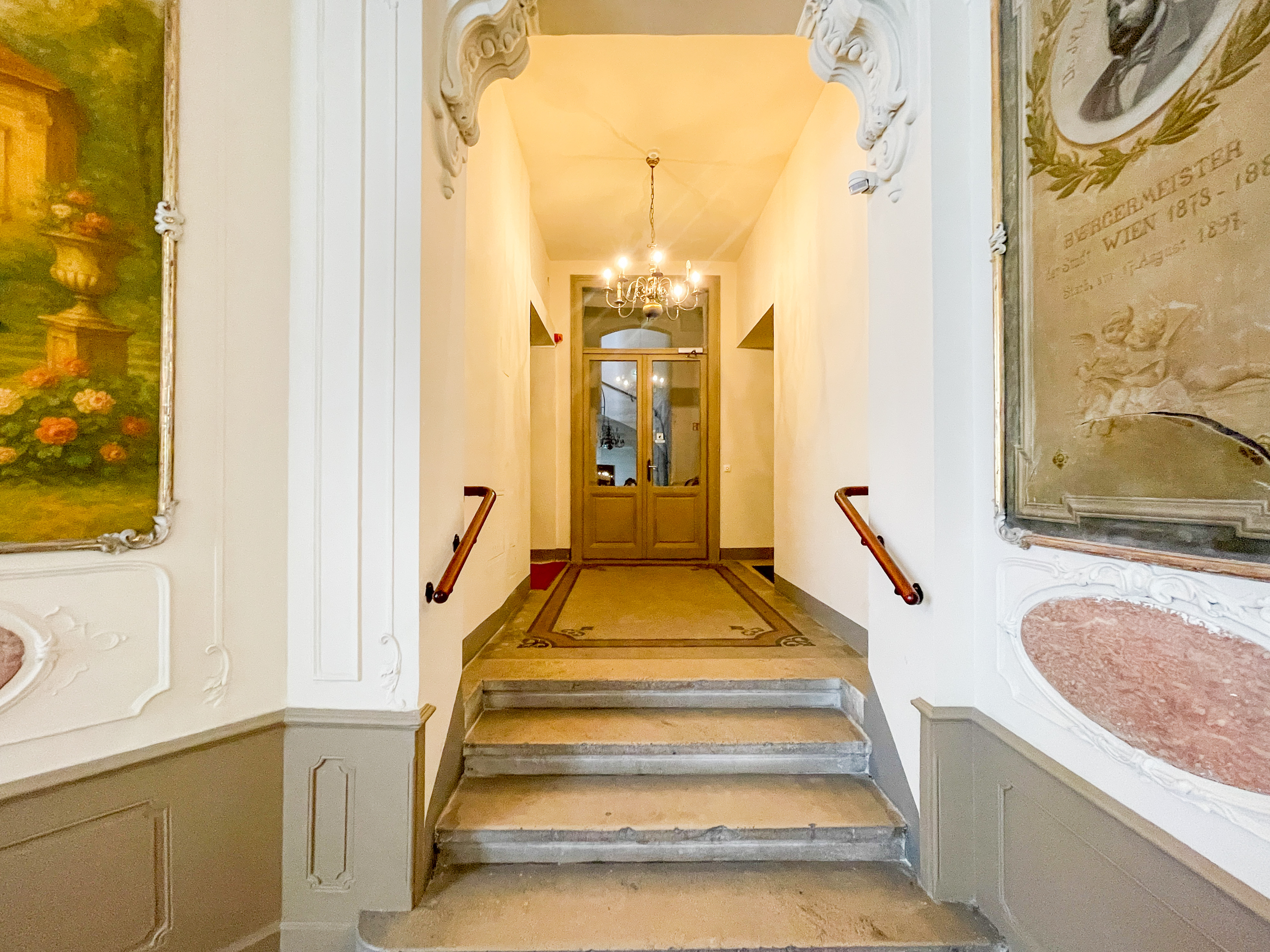 Historische Details – darunter Gemälde des Künstlers Adalbert Franz Seligmann im repräsentativen Vestibül – verleihen dem Haus eine unverwechselbare Identität.