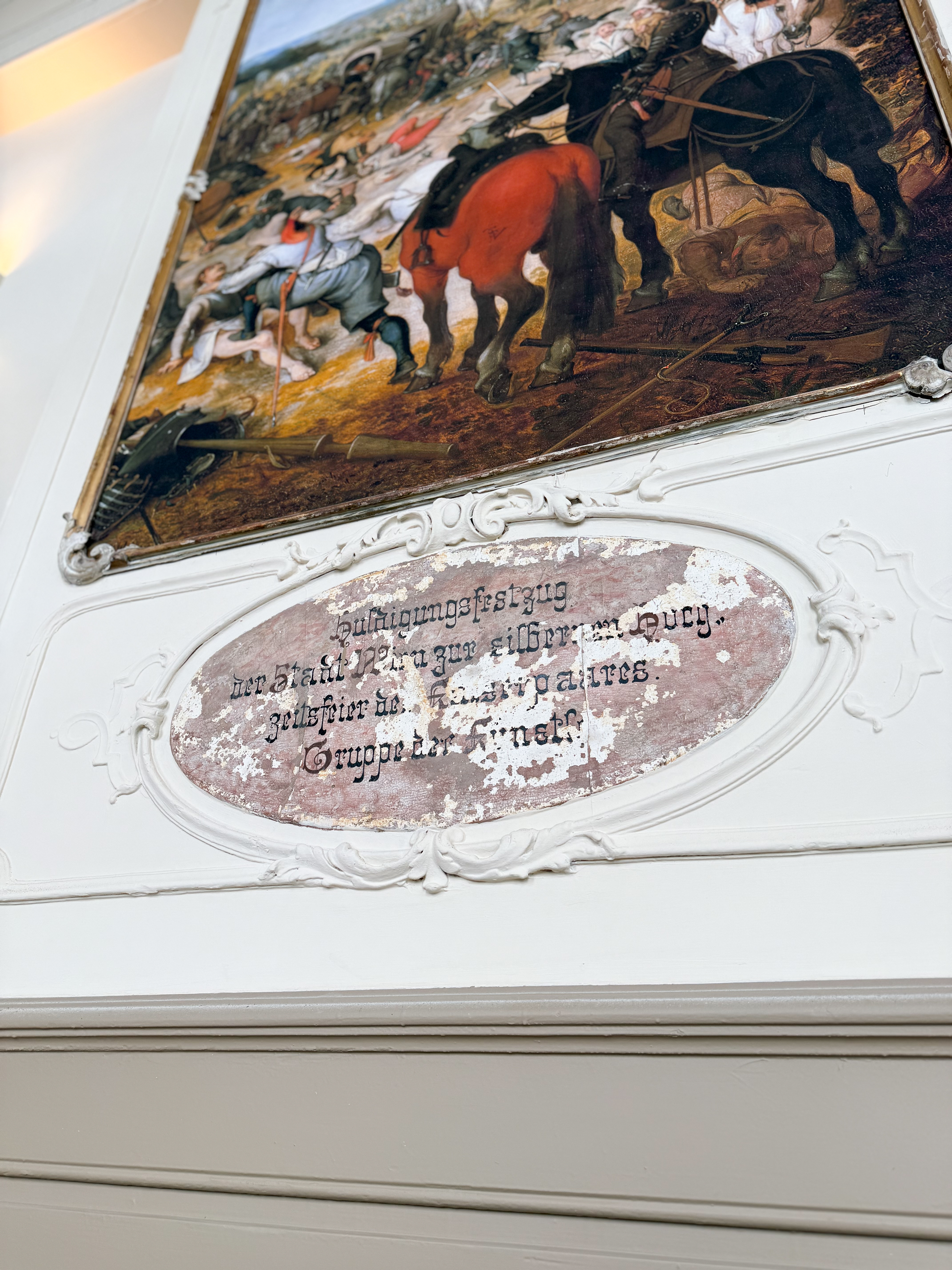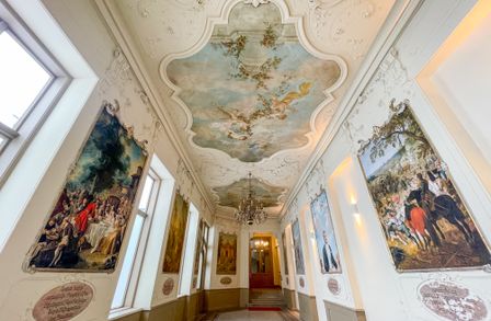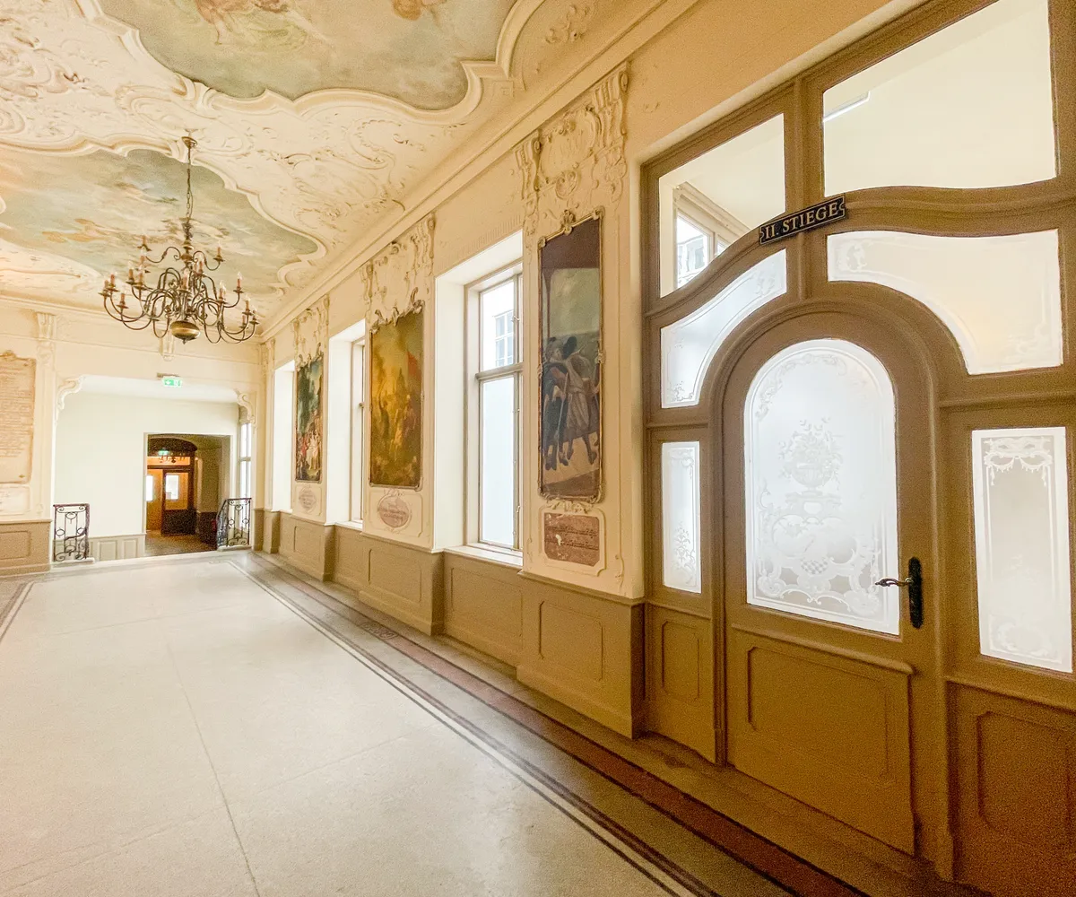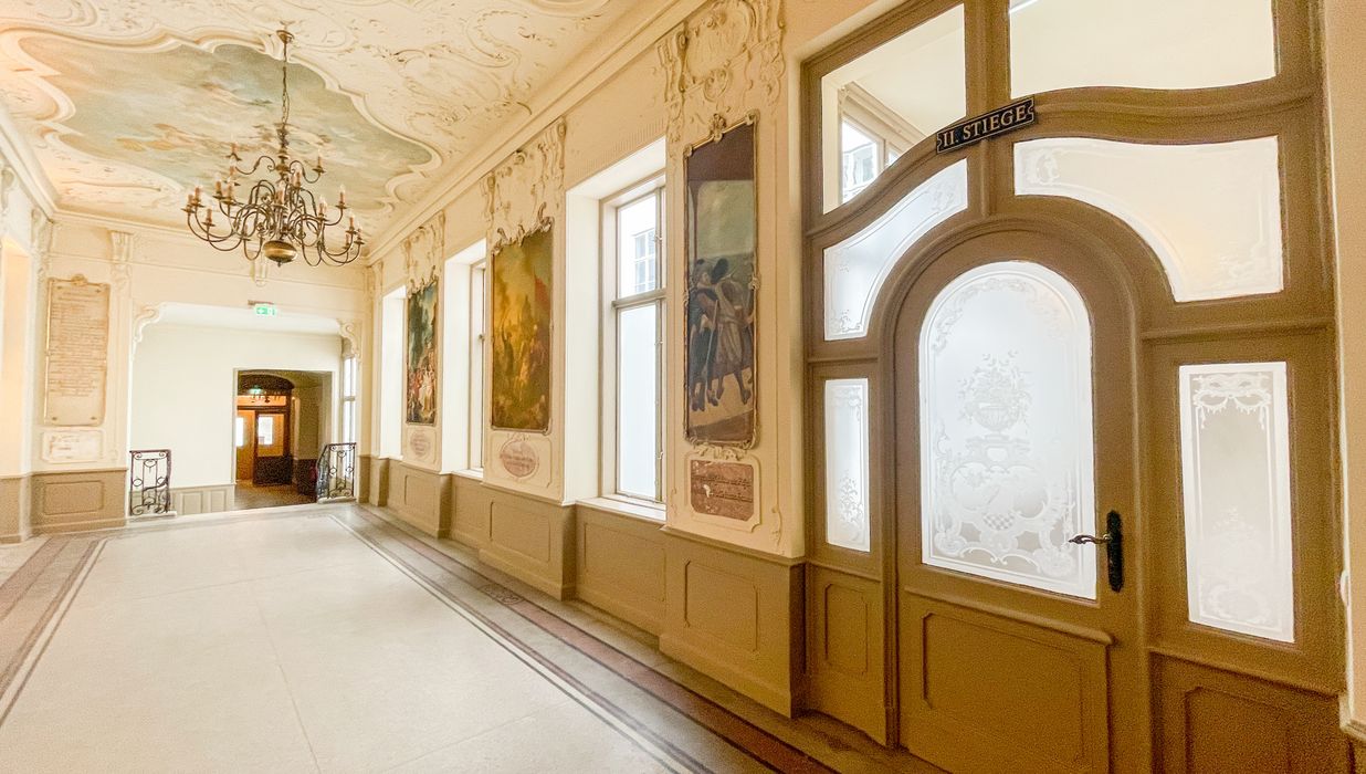 Historische Details – darunter Gemälde des Künstlers Adalbert Franz Seligmann im repräsentativen Vestibül – verleihen dem Haus eine unverwechselbare Identität.