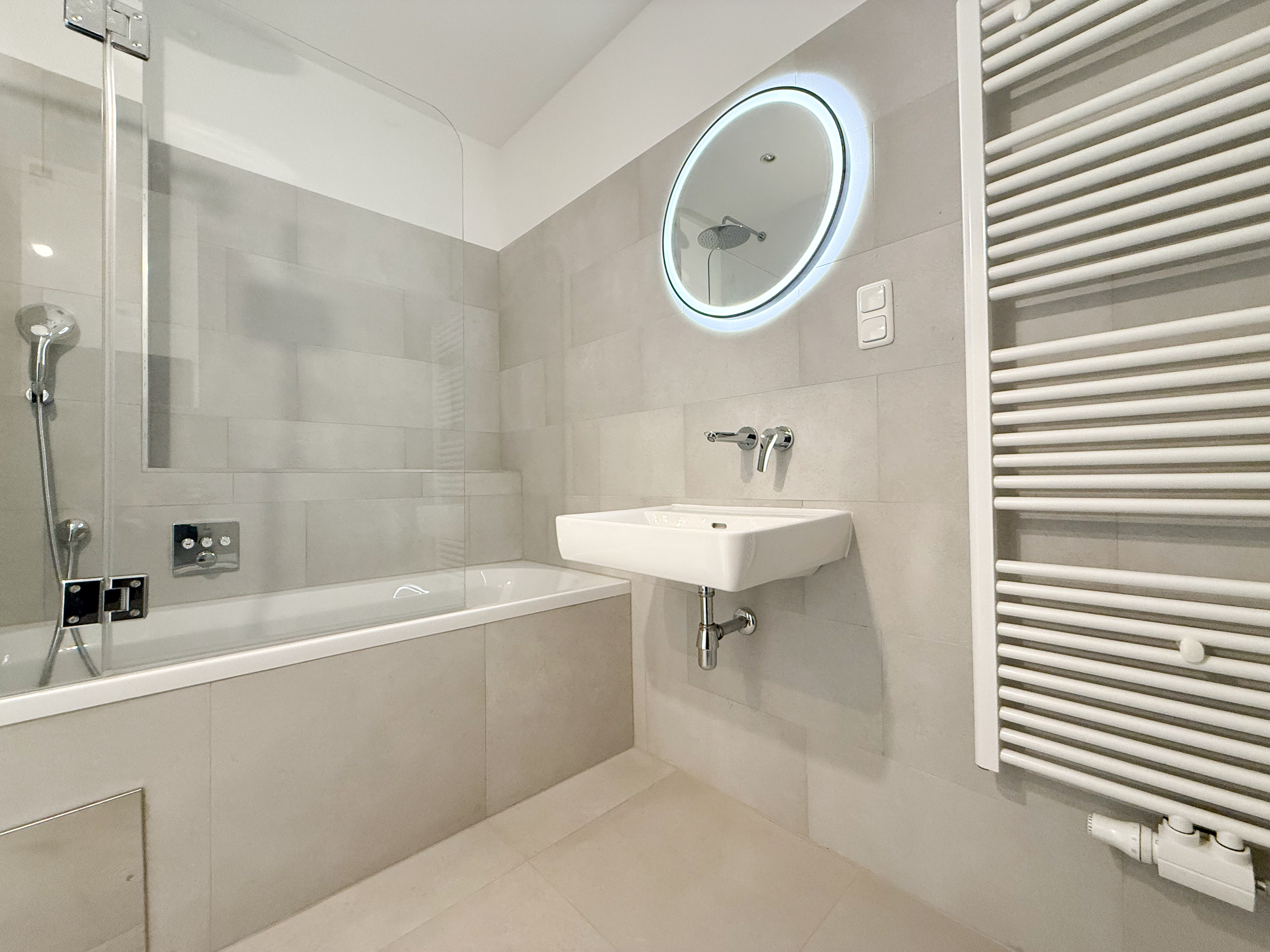 neues exklusiv saniertes Badezimmer mit Badewanne, Waschtisch, beleuchtetem Spiegel und WM-Anschluss
