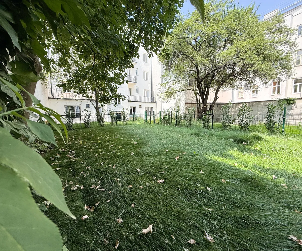 Ein besonderes Highlight der Wohnung stellt der großzügige, hofseitig ausgerichtete Garten dar. Mit einer Fläche von über 100 m² bietet dieser eine außergewöhnliche Rückzugsoase mitten in der Stadt. Die professionelle Gestaltung des Gartens vereint Ästhetik und Ruhe: Eine harmonische Bepflanzung mit Schneeballhortensien, Lavendel, Storchenschnabel und Pampasgras sorgt für ein ansprechendes Farbspiel und jahreszeitlich wechselnde Blühakzente.