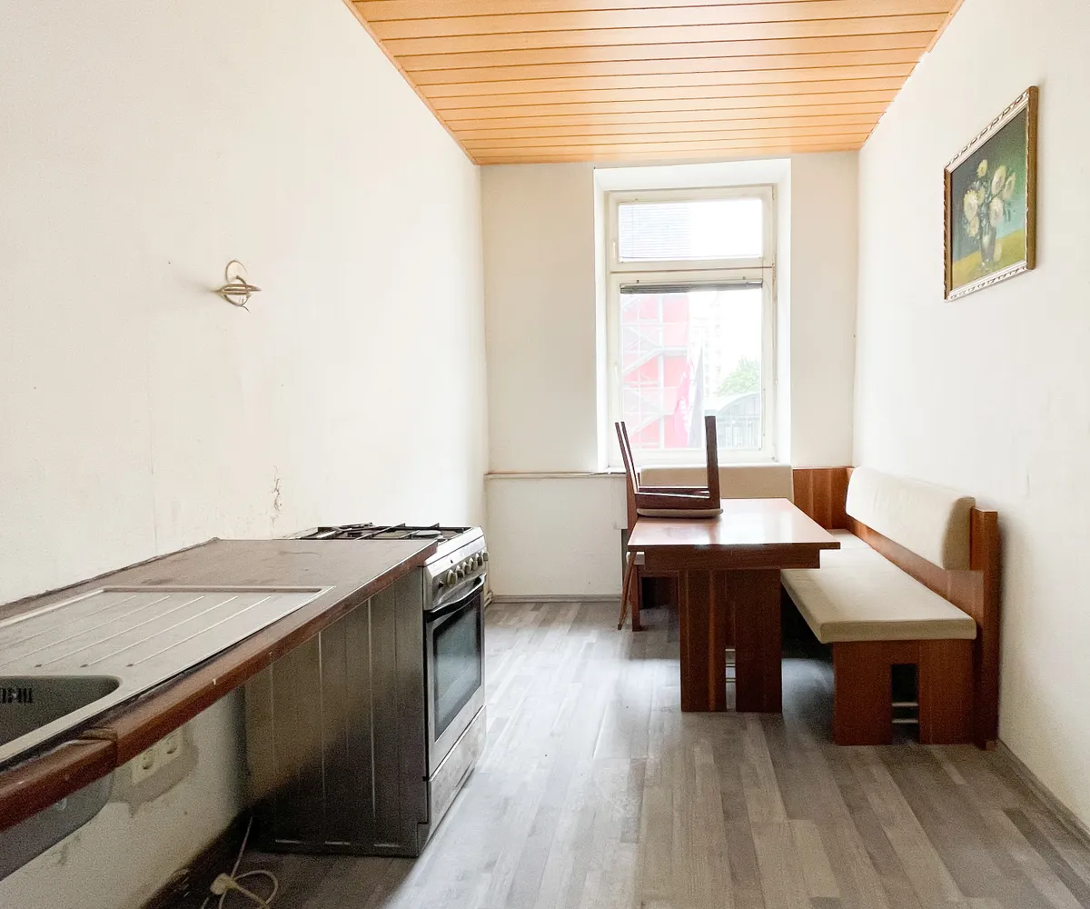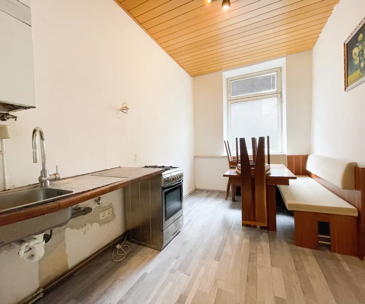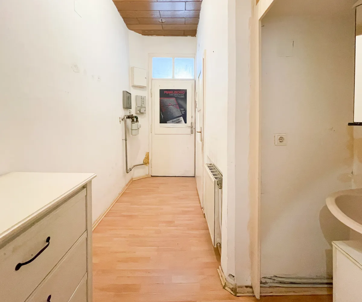Die rund 42 m² große Wohnung ist vollständig sanierungsbedürftig und bietet Ihnen die Möglichkeit, sich gestalterisch völlig frei zu entfalten. Aktuell verfügt sie über eine kleine Küche mit Essplatz, ein separates Zimmer sowie ein kompaktes Badezimmer mit WC. Das Waschbecken befindet sich derzeit im Vorraum – eine Integration in das Badezimmer ist aber grundsätzlich möglich, wie etwa bei der bereits umgebauten Top 33 im selben Haus.