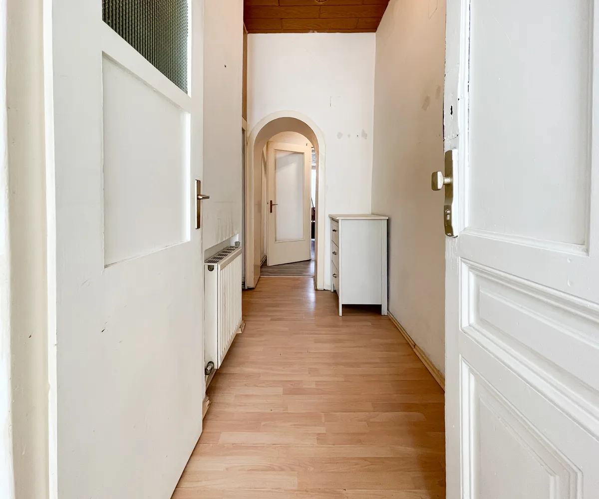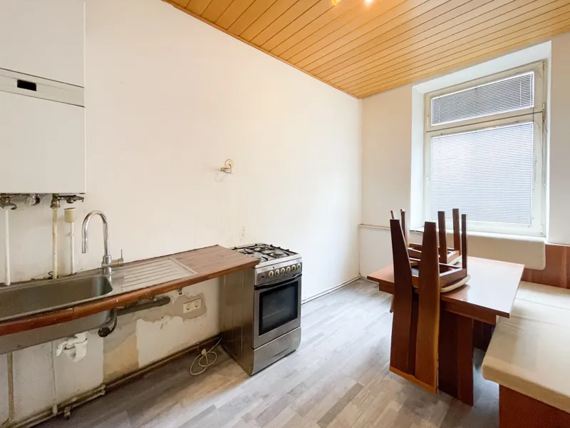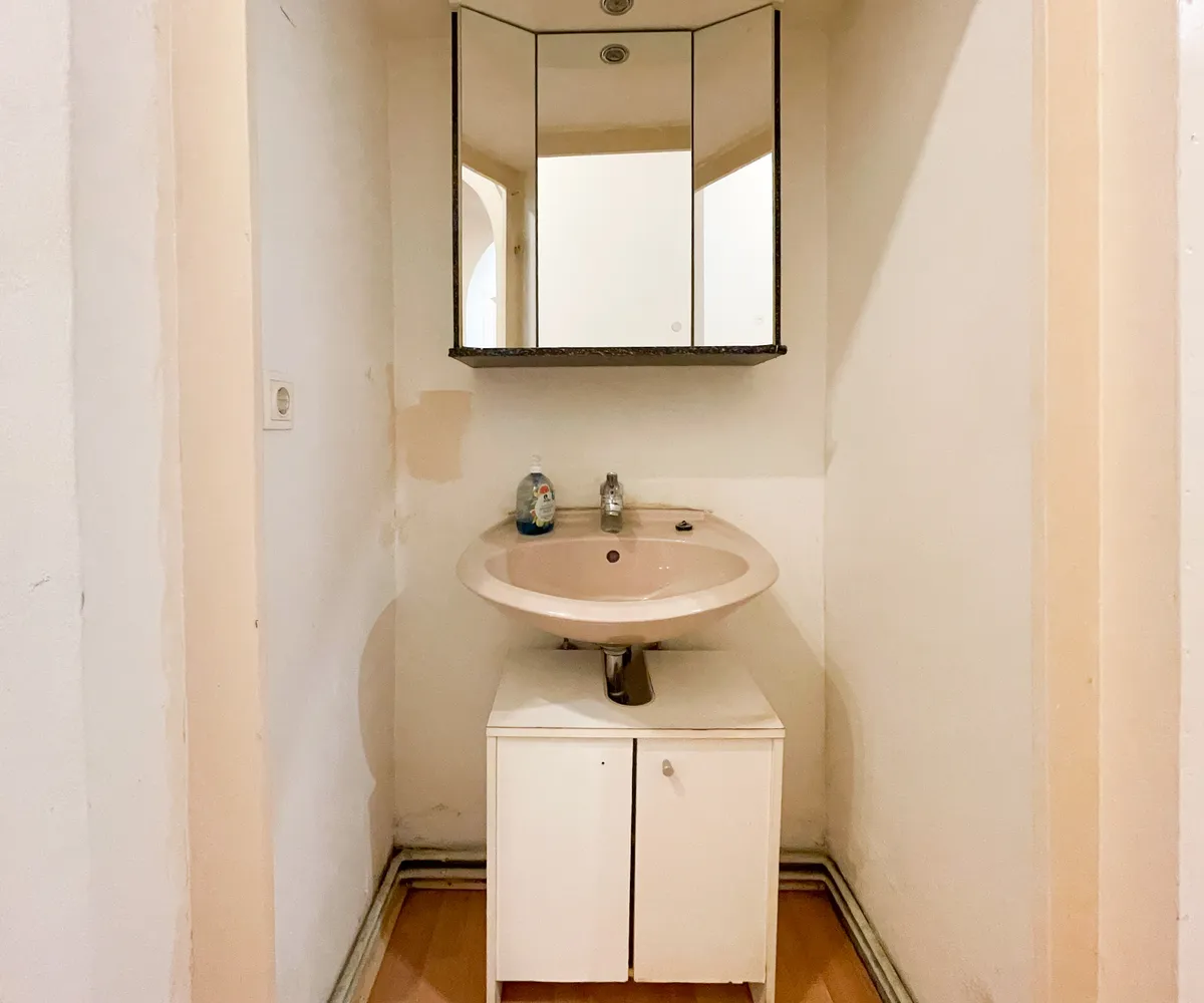 Die rund 42 m² große Wohnung ist vollständig sanierungsbedürftig und bietet Ihnen die Möglichkeit, sich gestalterisch völlig frei zu entfalten. Aktuell verfügt sie über eine kleine Küche mit Essplatz, ein separates Zimmer sowie ein kompaktes Badezimmer mit WC. Das Waschbecken befindet sich derzeit im Vorraum – eine Integration in das Badezimmer ist aber grundsätzlich möglich, wie etwa bei der bereits umgebauten Top 33 im selben Haus.