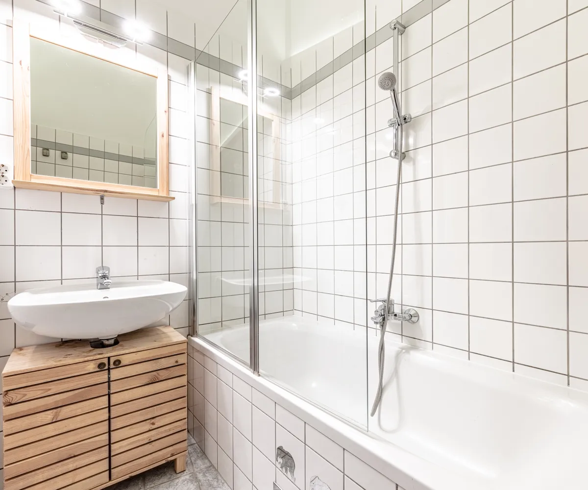 Badezimmer mit Badewanne und Waschmaschinenanschluss
