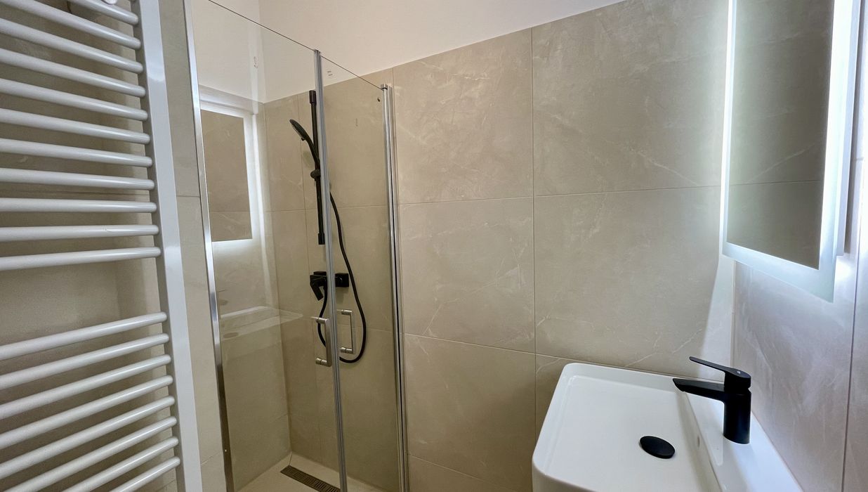 modernes Badezimmer mit bodenebener Dusche, beleuchtetem Spiegel und hochwertigen Armaturen
