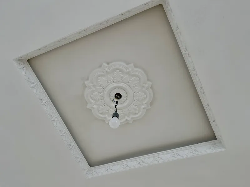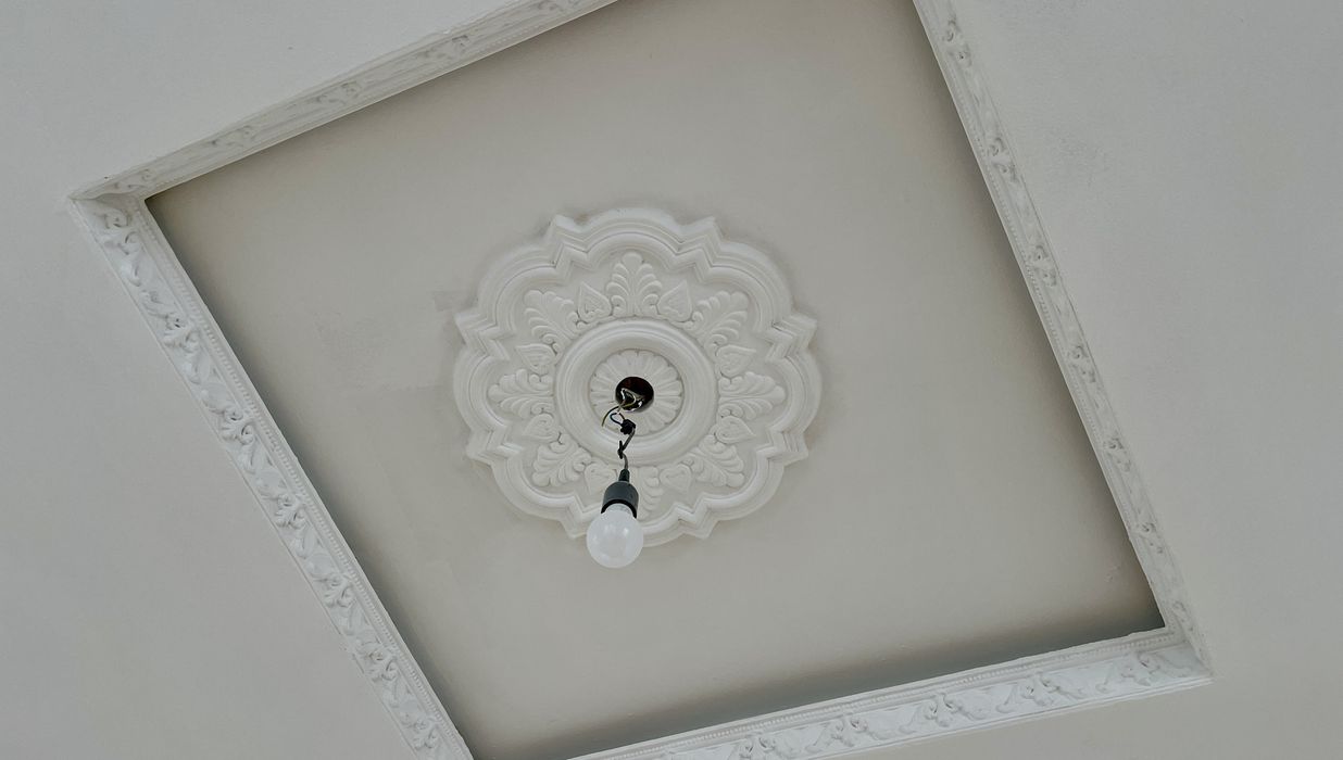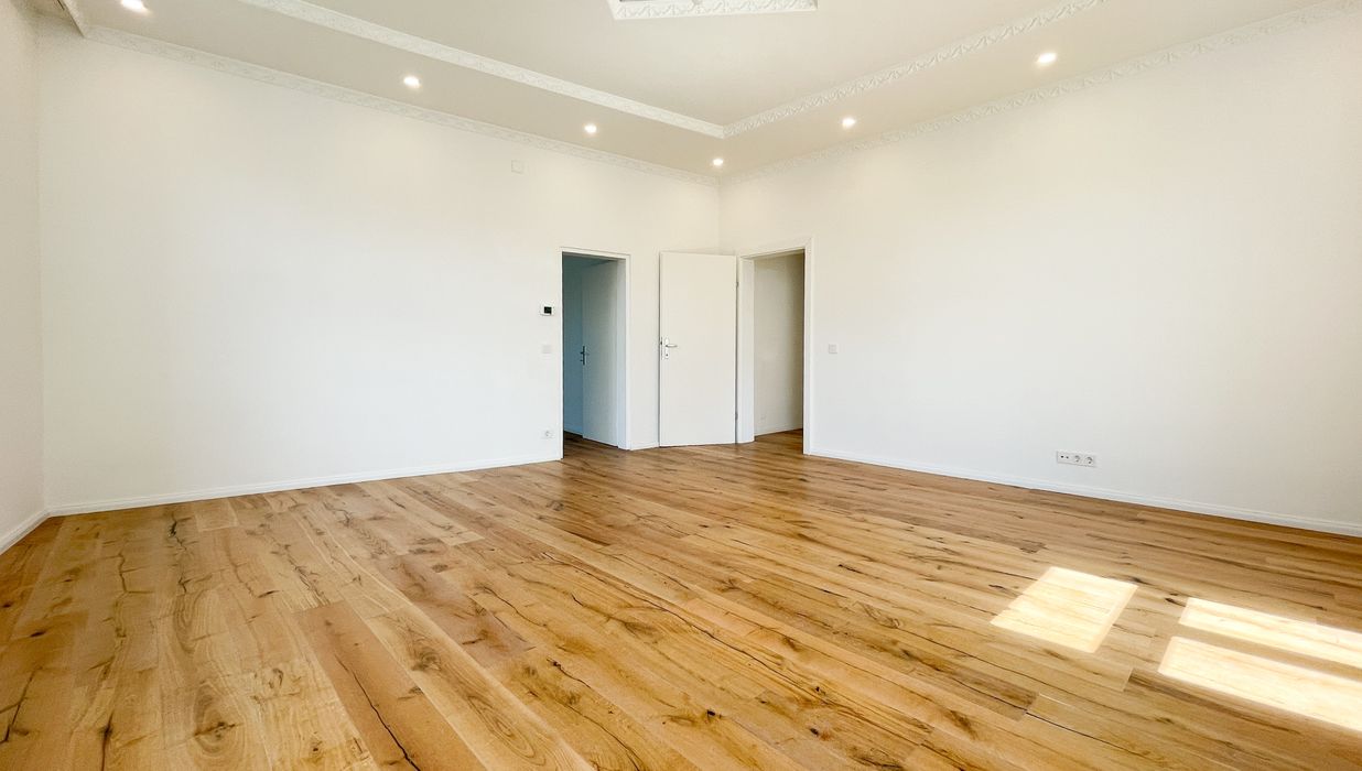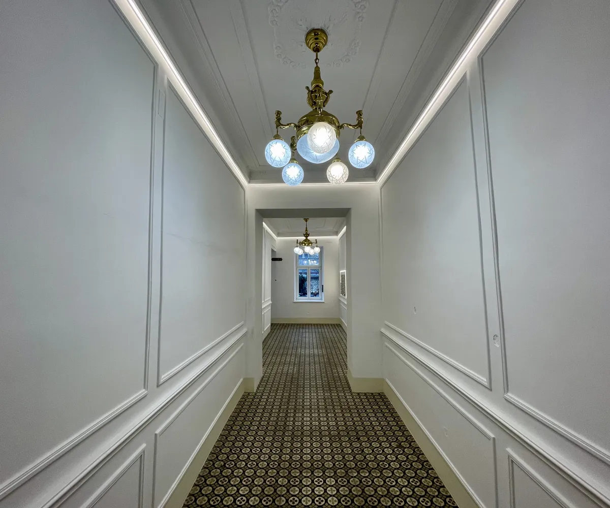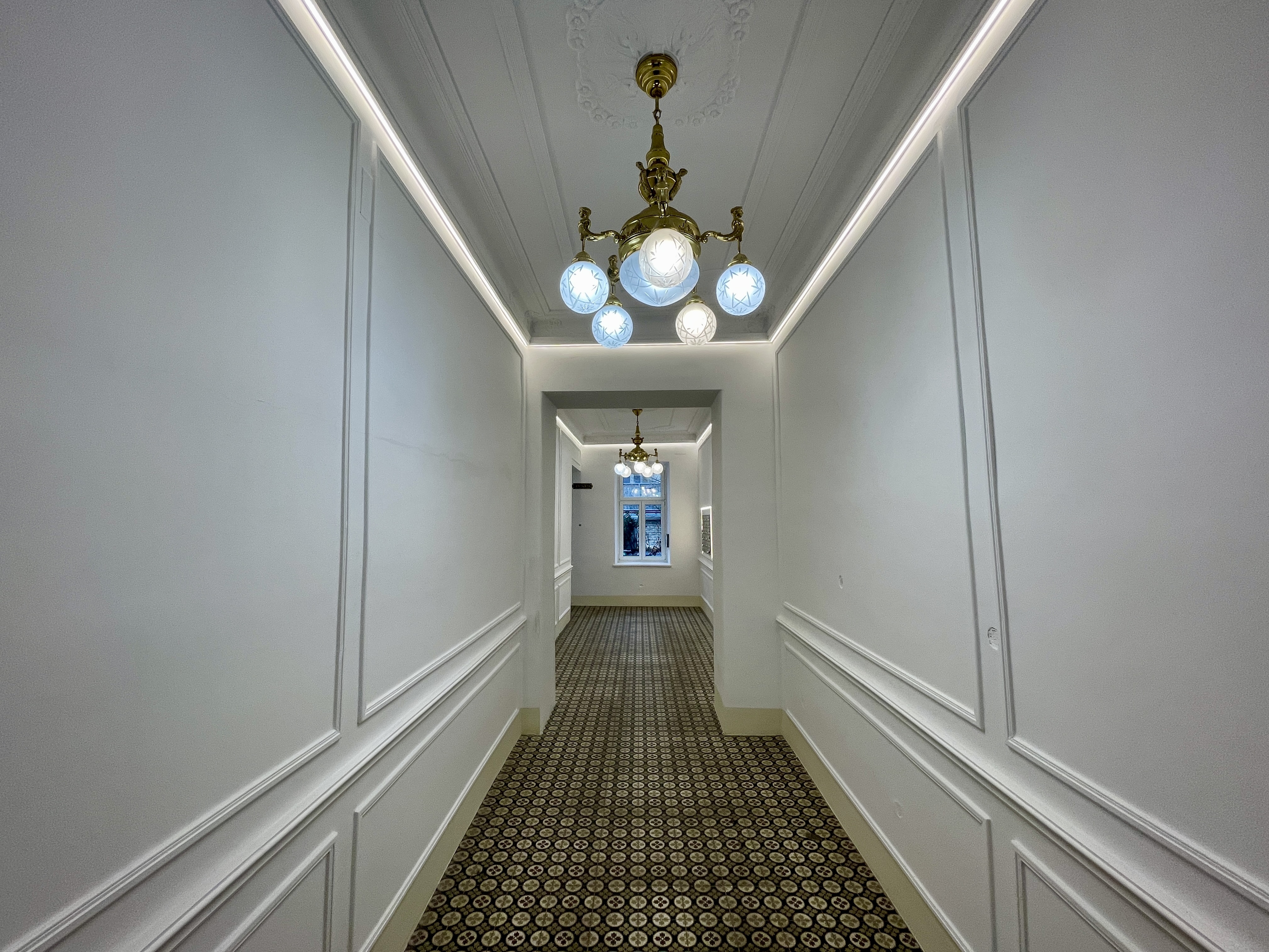 Typische Altbau-Elemente wie elegante Stuckdecken, die durch neue Deckenleuchten stilvoll hervorgehoben werden
