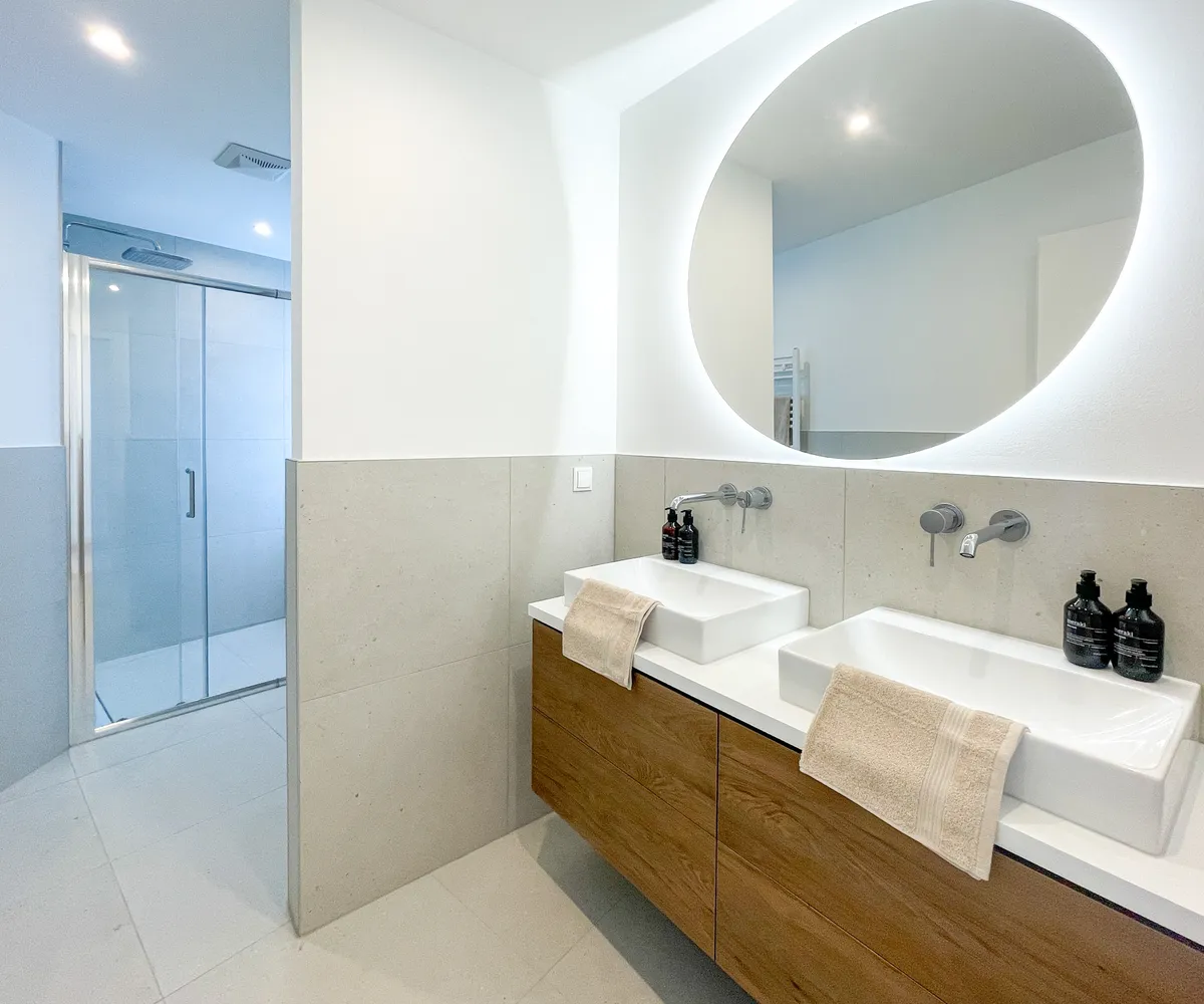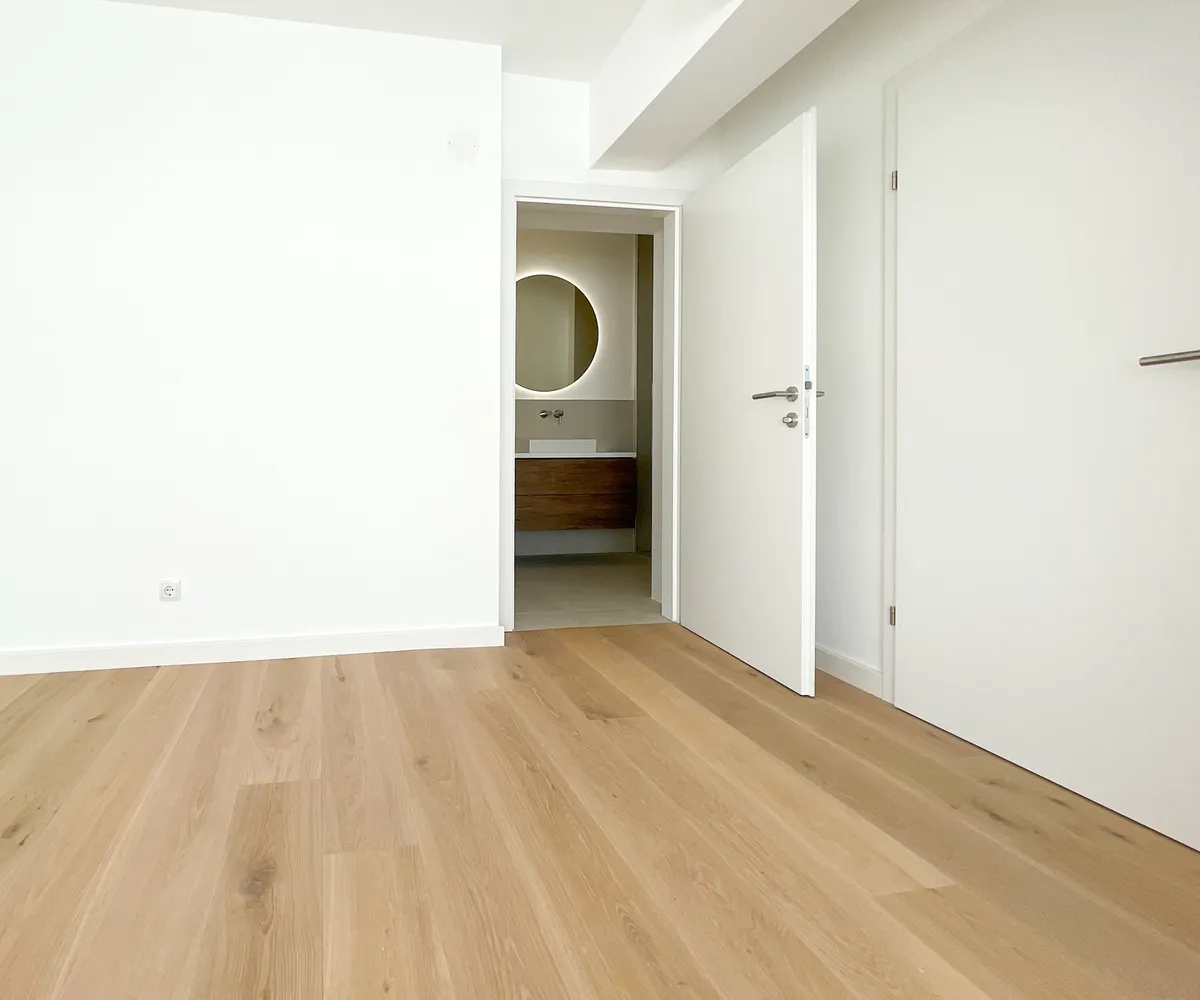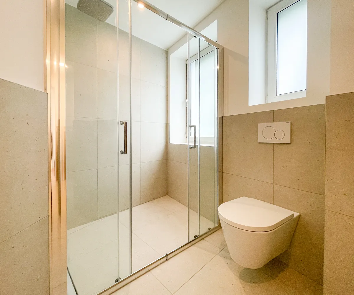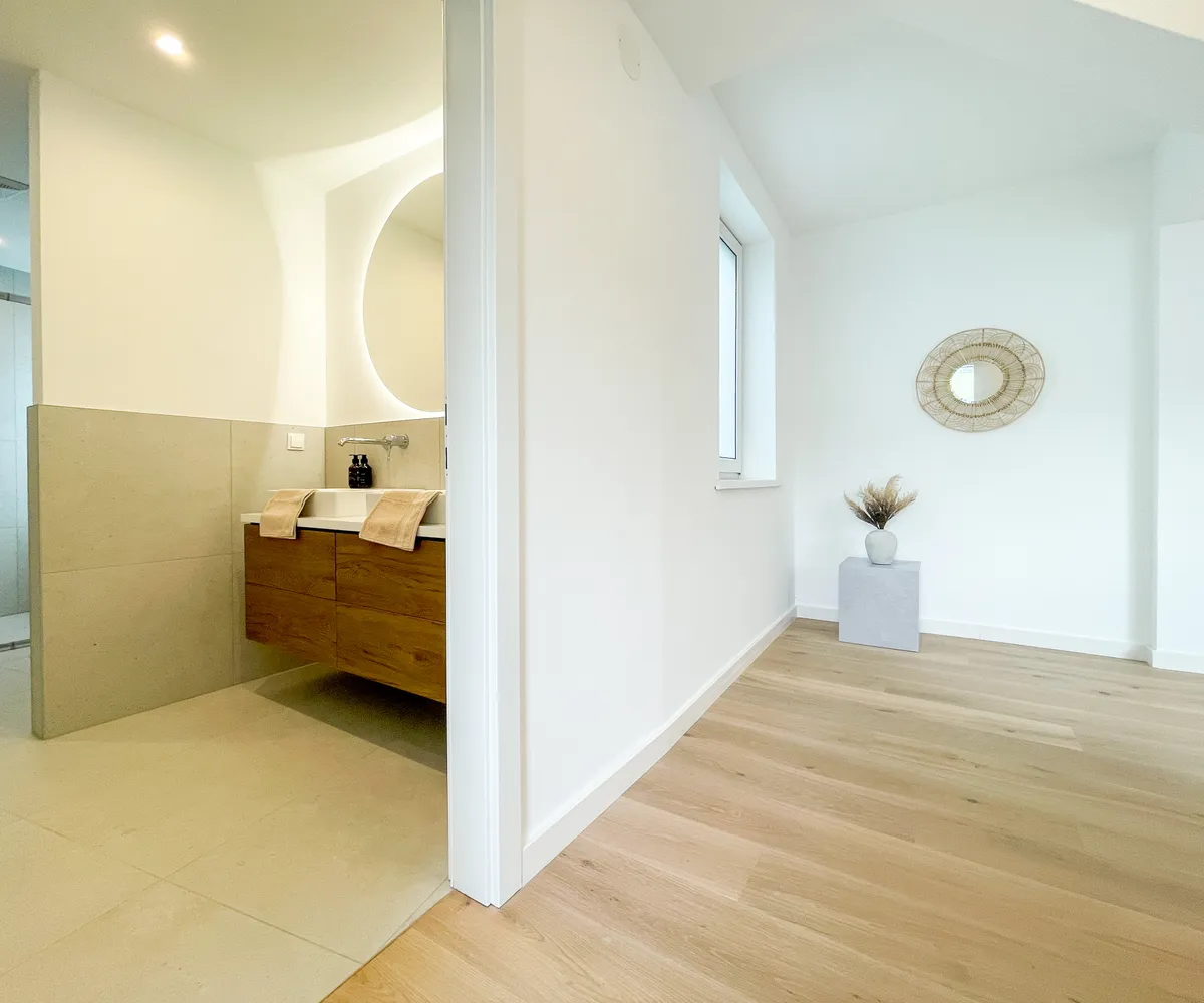 Das große Badezimmer ist mit einem Doppelwaschbecken, einer Dusche und einer Toilette ausgestattet und grenzt direkt an das Schlafzimmer. Eine zusätzliche separate Toilette, die vom Flur aus zugänglich ist, bietet zusätzlichen Komfort und Privatsphäre. Die doppelt verglasten Fenster sorgen für eine ruhige und angenehme Atmosphäre.