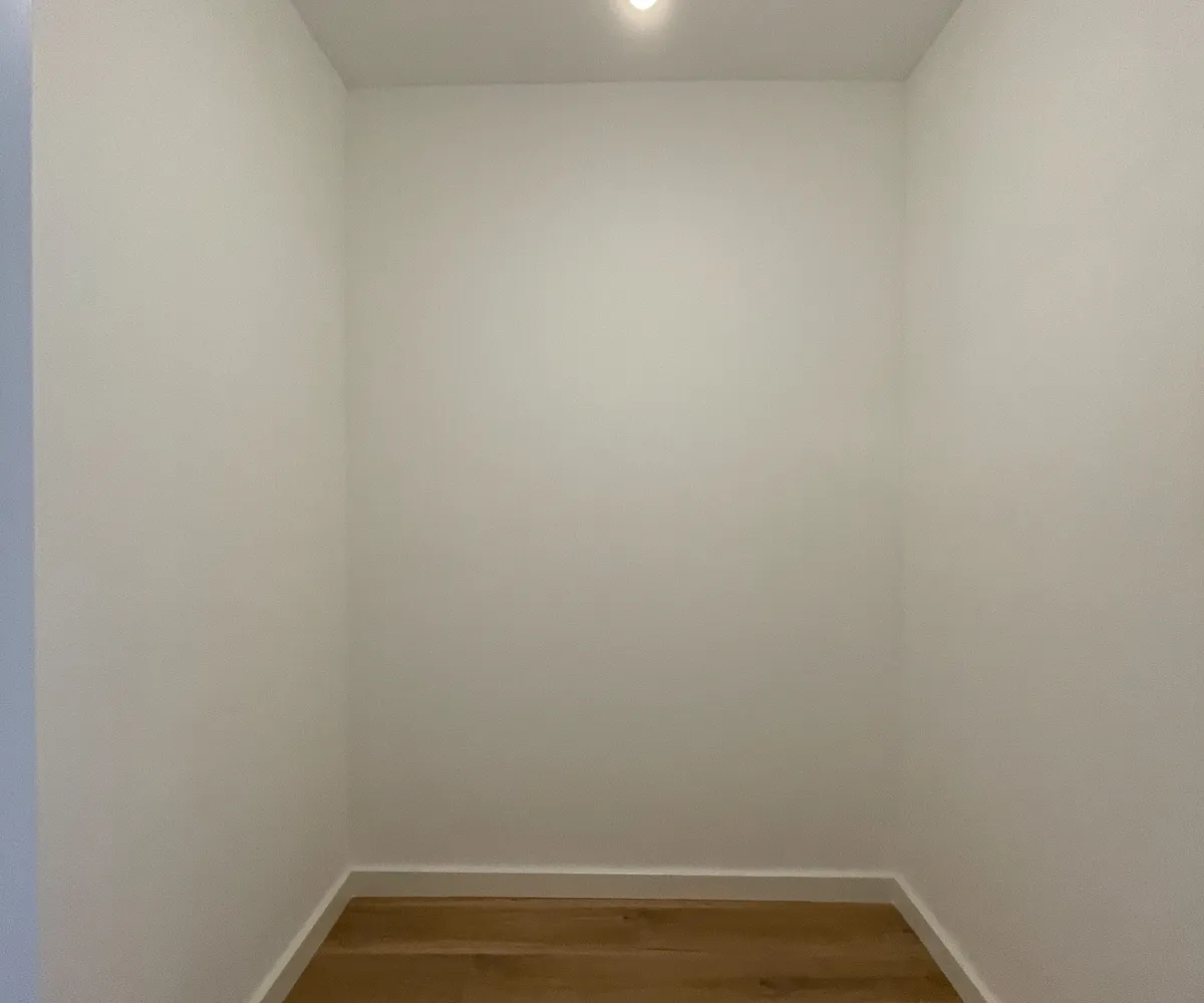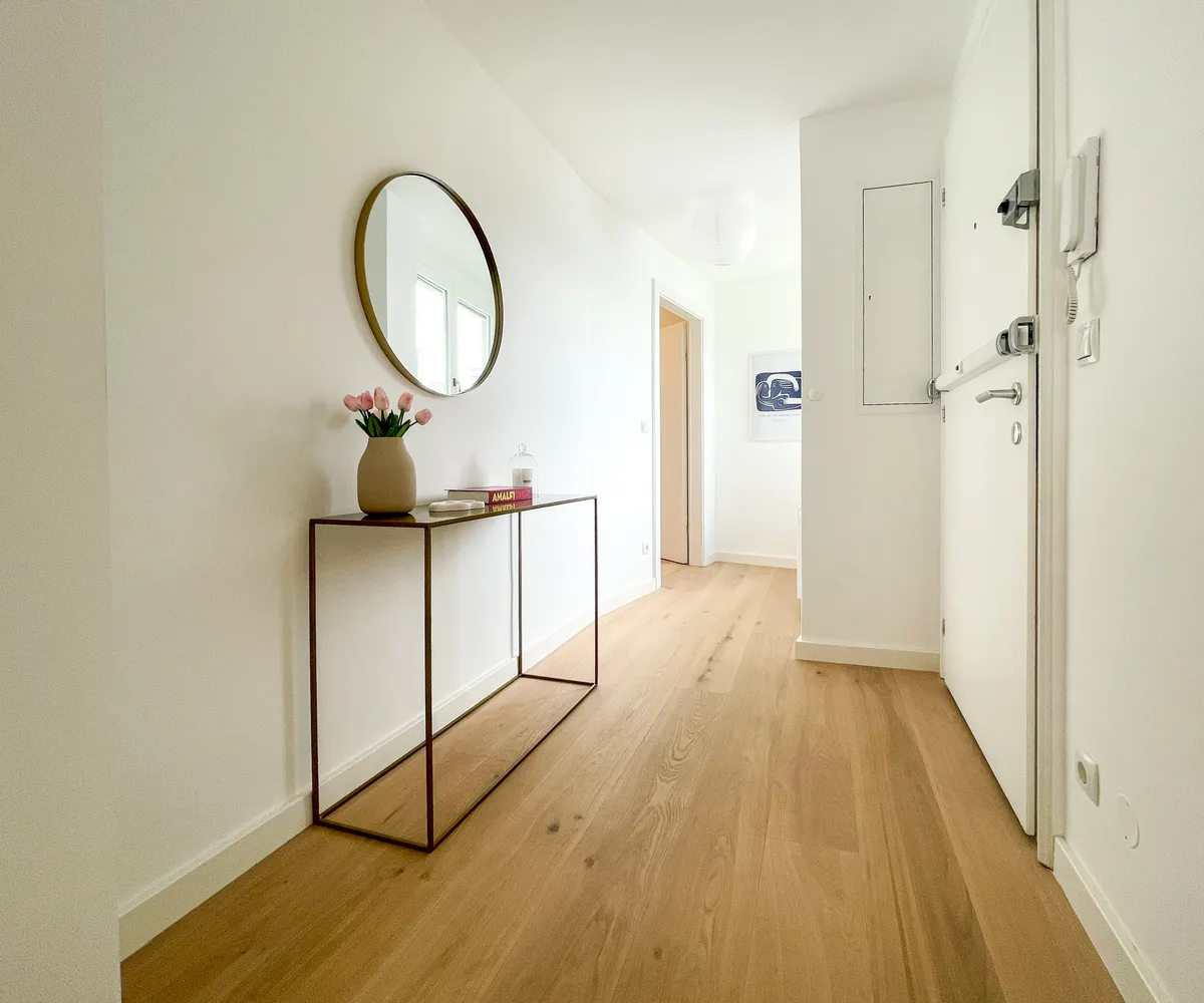Die durchdachte Raumaufteilung und die hohe Decke bieten ausreichend Platz für praktischen Stauraum.
