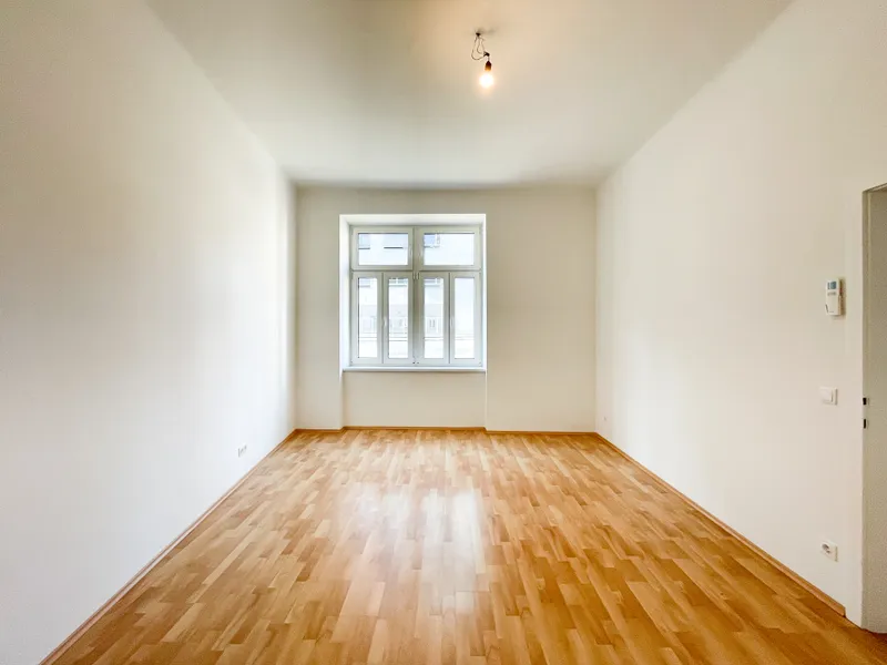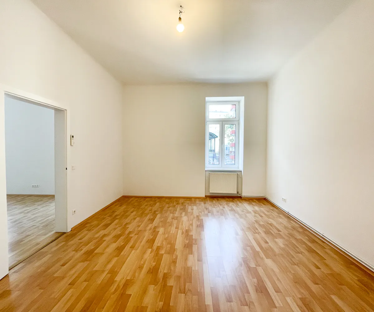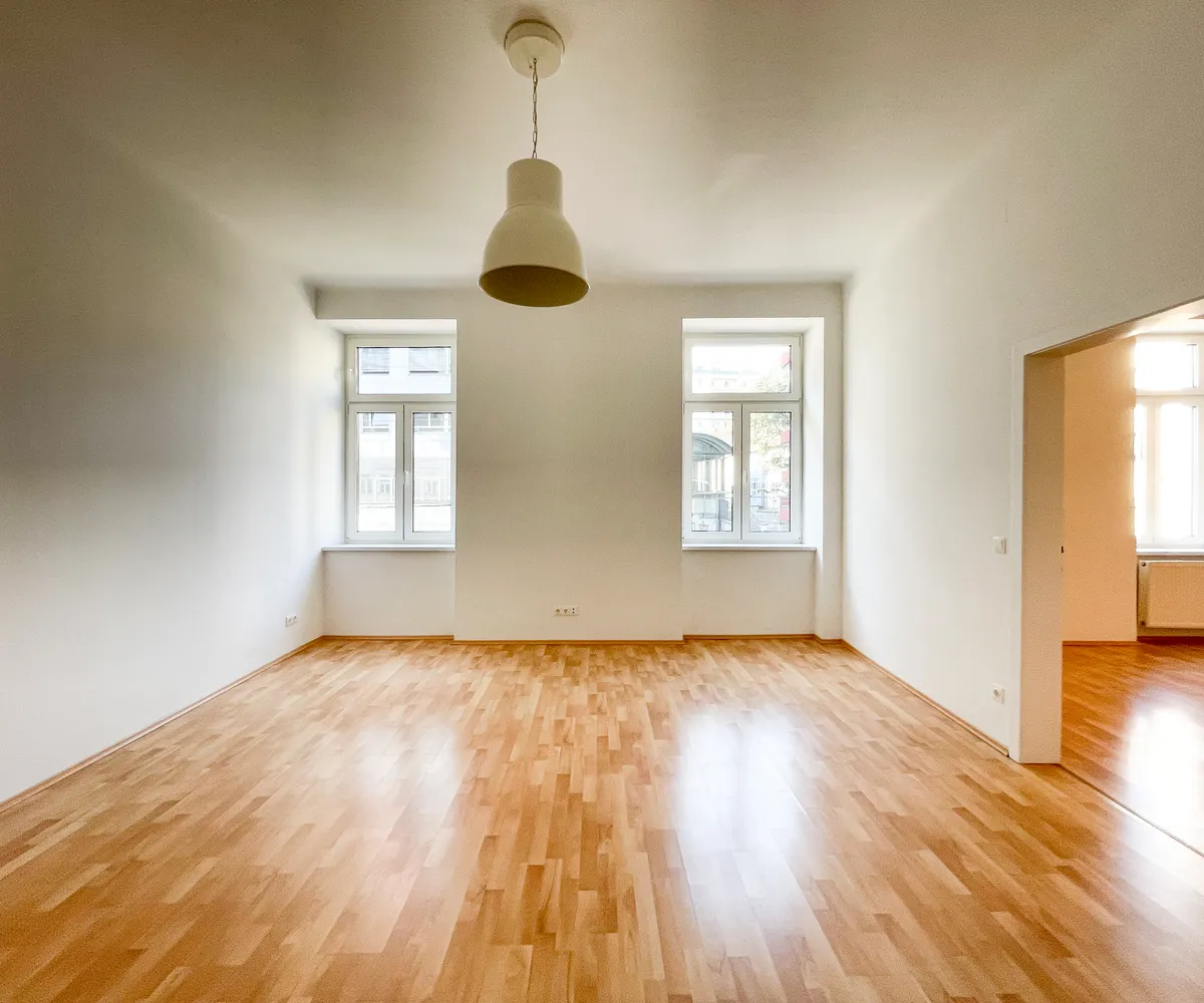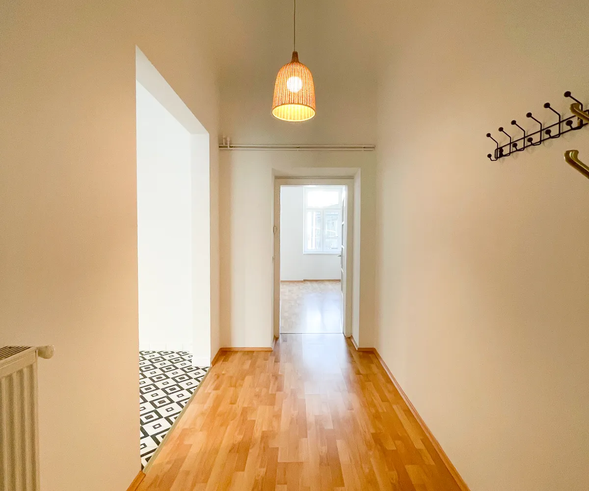 Die Wohnung liegt im Mezzanin eines Altbaus mit glatter Fassade, direkt gegenüber der U3 Station Schlachthausgasse.